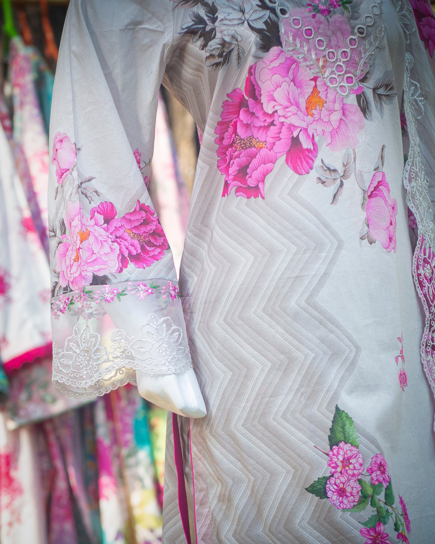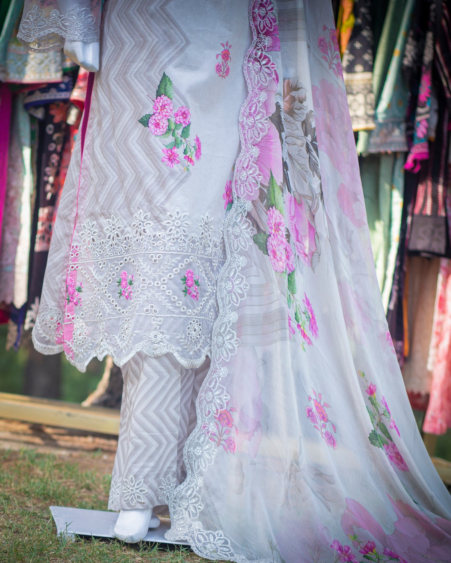 Step into refined elegance with this 3-piece ensemble from the Bobrai Collection by Charizma. The set features a beautifully crafted light grey chikankari lawn shirt, adorned with intricate full embroidery and elegant cutwork detailing, offering a sophisticated and timeless appeal.