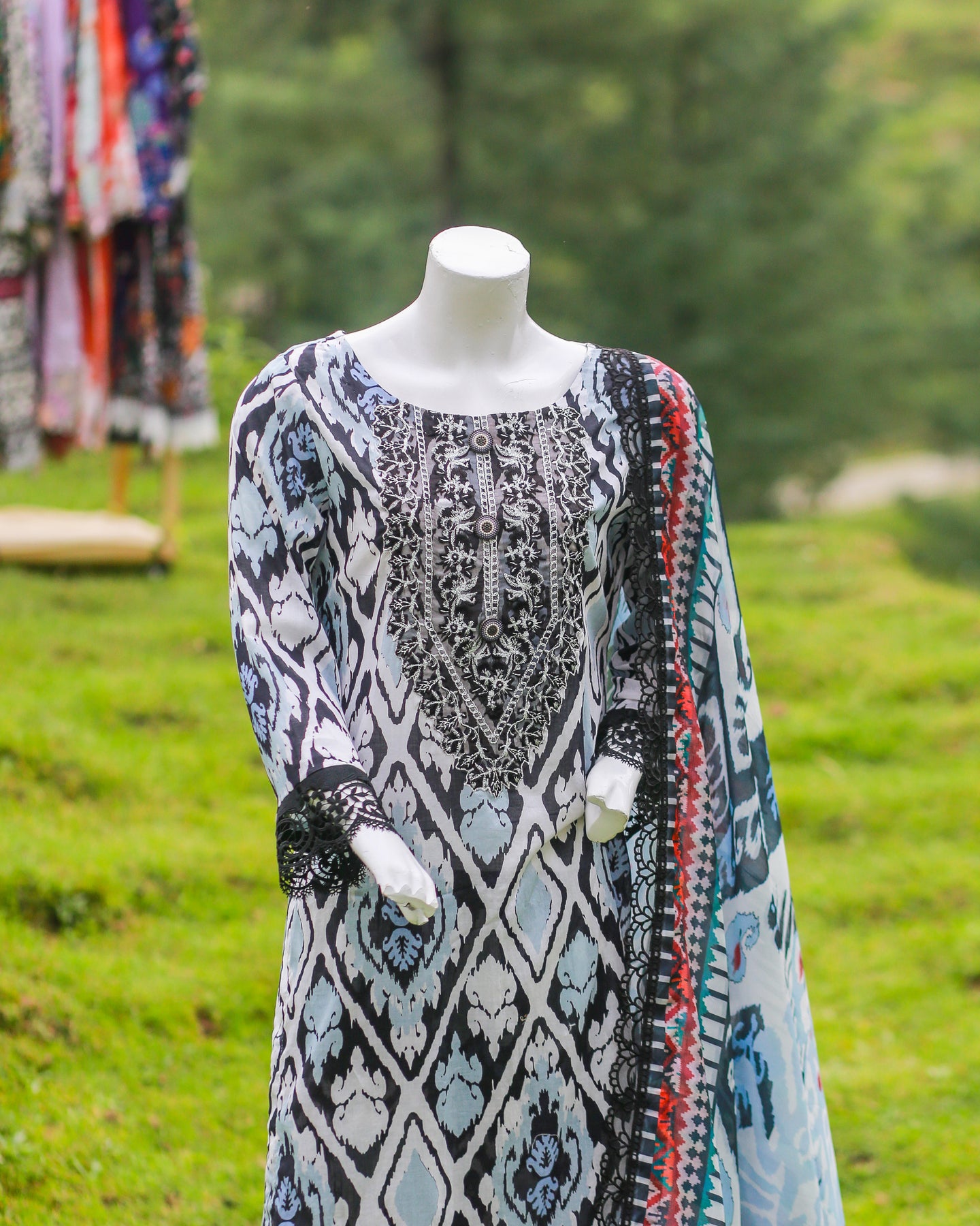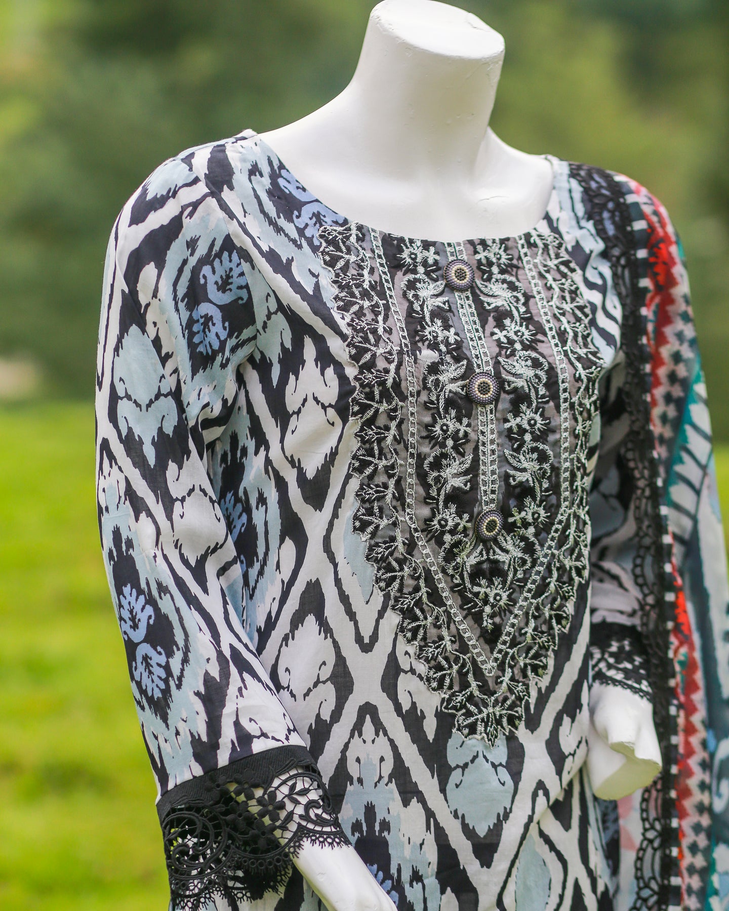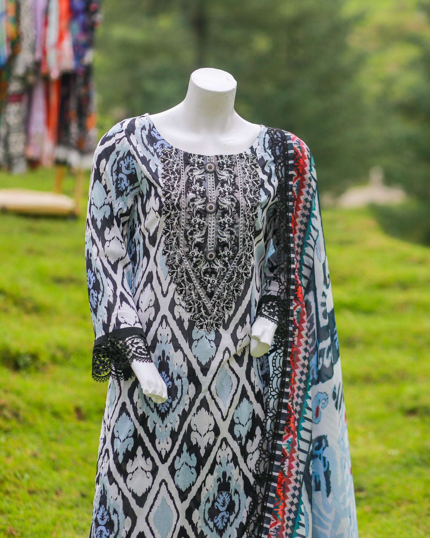 Add a touch of sophistication to your wardrobe with this 3-piece black and white ensemble from Asifa & Nabeel. The printed lawn shirt is enhanced with elegant embroidery and milky lace detailing, creating a refined and timeless look.