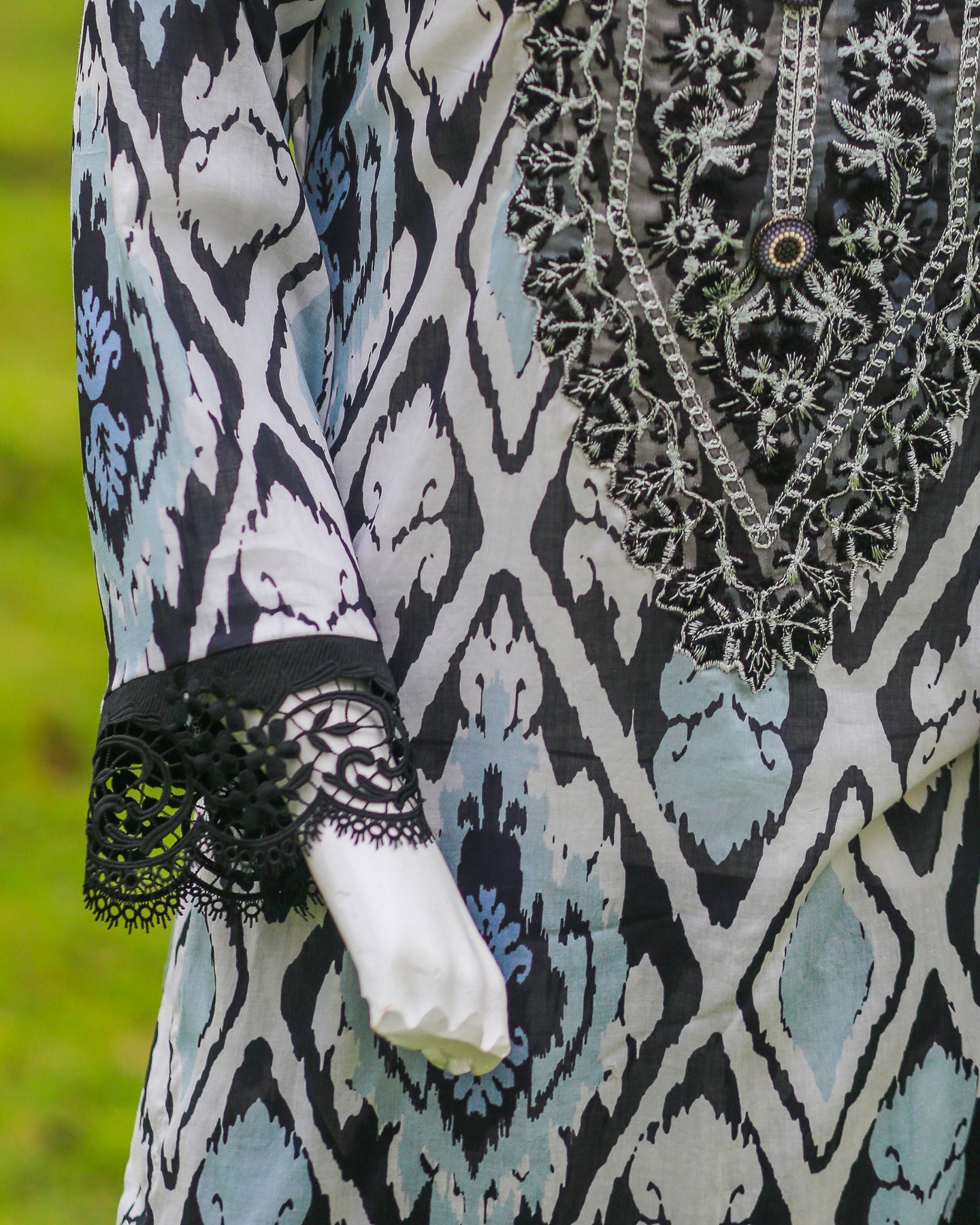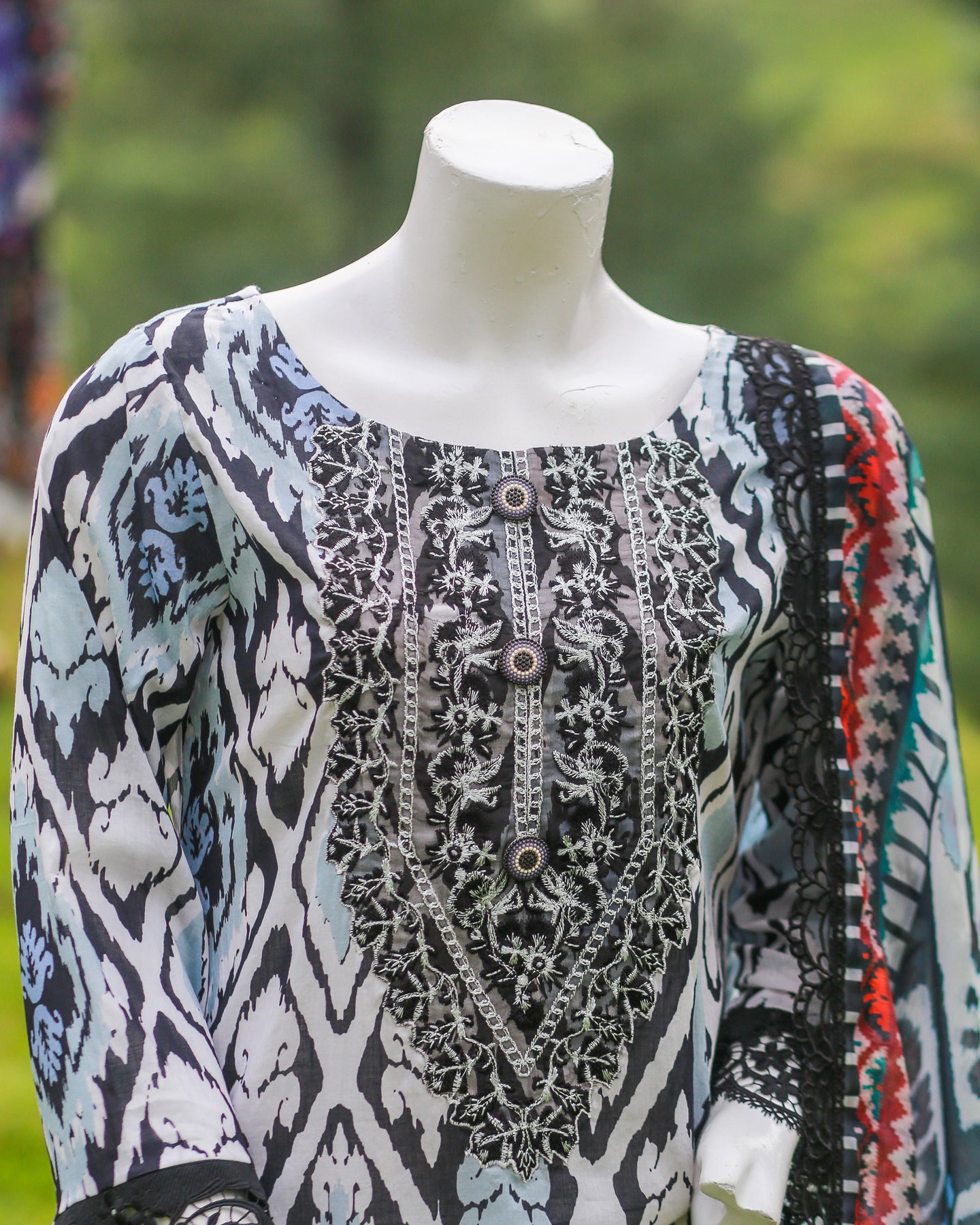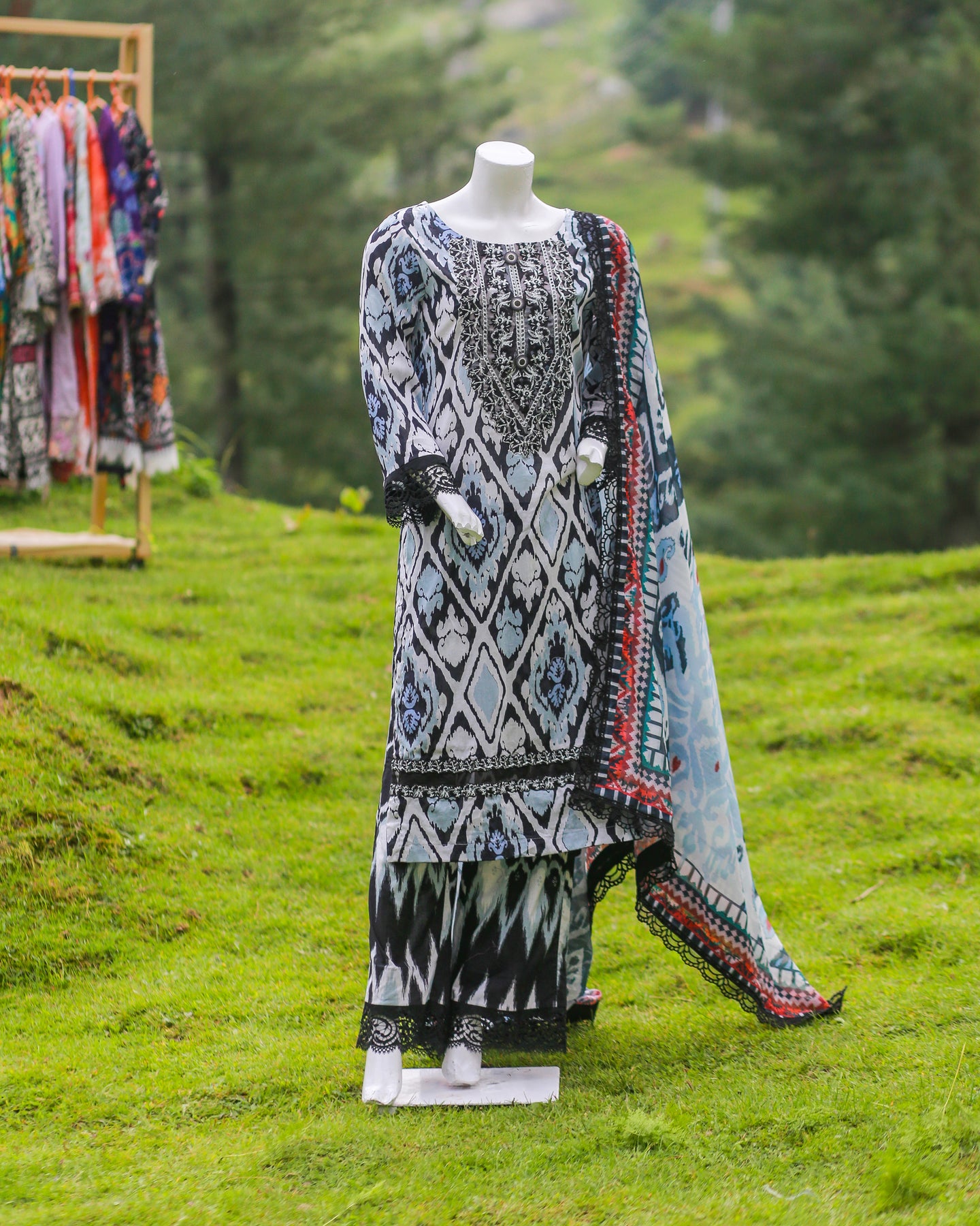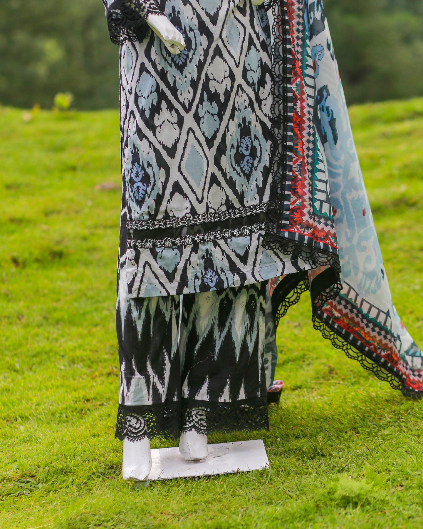 Add a touch of sophistication to your wardrobe with this 3-piece black and white ensemble from Asifa & Nabeel. The printed lawn shirt is enhanced with elegant embroidery and milky lace detailing, creating a refined and timeless look.
