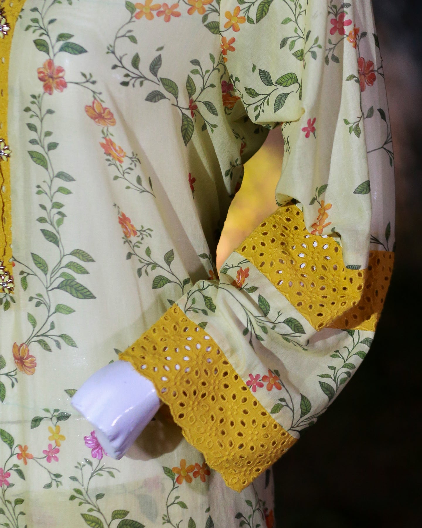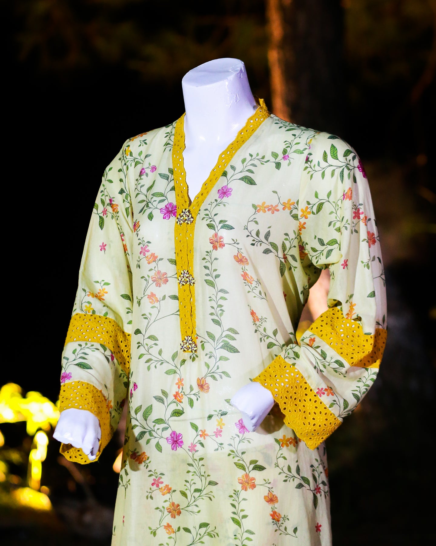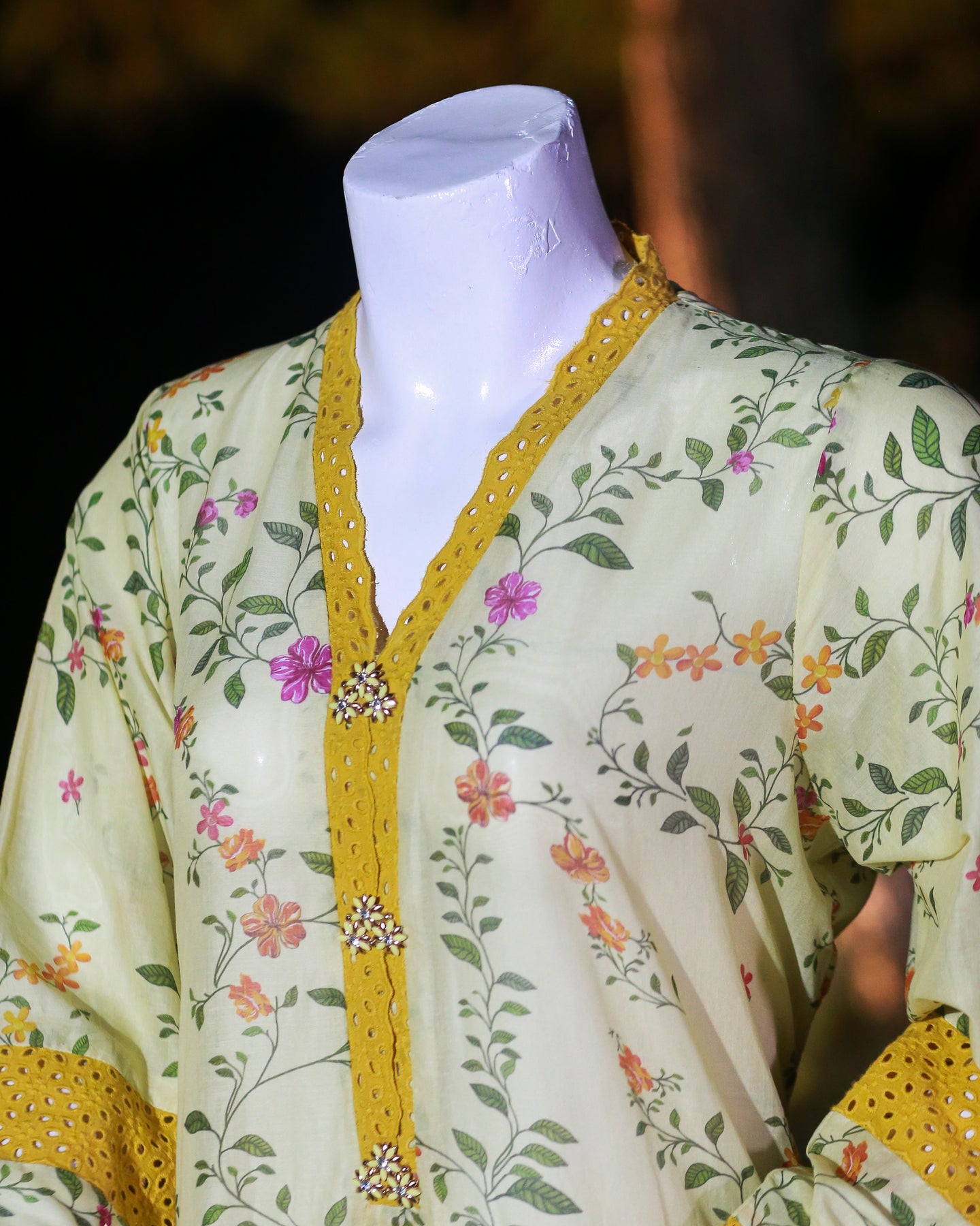 • 🧵 Shirt Fabric: Lawn (Floral printed with chikankari patches & buttons)