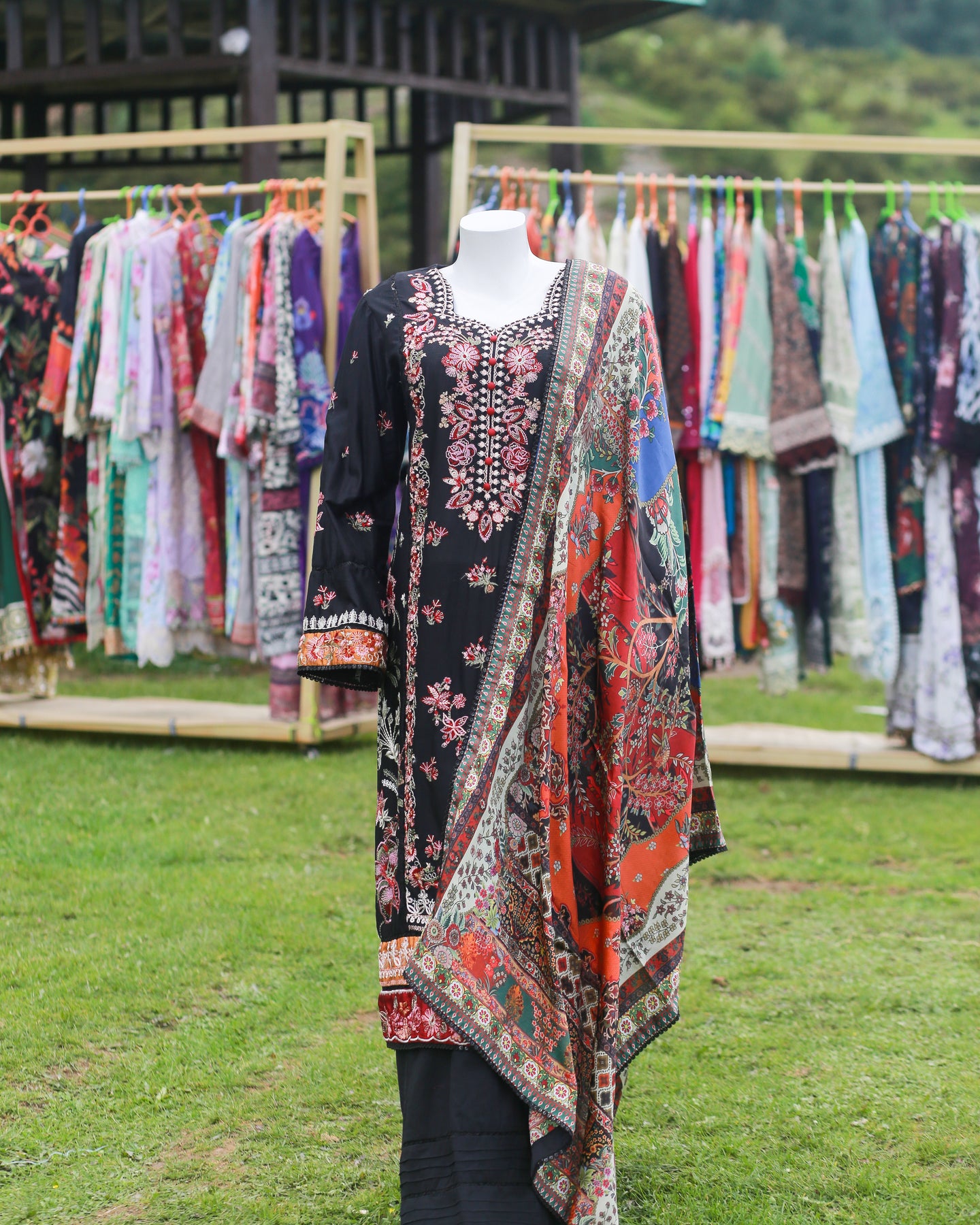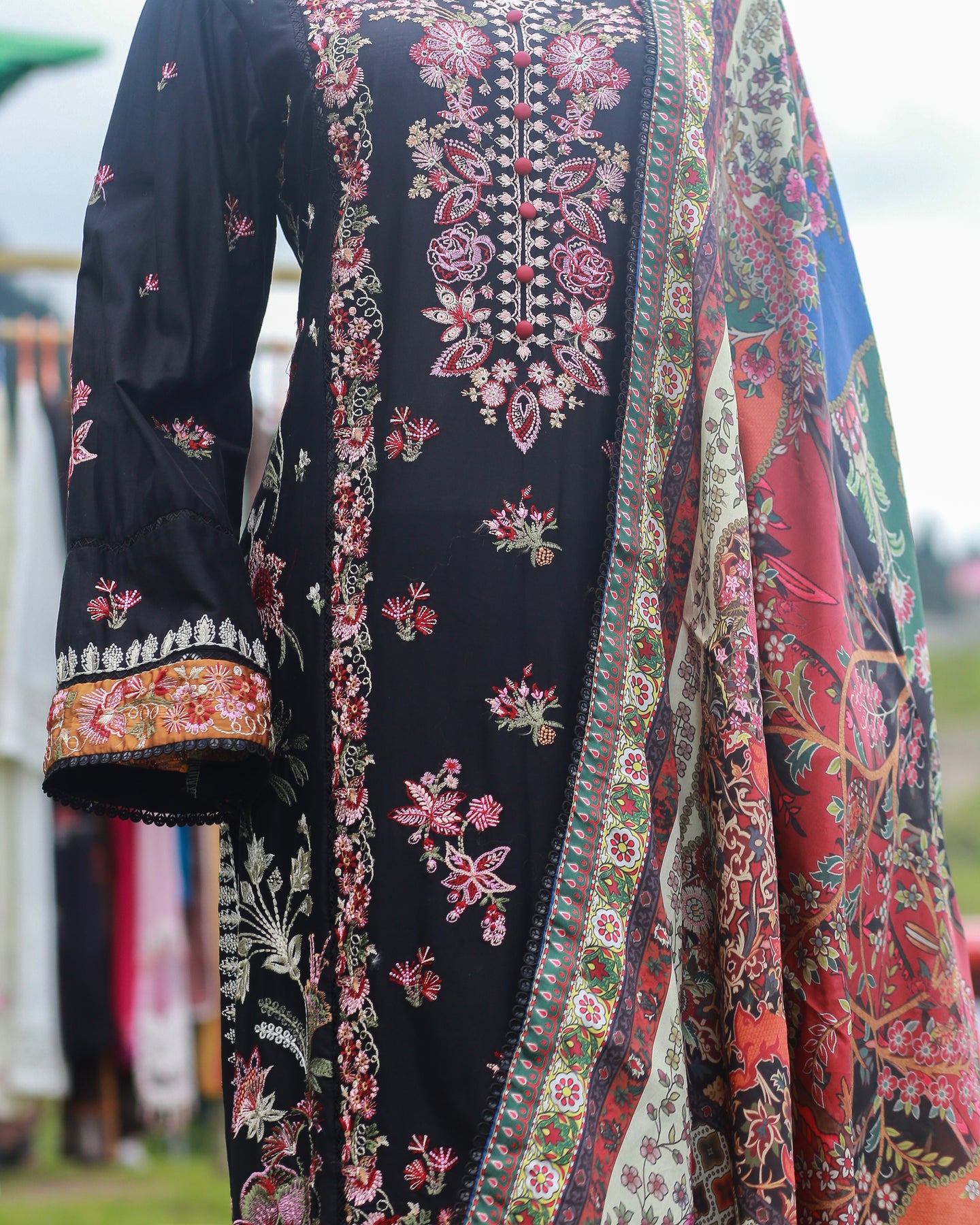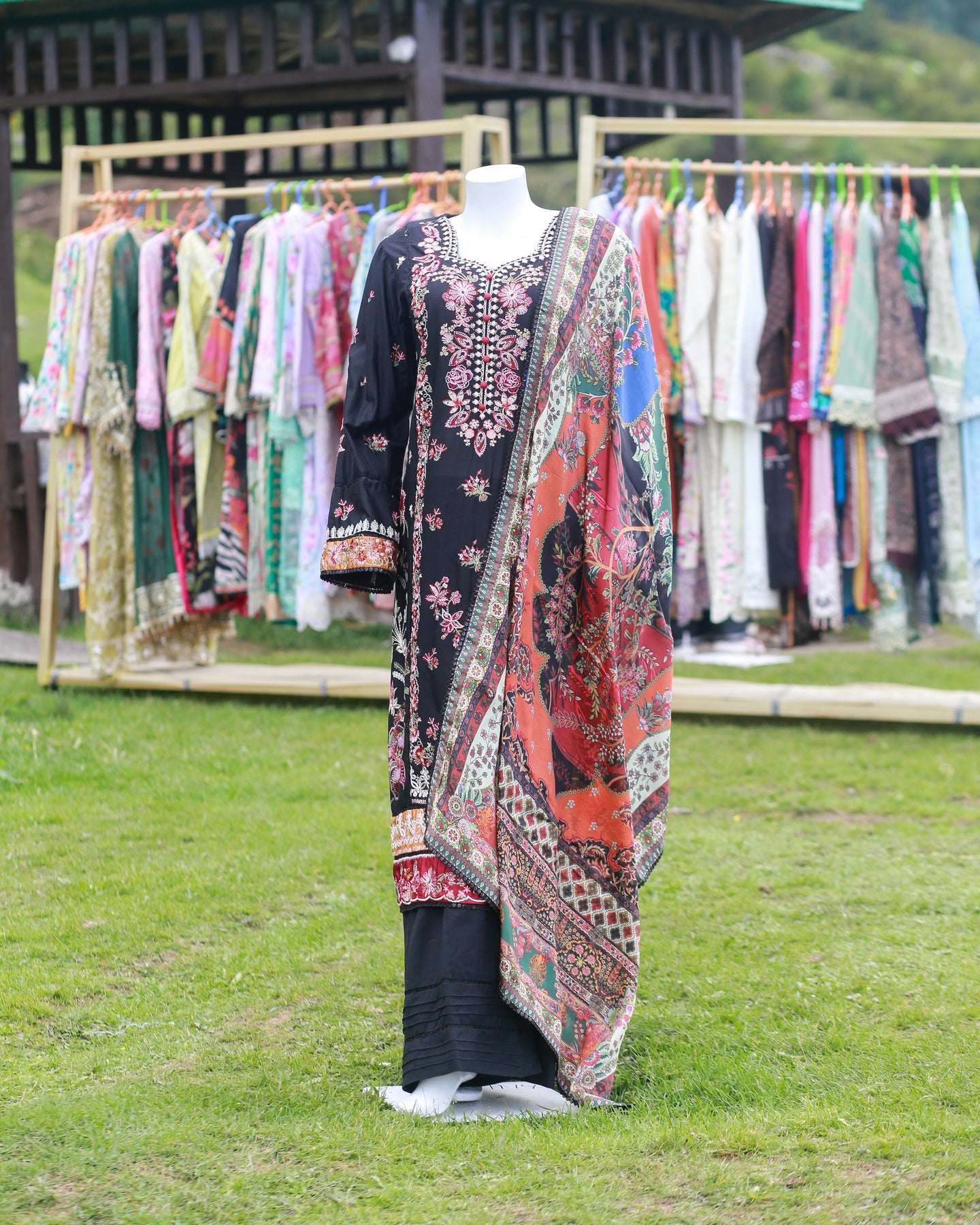 Step into elegance with this 3-piece ensemble from the Elaf Lawn Låmana Collection. The black lawn shirt is fully embroidered, featuring intricate silk embroidery patches, threadwork, and lace detailing, creating a refined and sophisticated look.