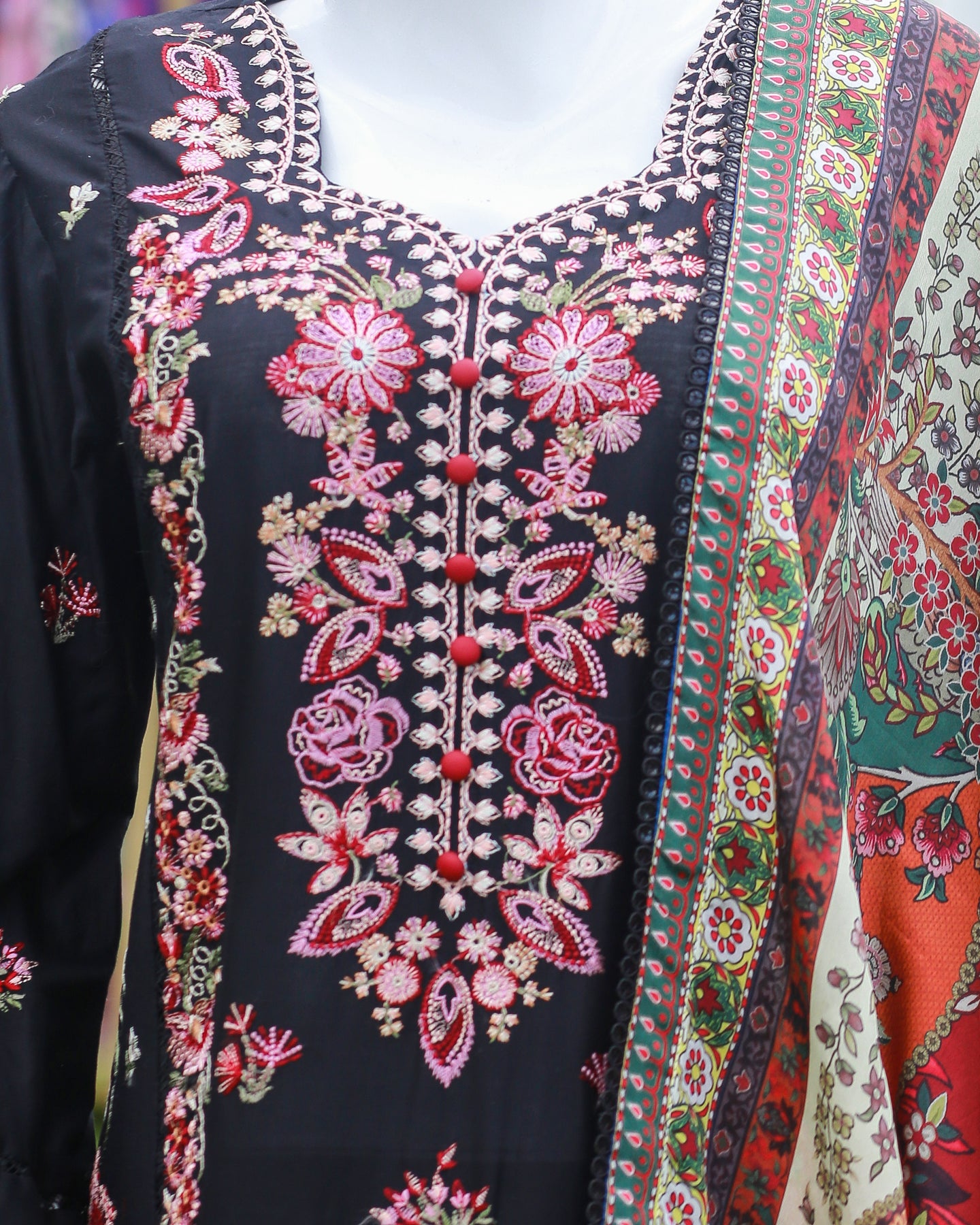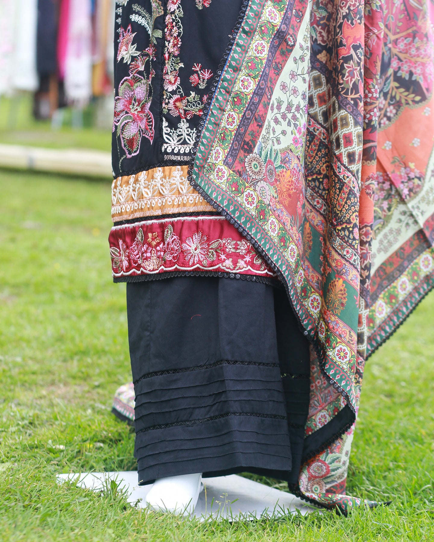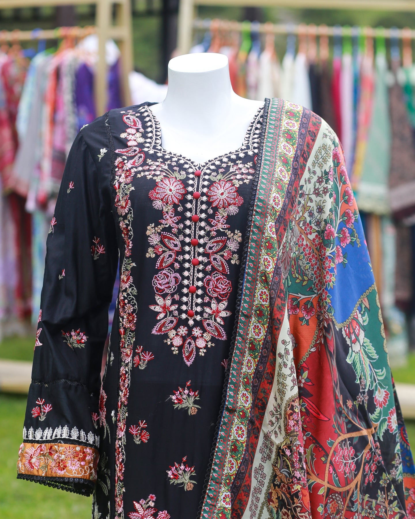 Step into elegance with this 3-piece ensemble from the Elaf Lawn Låmana Collection. The black lawn shirt is fully embroidered, featuring intricate silk embroidery patches, threadwork, and lace detailing, creating a refined and sophisticated look.