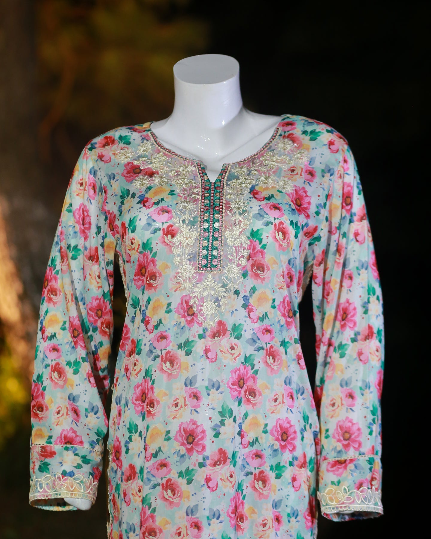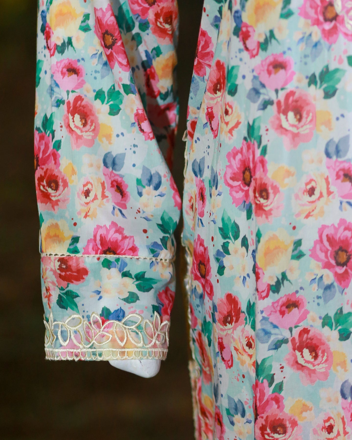 • 🧵 Shirt Fabric: Lawn (Floral printed with patch on neckline, sleeves & chak)