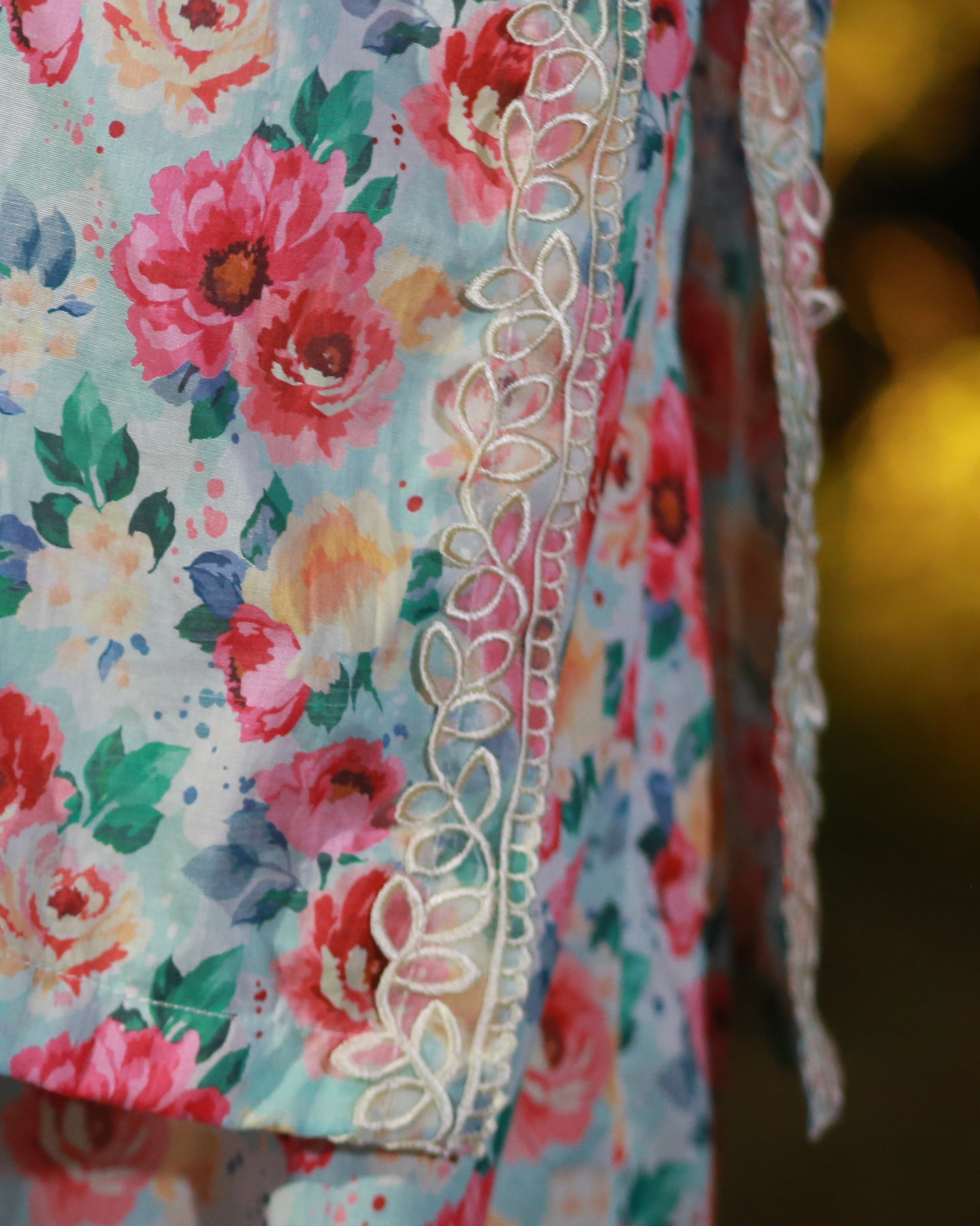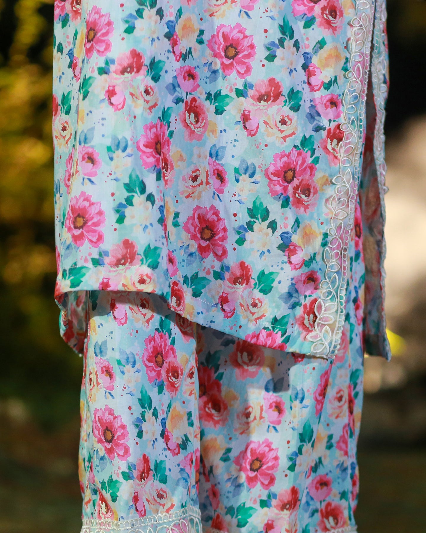 Paired with a printed lawn trouser featuring matching patchwork, this outfit offers a balanced blend of comfort, charm, and everyday sophistication.