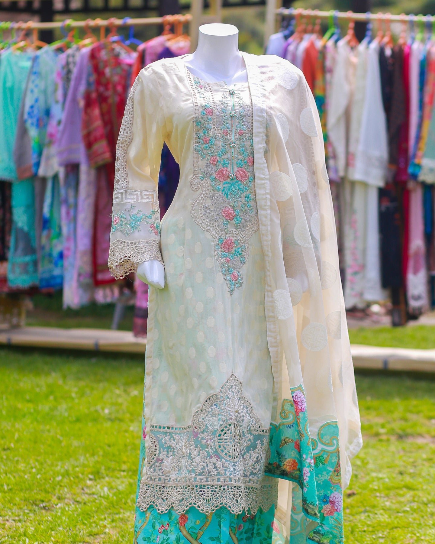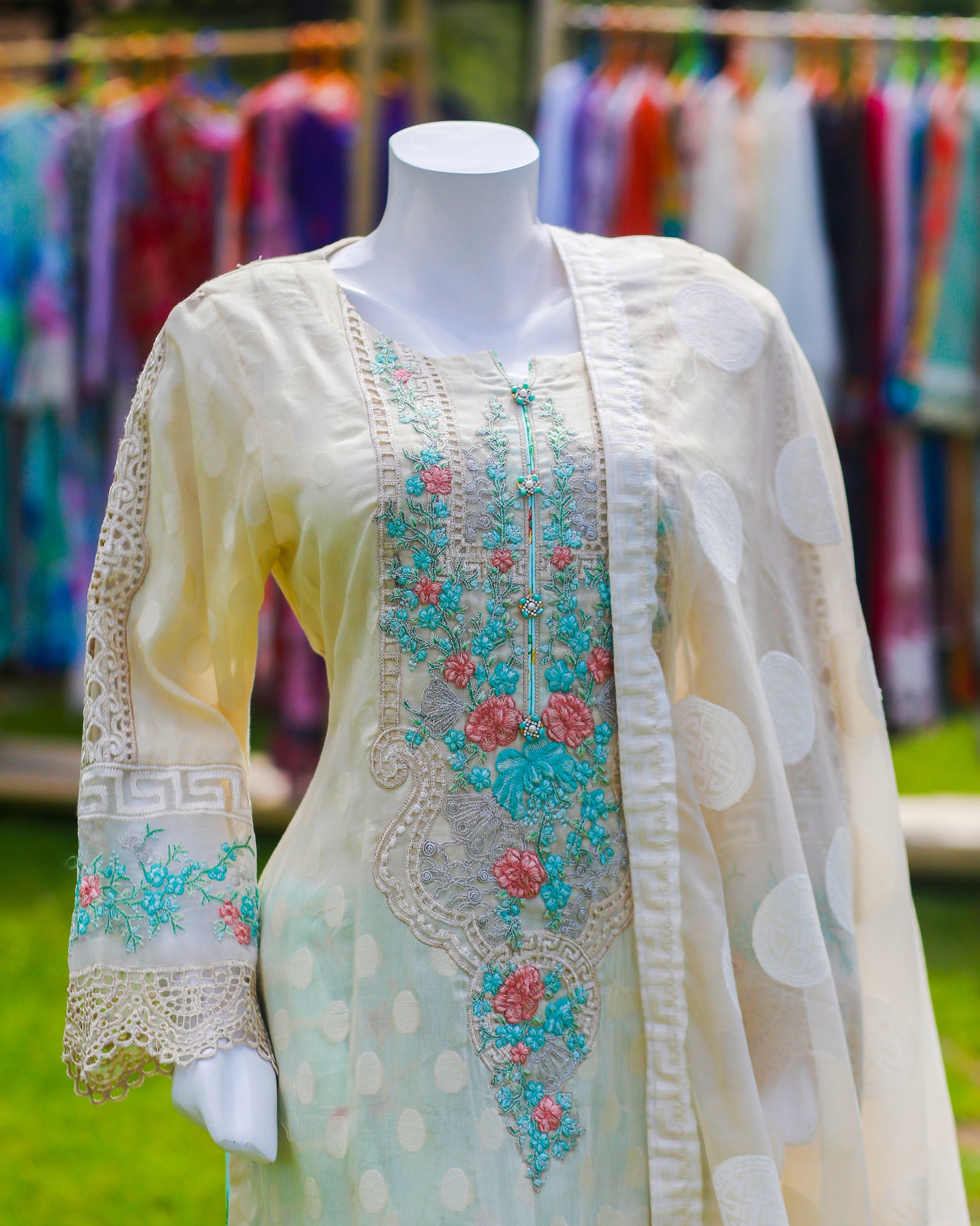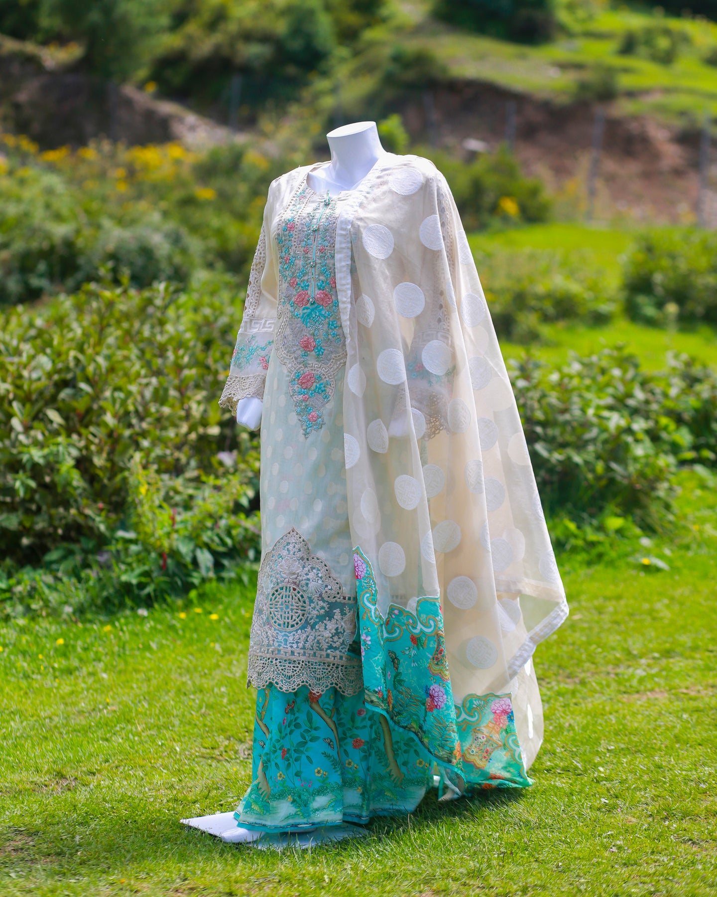 • 🧣 Dupatta Fabric: Jacquard Organza + Lawn (Floral patch)