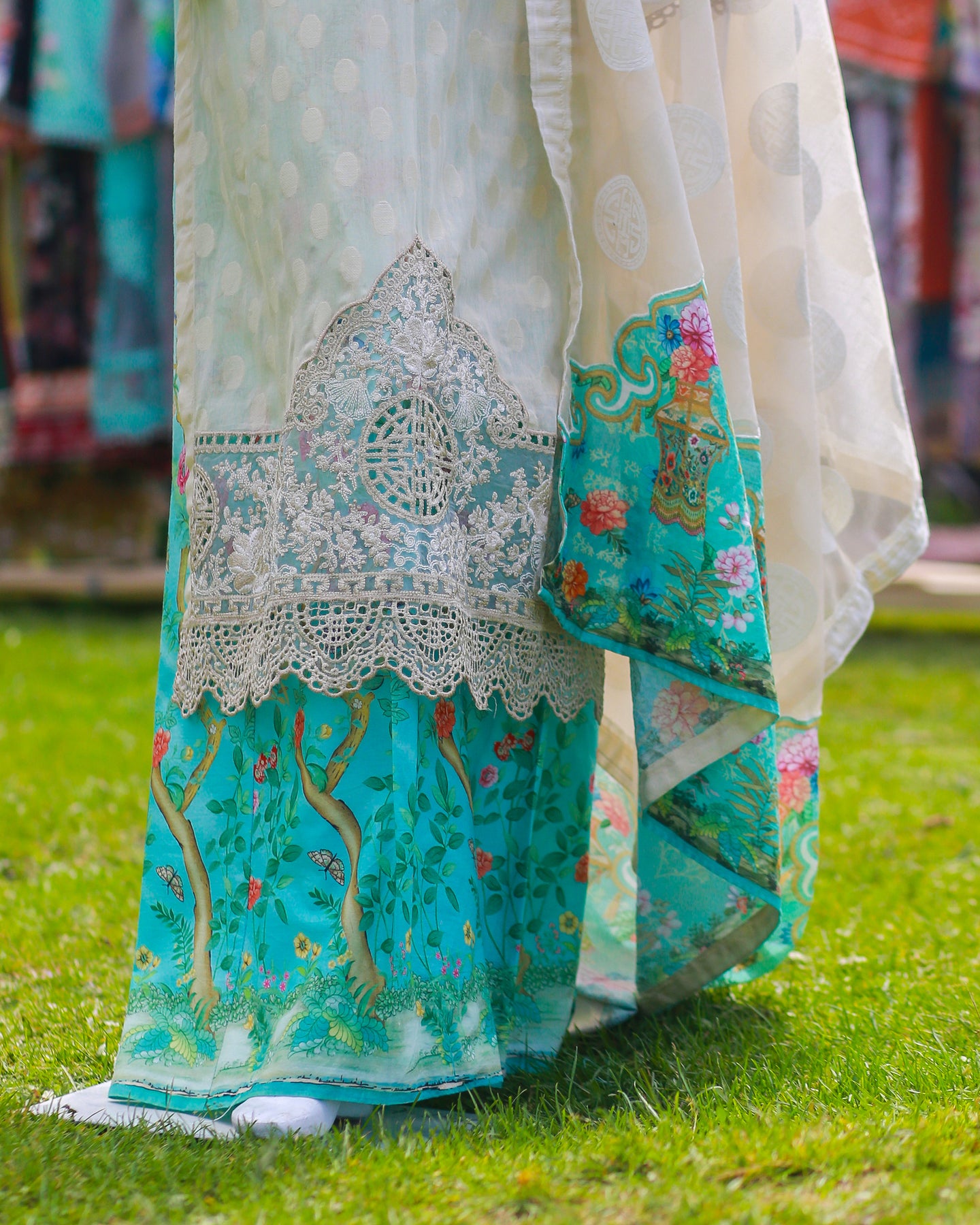 The outfit includes a uniquely designed jungle-theme printed trouser, adding a contemporary artistic touch. Completing the set is a beautifully crafted jacquard organza dupatta, adorned with a floral lawn patch, creating a striking blend of texture and design.