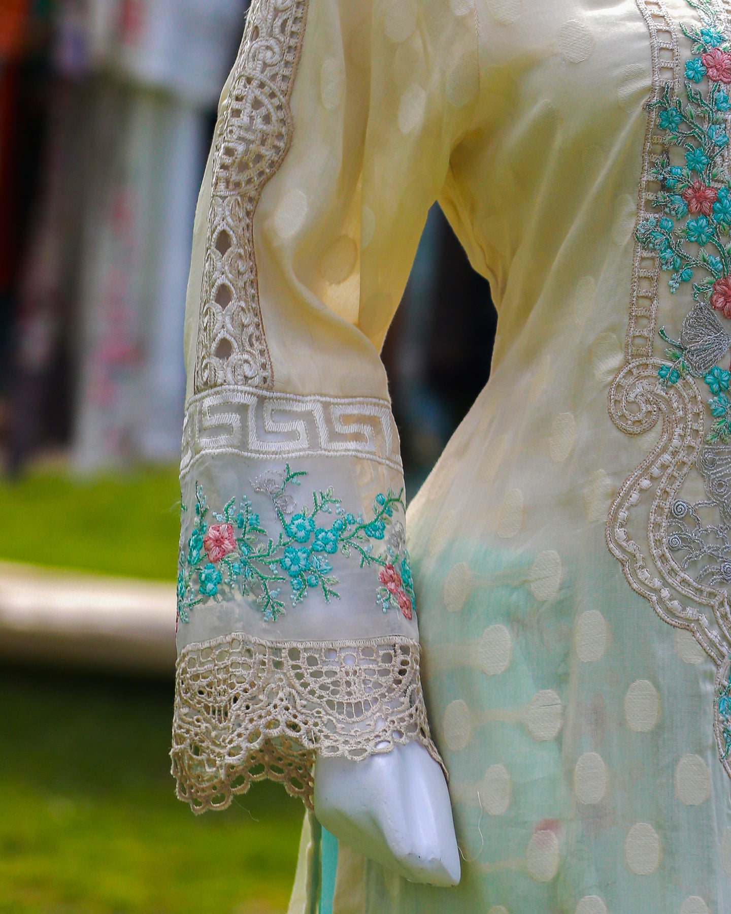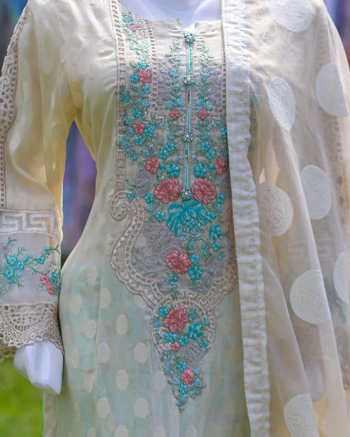• 🧵 Shirt Fabric: Jacquard Lawn (Fully embroidered with threadwork, buttons & cutwork daman/sleeves)