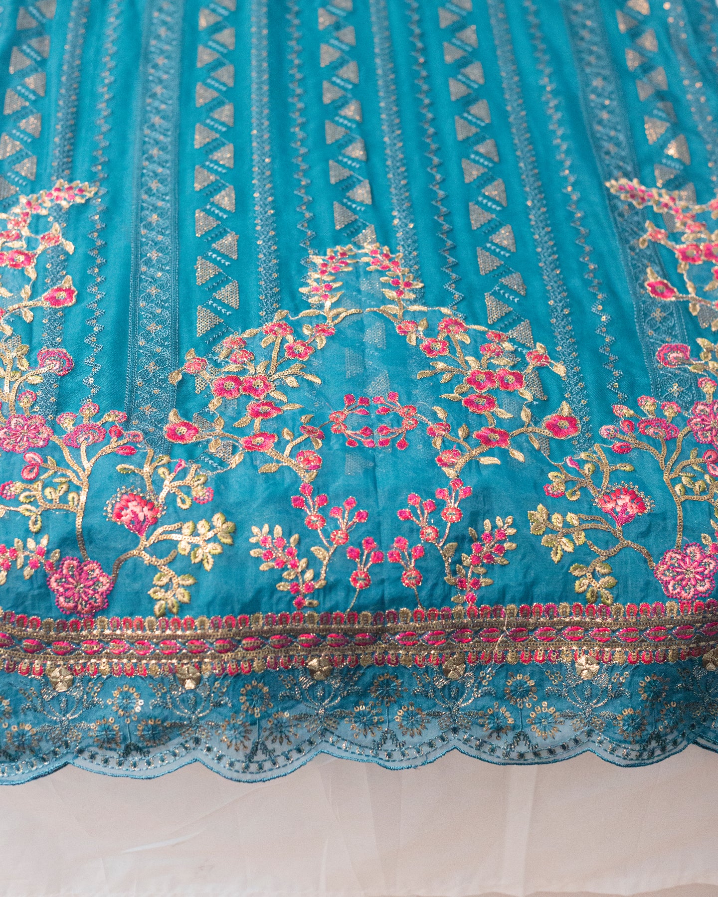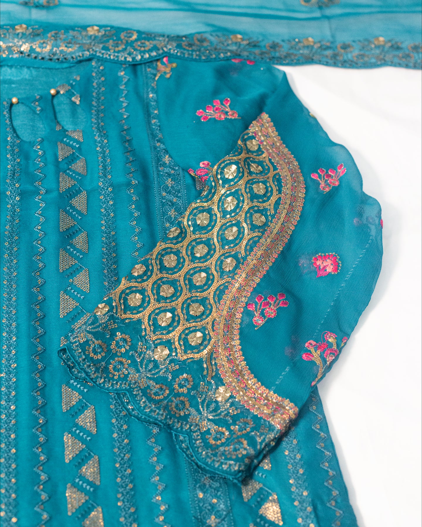 It’s paired with a classic cambric trouser and a matching chiffon dupatta detailed with fine embroidery—perfect for weddings, festive gatherings, and special evenings.
