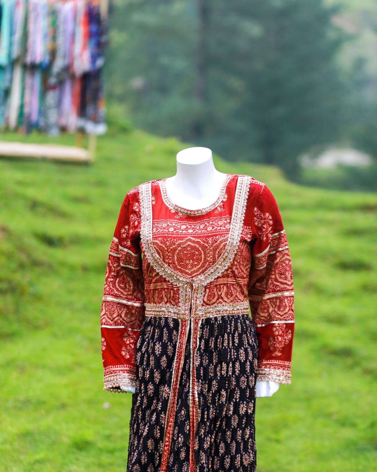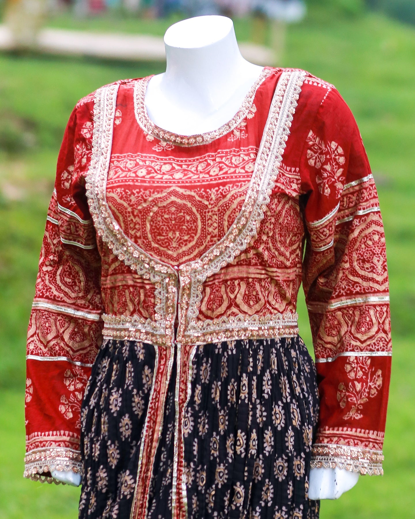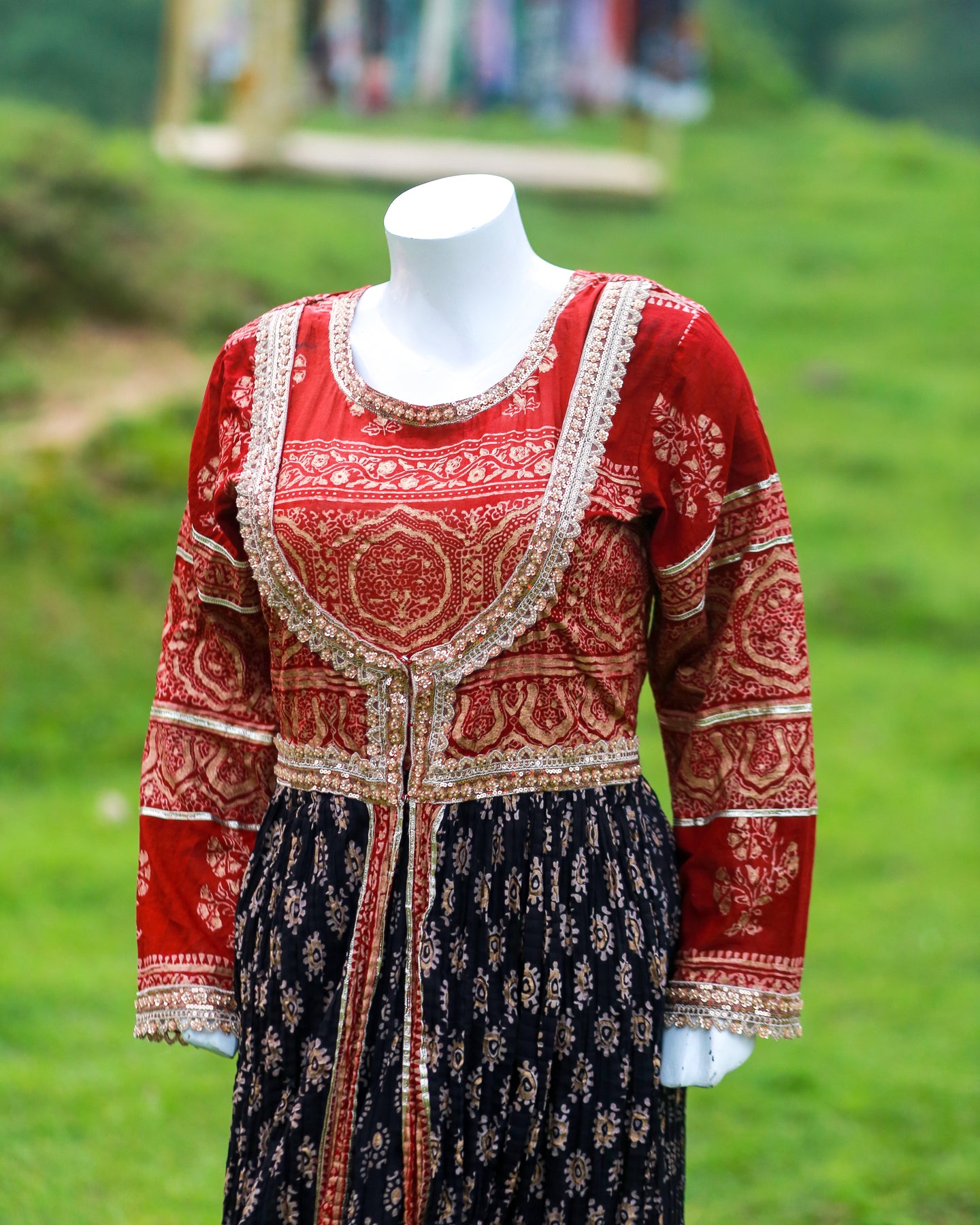 Enhanced further with a matching frock-style gown overlay in the same traditional pattern, this piece offers graceful layering, movement, and a statement silhouette—perfect for festive occasions, cultural events, and timeless fashion lovers.