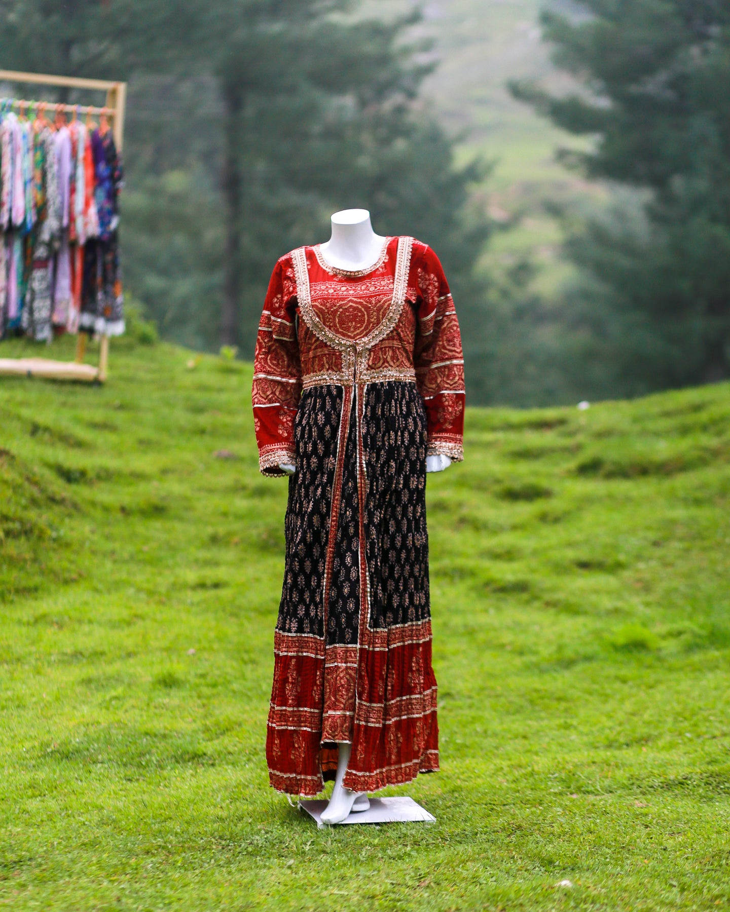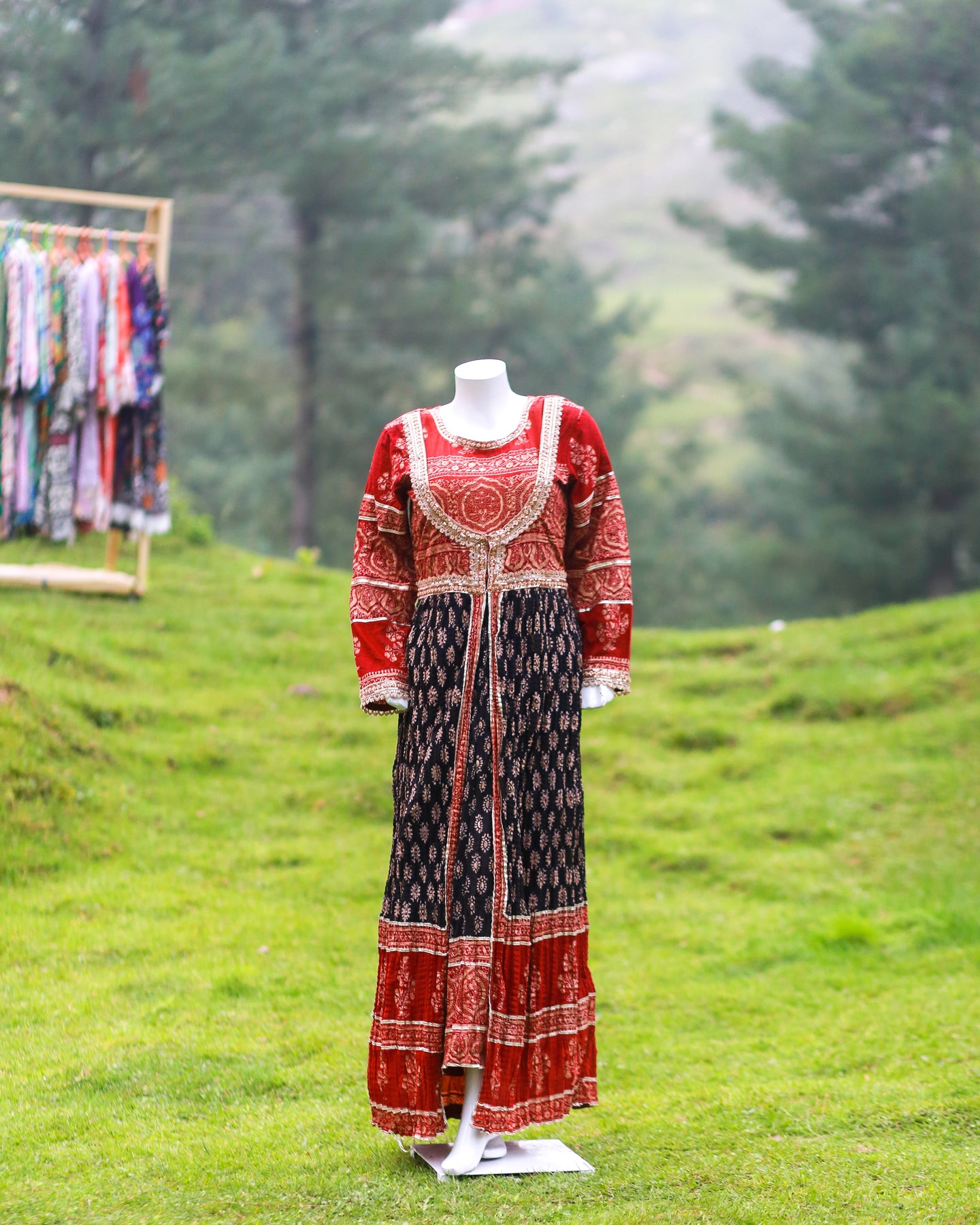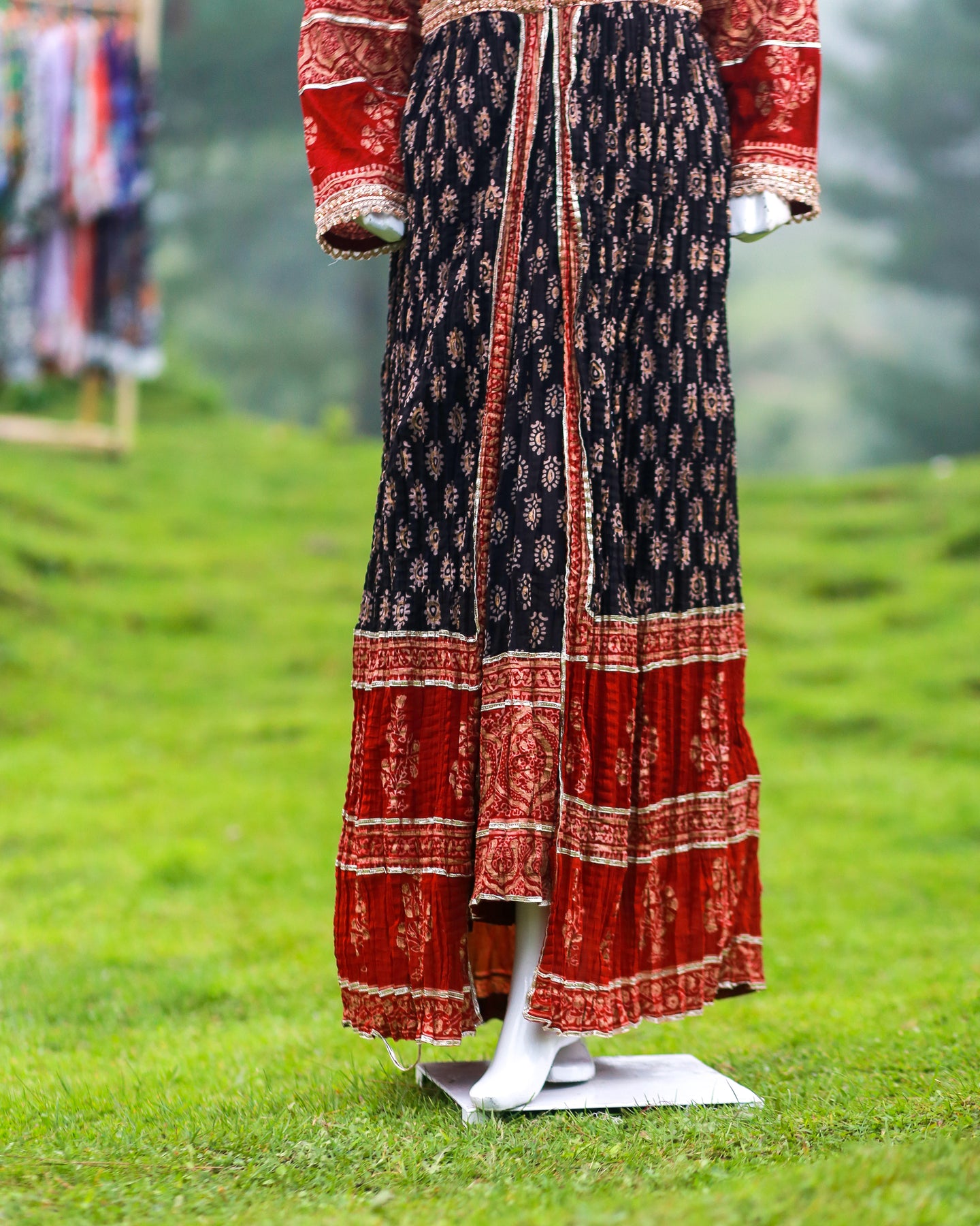 Enhanced further with a matching frock-style gown overlay in the same traditional pattern, this piece offers graceful layering, movement, and a statement silhouette—perfect for festive occasions, cultural events, and timeless fashion lovers.