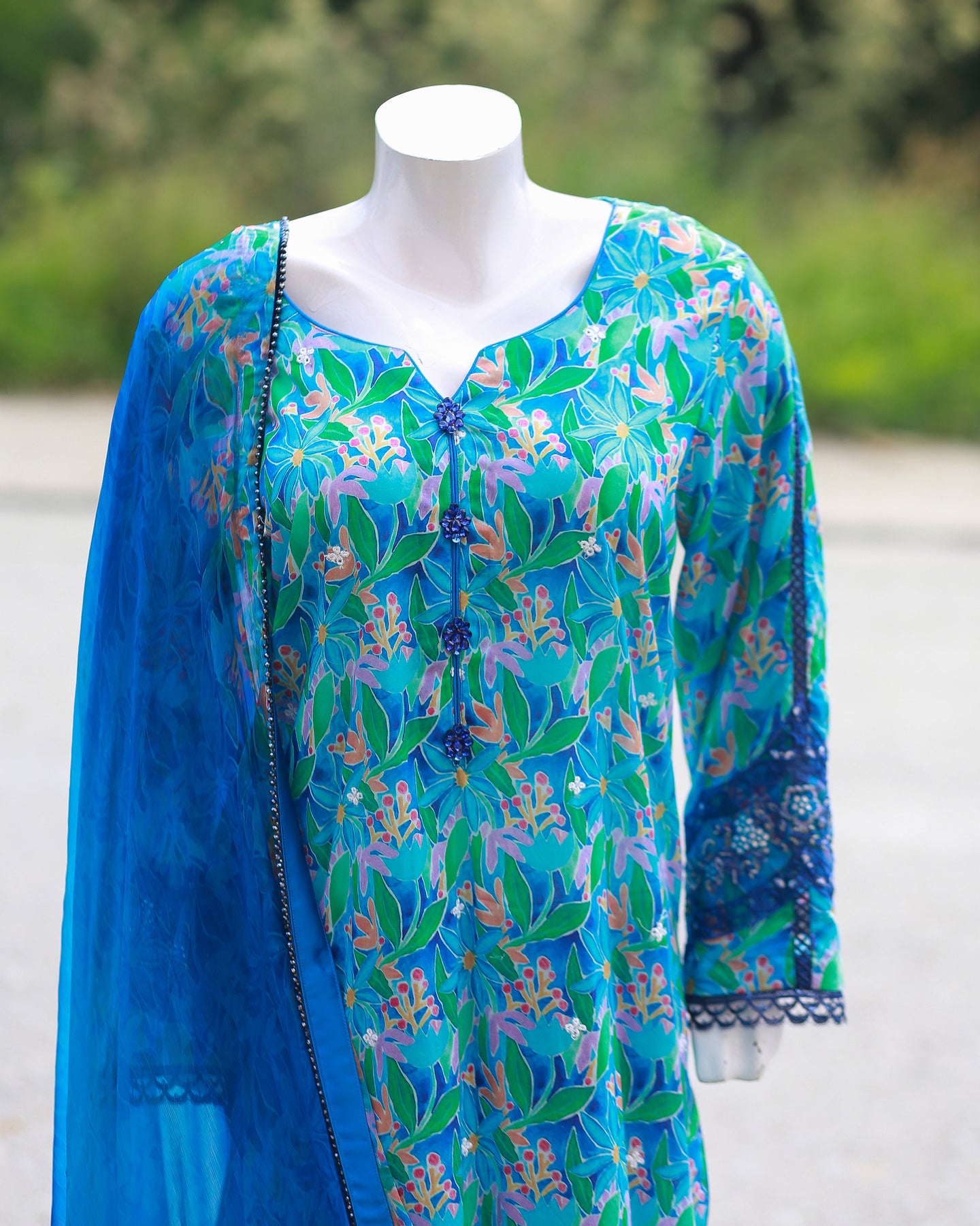 Paired with a plain cambric trouser for effortless comfort, the outfit is completed with a printed chiffon dupatta finished with lace, adding a delicate and graceful touch to the overall ensemble.