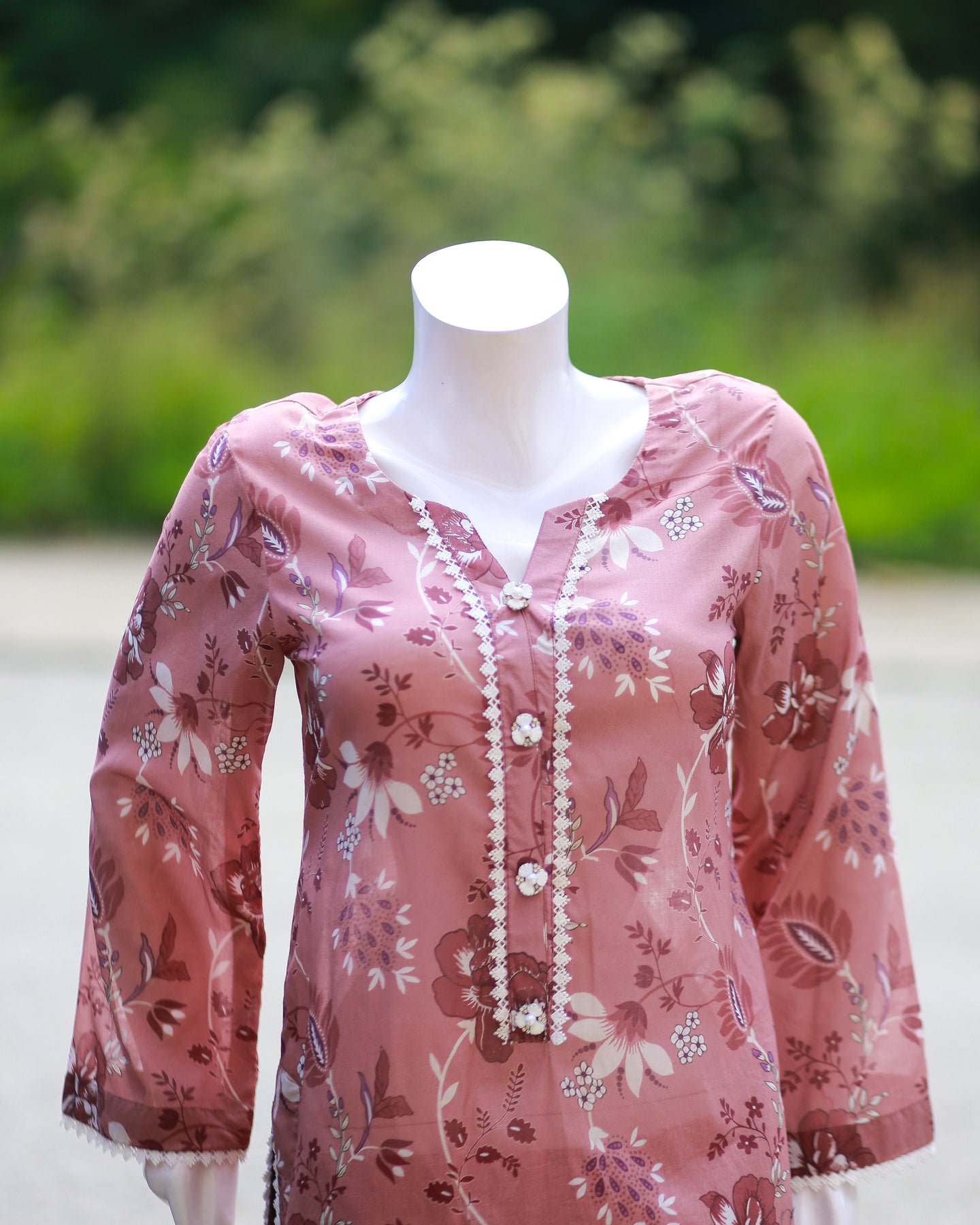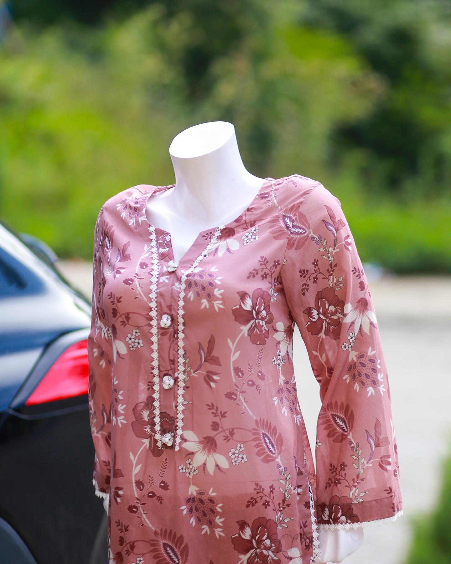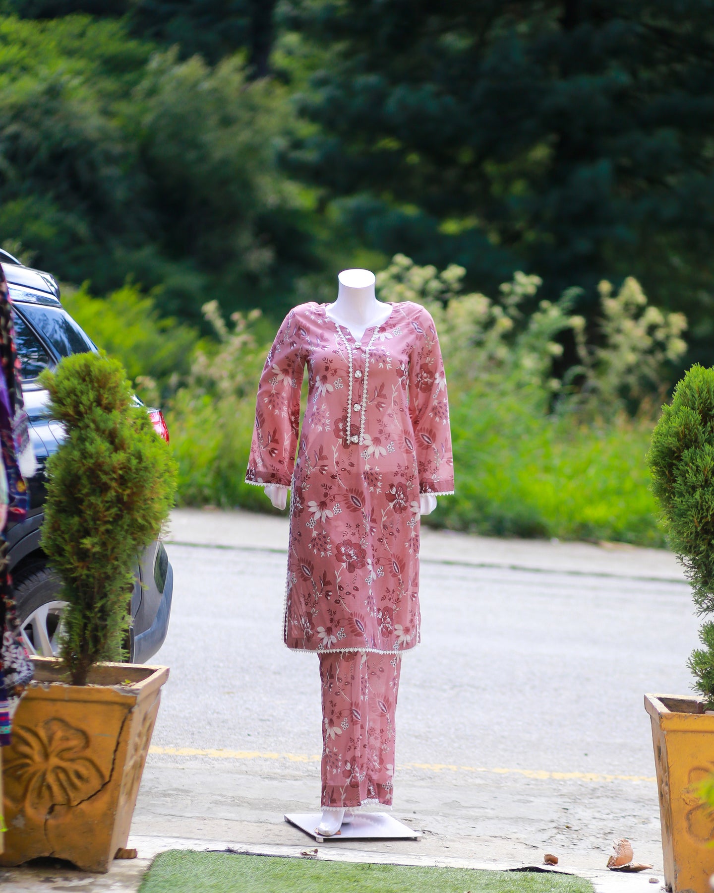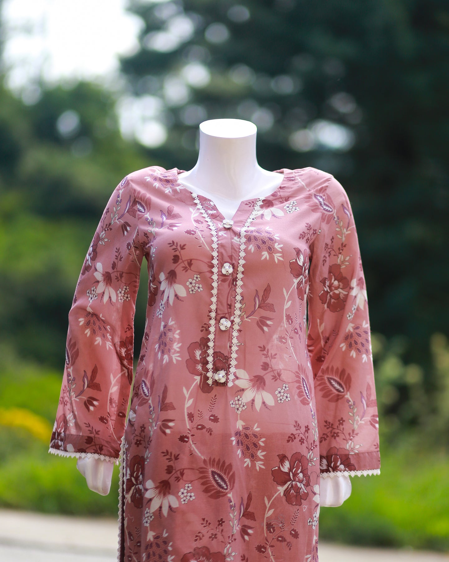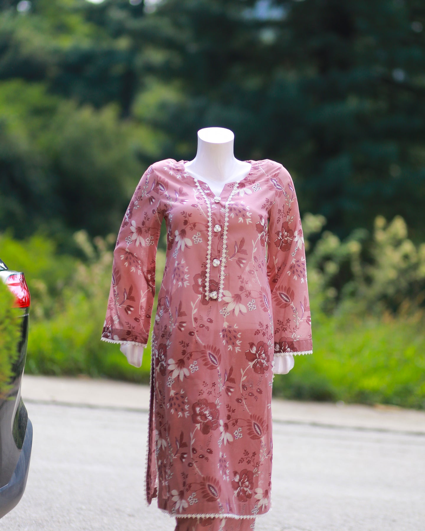 Paired with a printed lawn trouser accented with matching lace, the outfit ensures coordinated style and comfort, creating a complete and polished appearance.