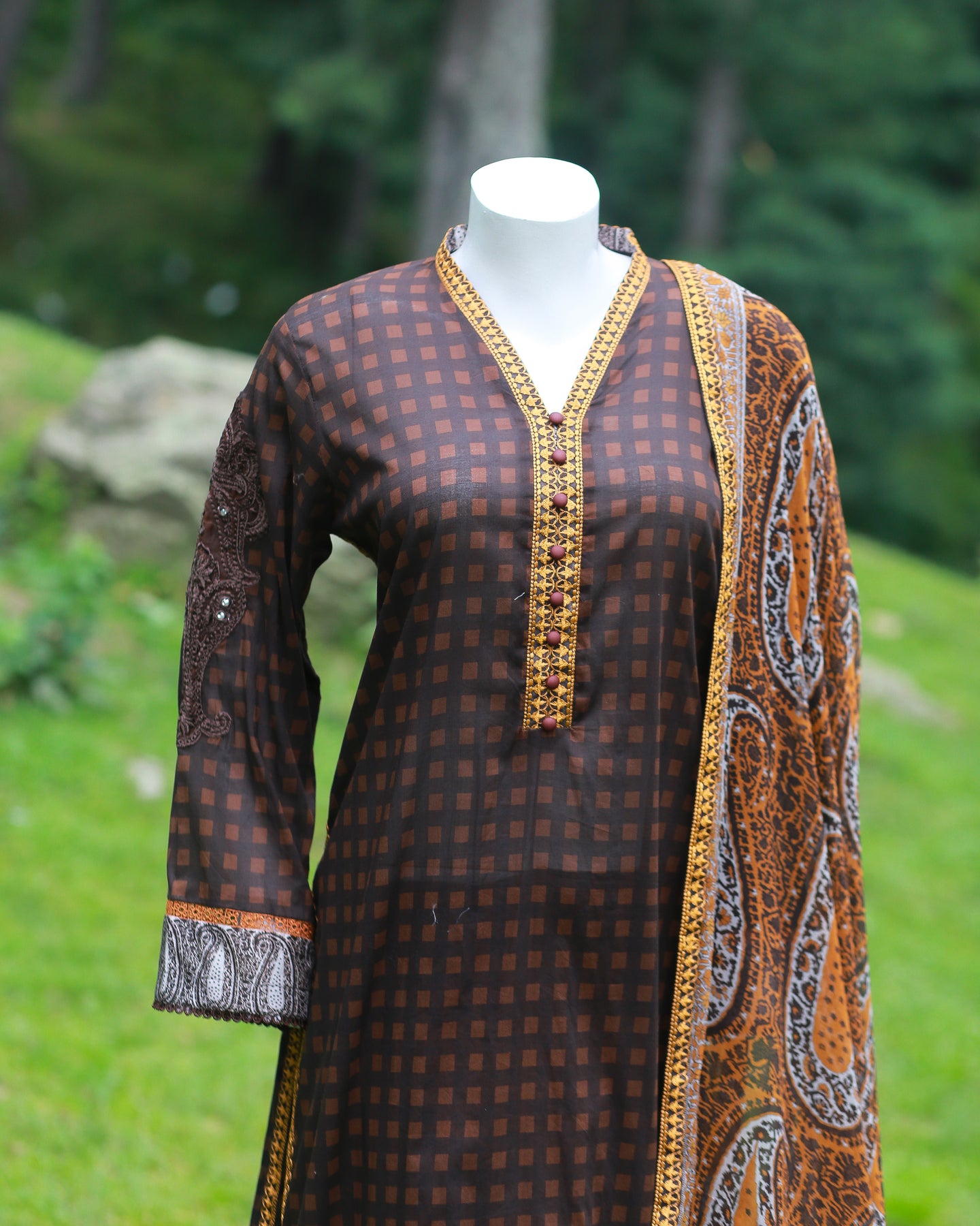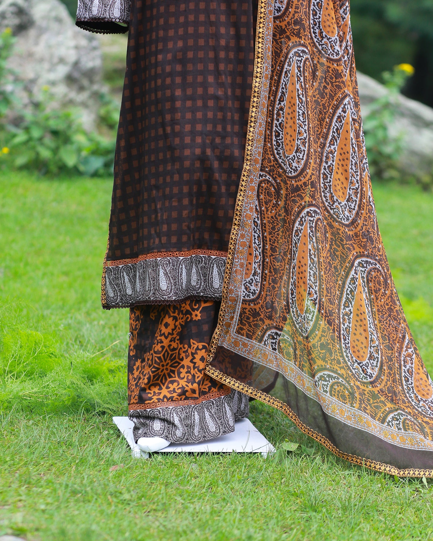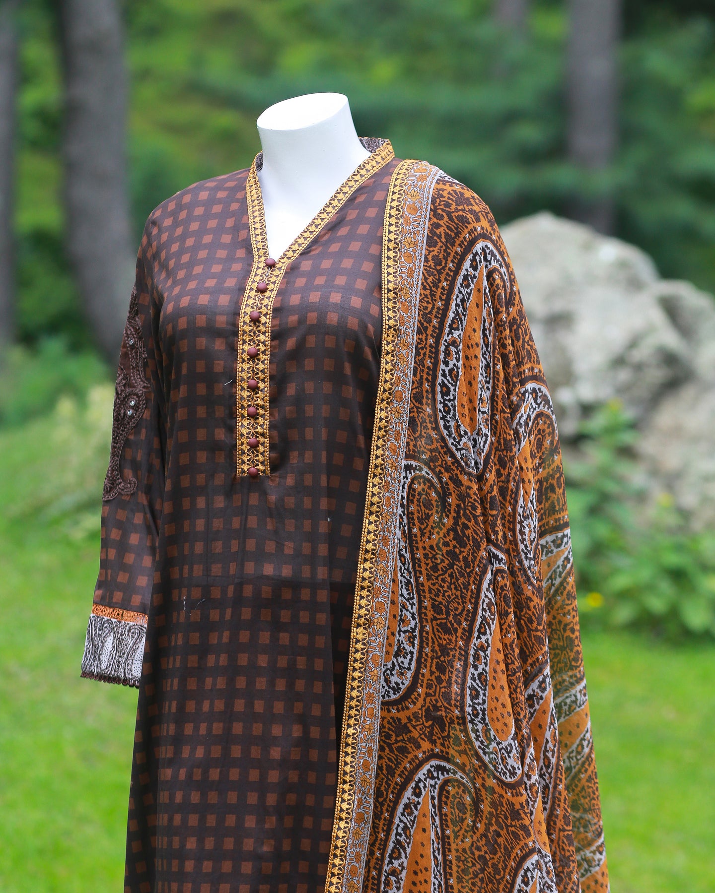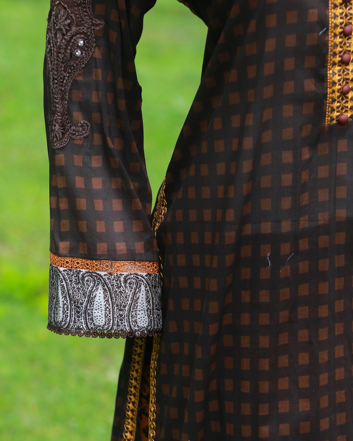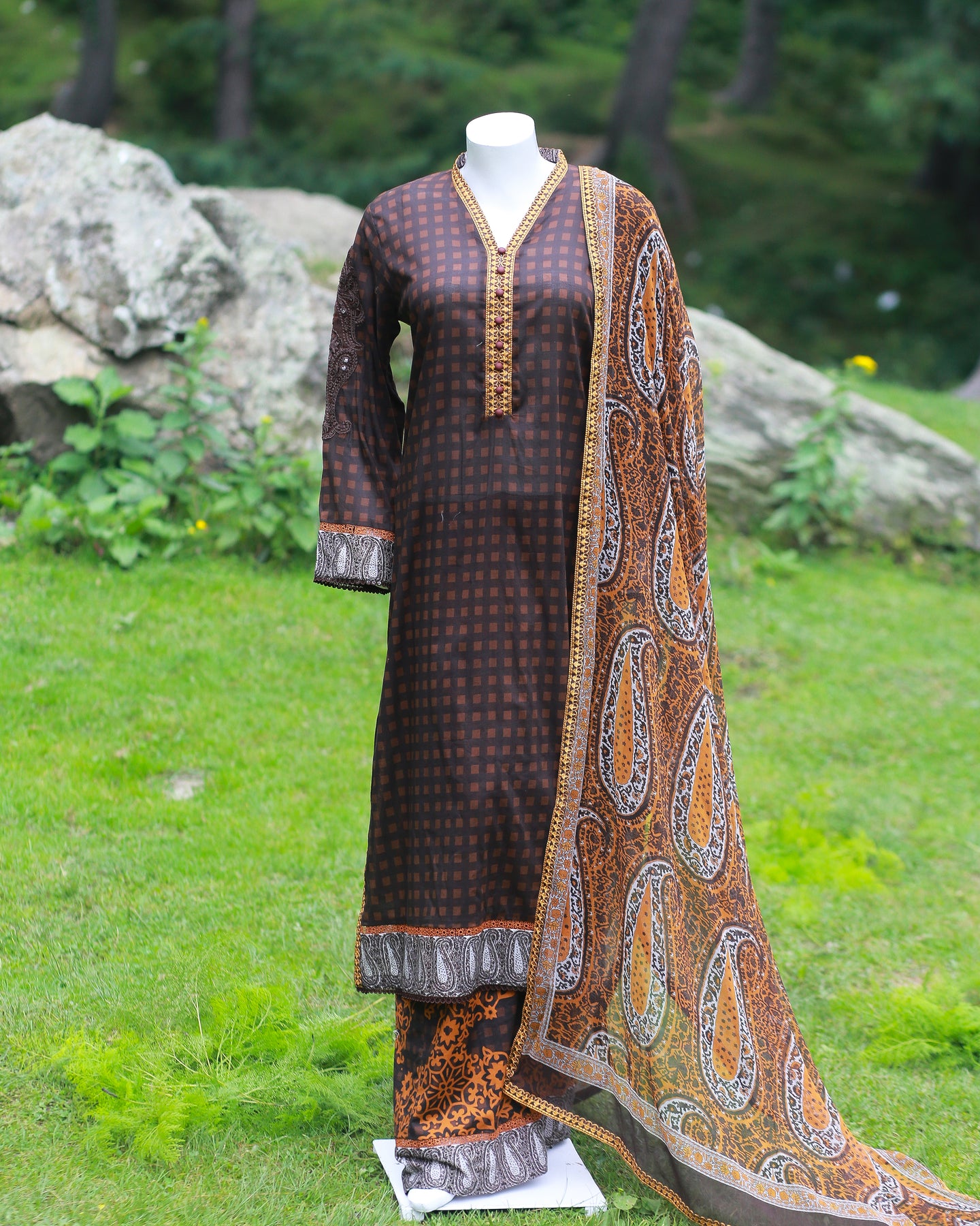 Elevate your wardrobe with this 3-piece brown and mustard ensemble from Charizma. The printed lawn shirt is elegantly embroidered and detailed with buttons and lace, offering a refined and stylish look perfect for daytime or semi-formal occasions.