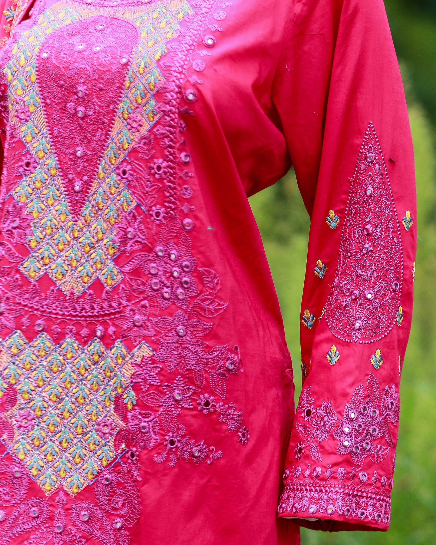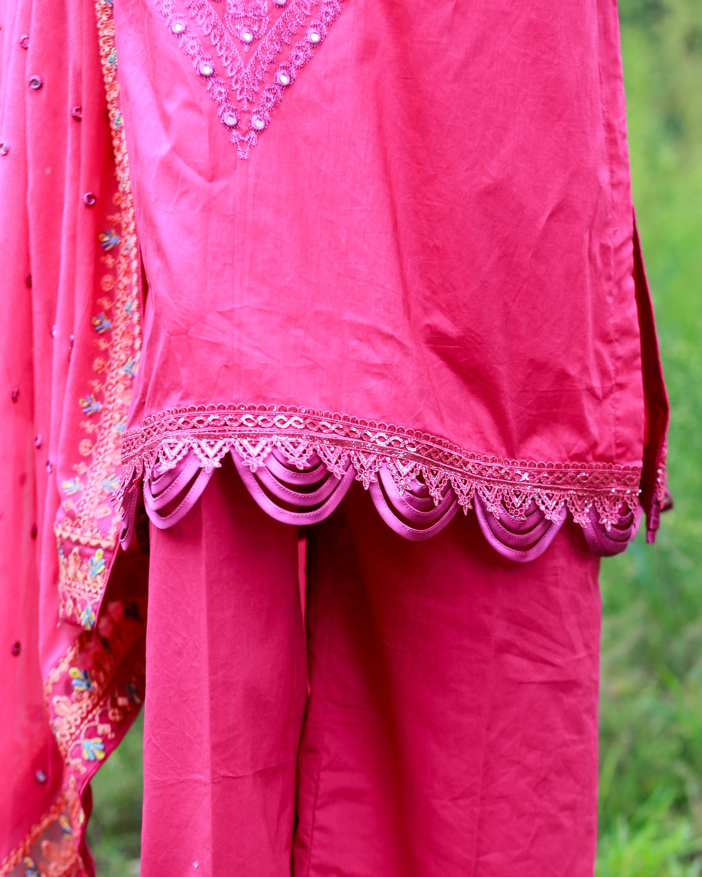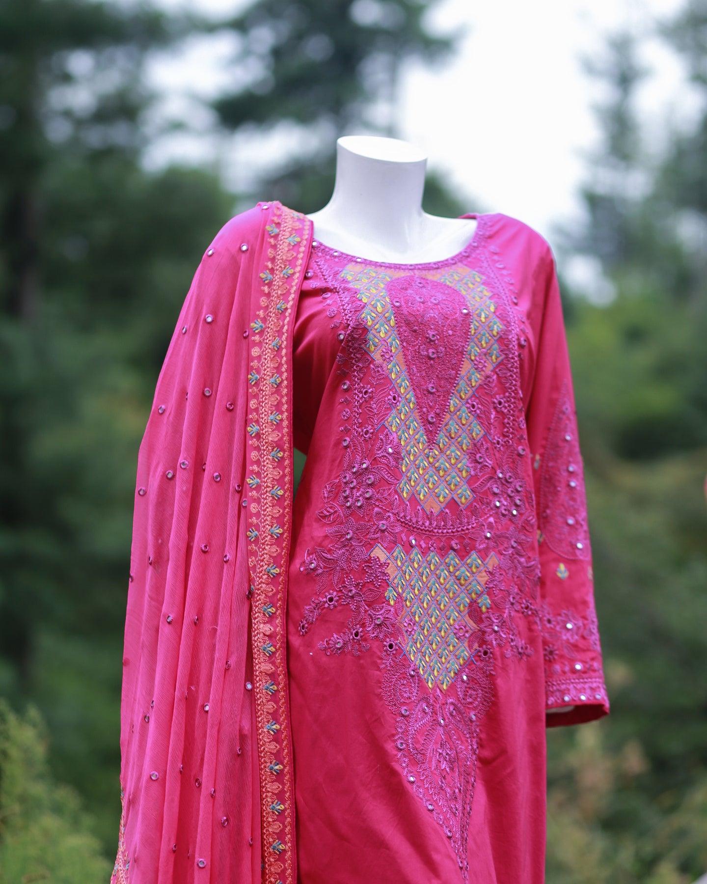 Complemented by a plain cambric trouser for effortless comfort and balance, the outfit is beautifully finished with an embroidered chiffon dupatta, adding graceful drape and a touch of delicacy to the complete look.