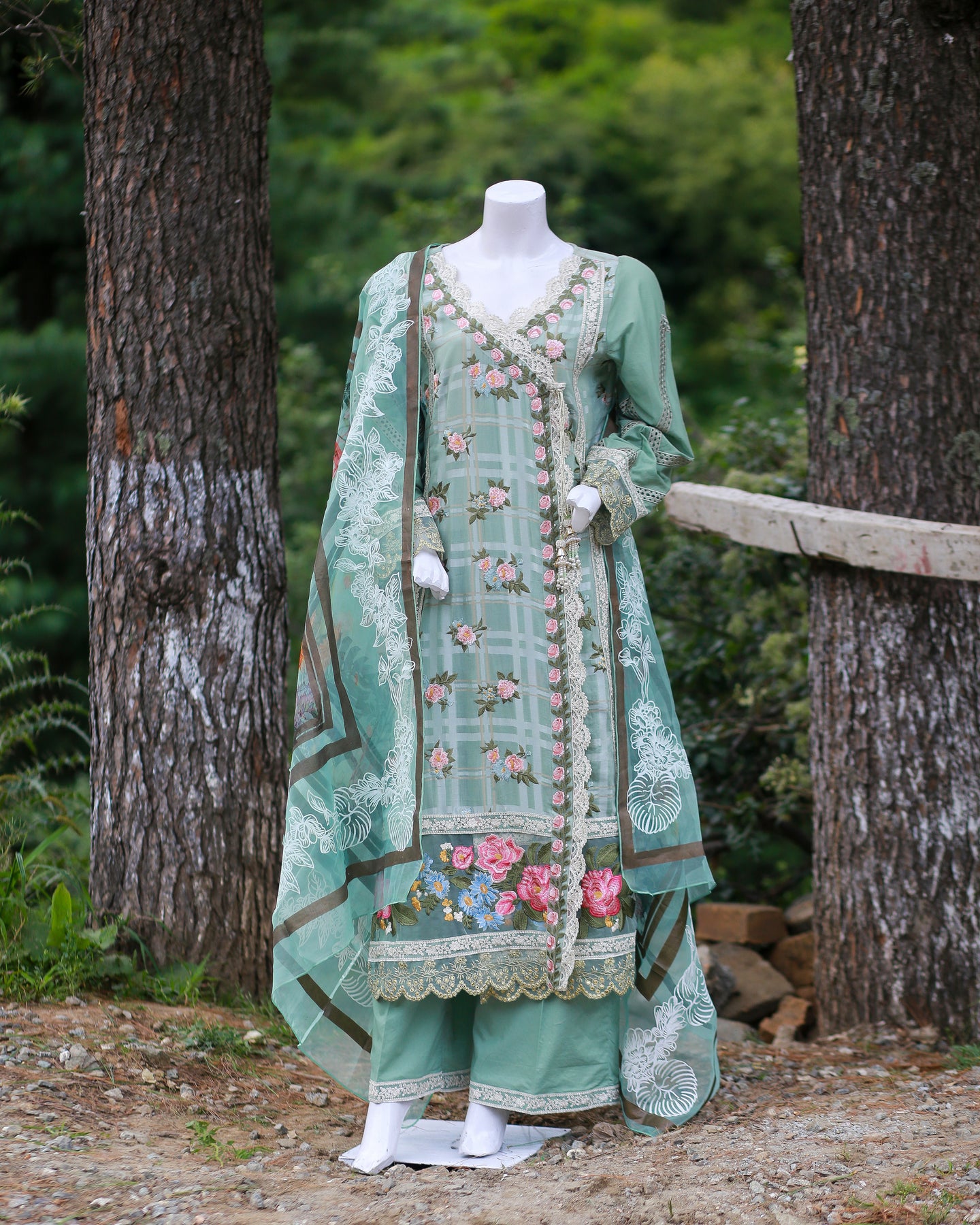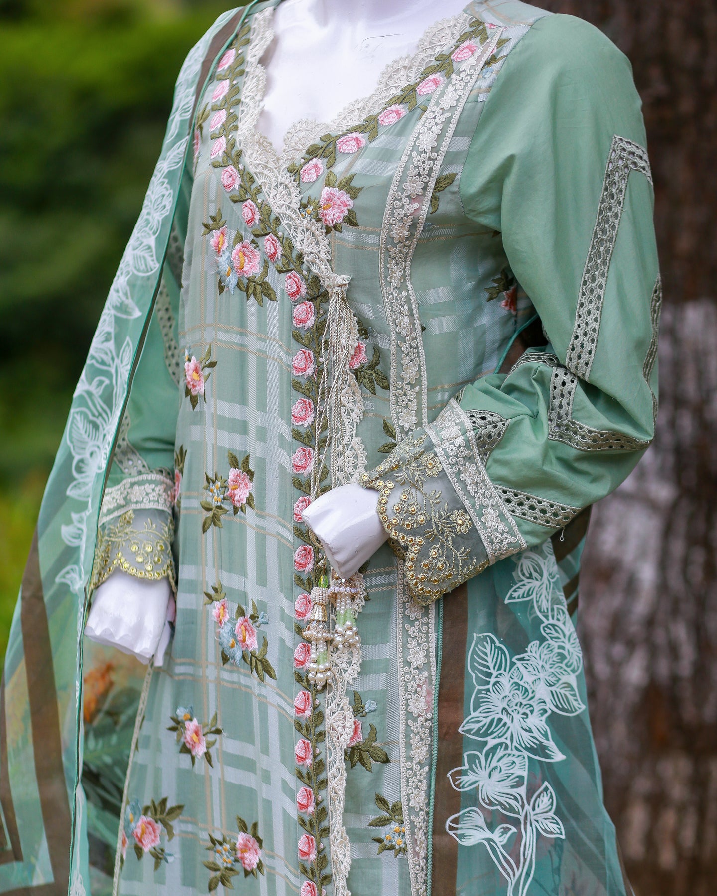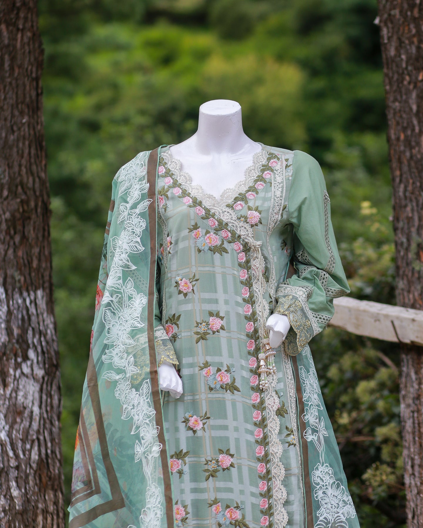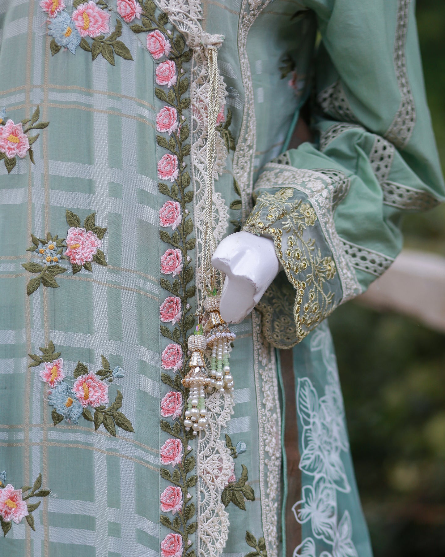 Step into elegant sophistication with this 3-piece Crimson ensemble, featuring a stunning light green Angrakha-style lawn shirt adorned with full embroidery, thread work, panni detailing, chikankari patterns, lace accents, and tassels—creating a luxurious and graceful traditional look.