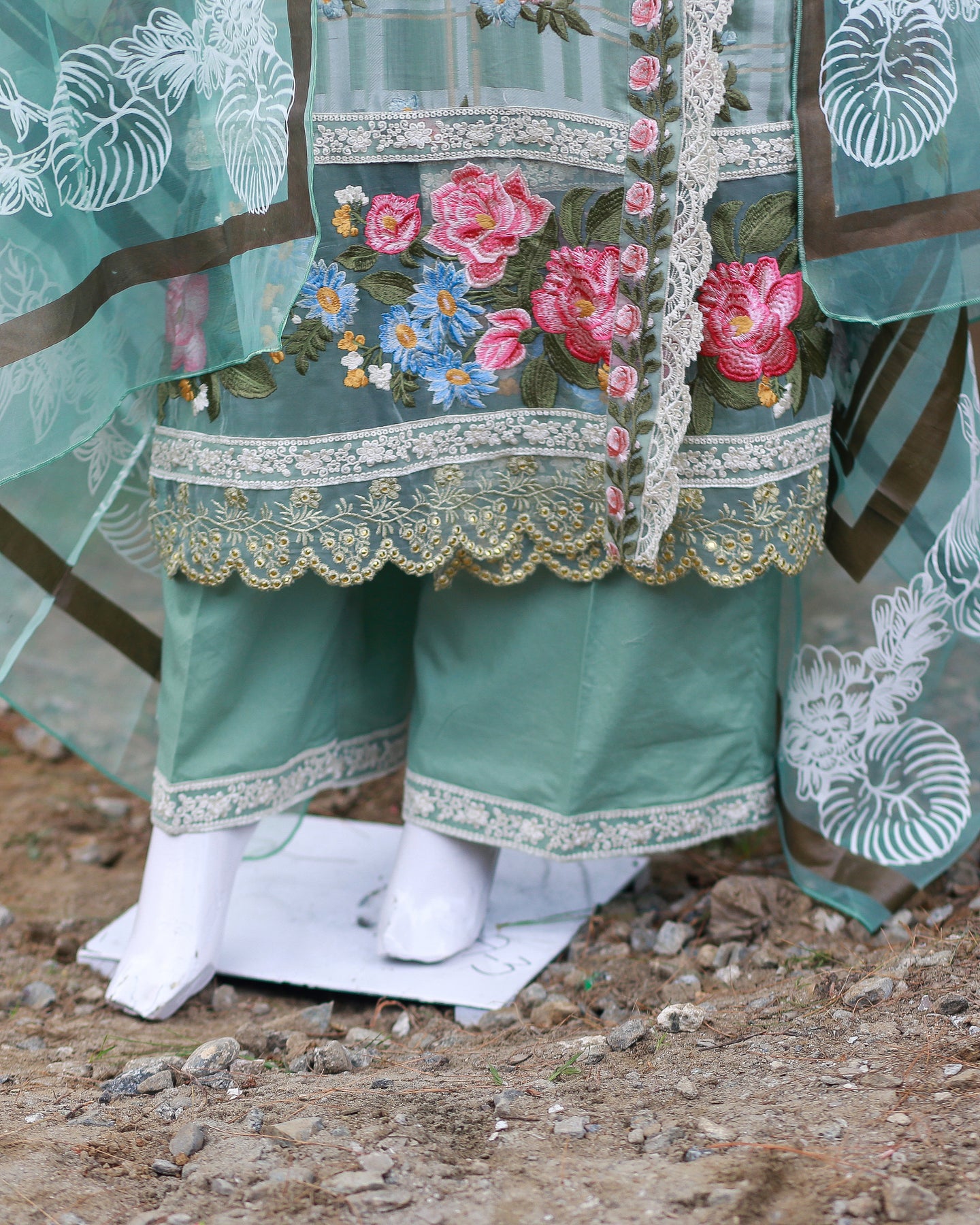 The outfit is paired with a plain cambric trouser enhanced with embroidery for a refined finish, while the look is completed with a block-printed organza dupatta, adding artistic charm and a lightweight, floaty elegance—perfect for festive occasions, cultural gatherings, and enchanting daytime wear.