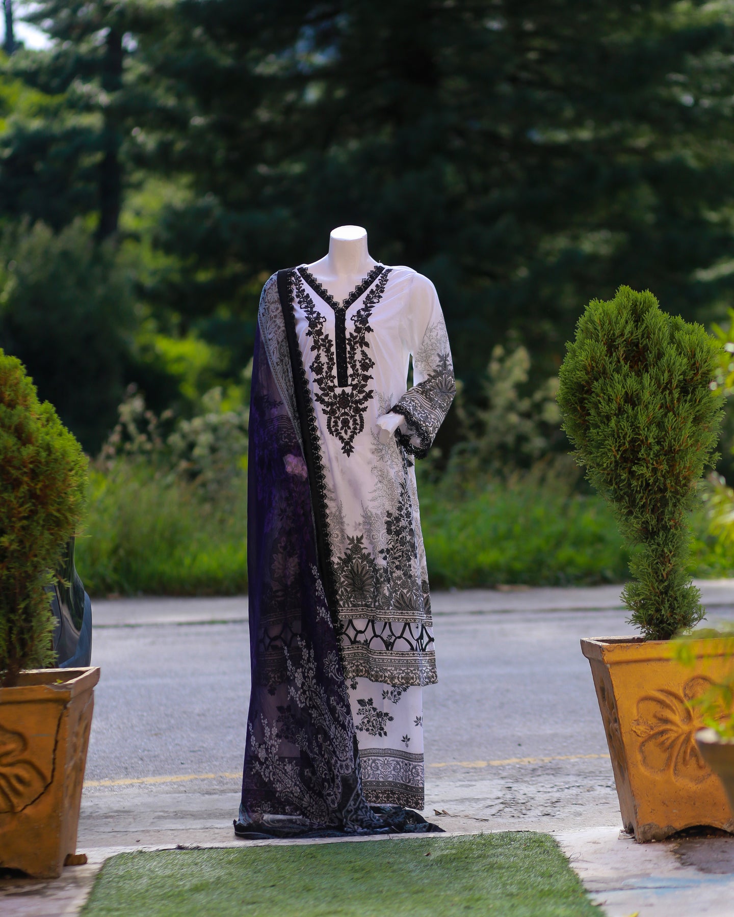 Experience refined sophistication with this 3-piece Maria.B ensemble, featuring a fully embroidered lawn shirt adorned with intricate thread and sequence work that adds a luxurious shimmer to the look. The design is elevated with a criss-cross patterned daman and delicate lace accents, creating an elegant and graceful silhouette.