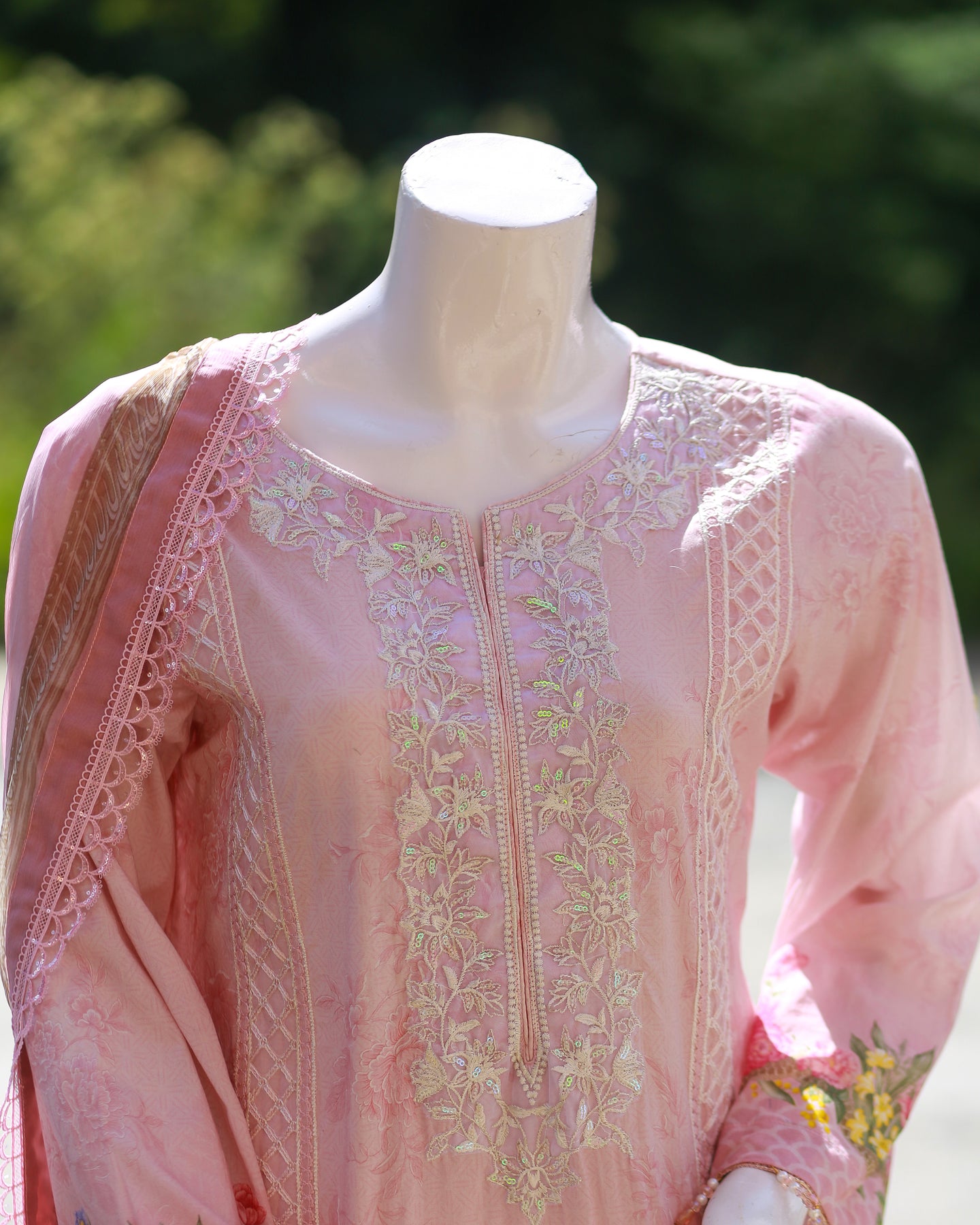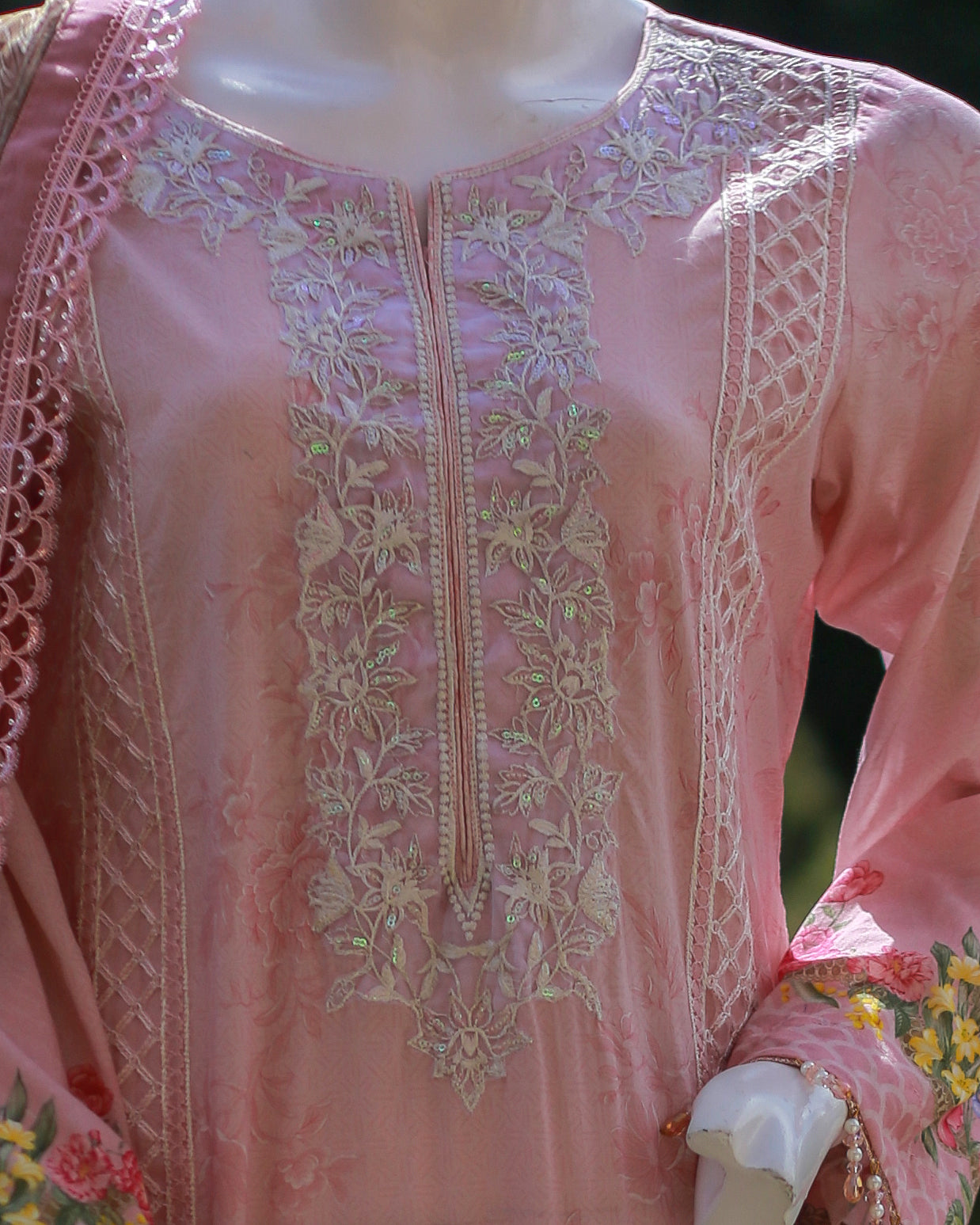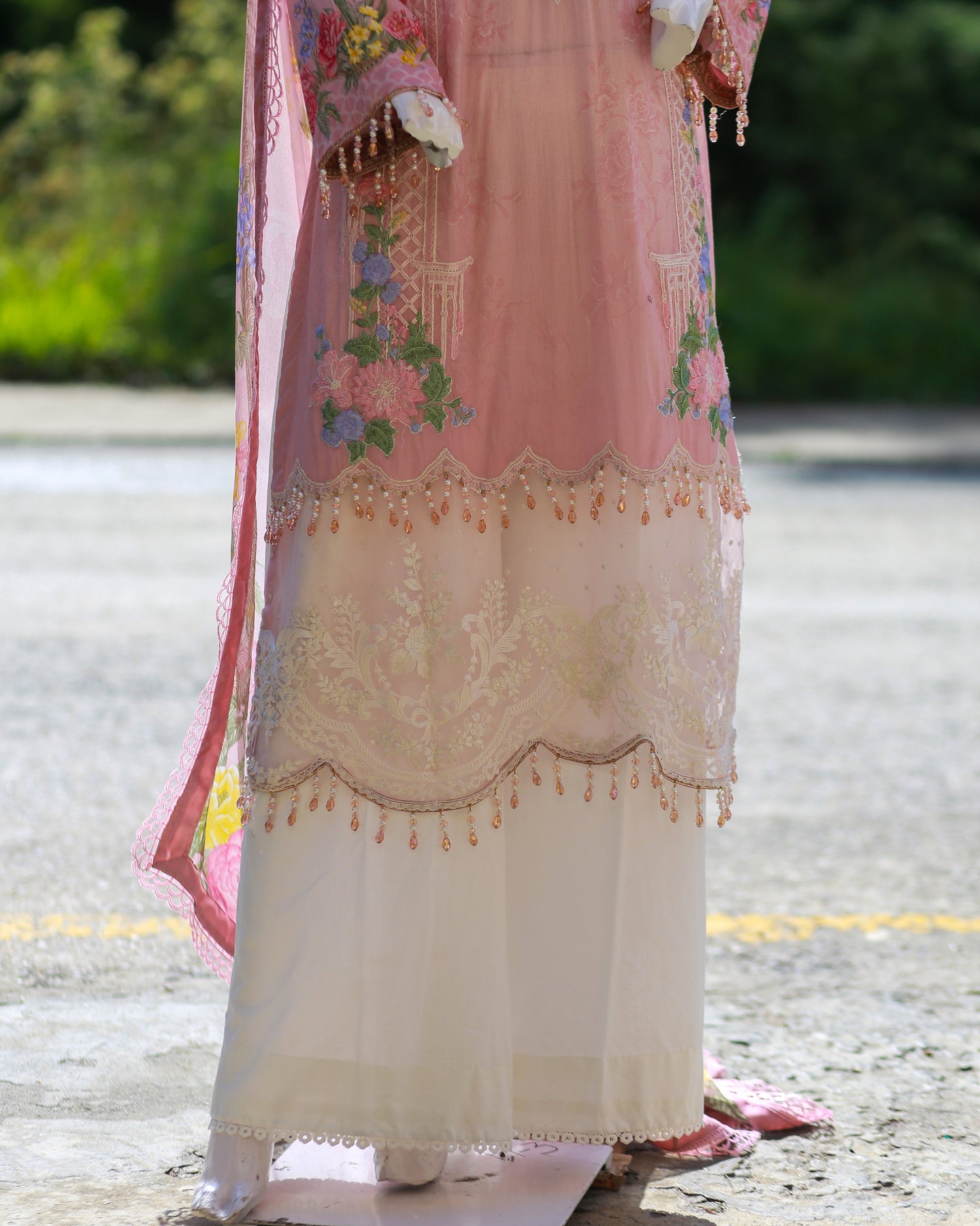 Embrace soft feminine elegance with this 3-piece Maria.B ensemble in a graceful tea pink tone. The lawn shirt features embroidered thread and sequins work, beautifully complemented with lace detailing and tassel accents, while the cutwork daman finished with tassel lace adds a refined designer touch—perfect for sophisticated daytime wear and festive gatherings.