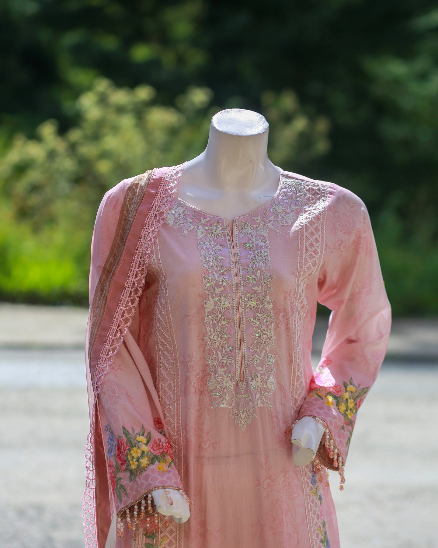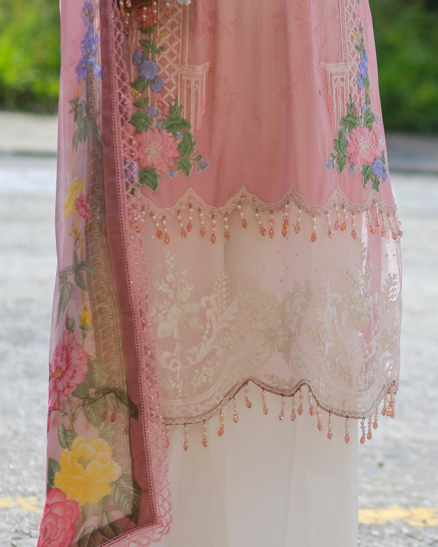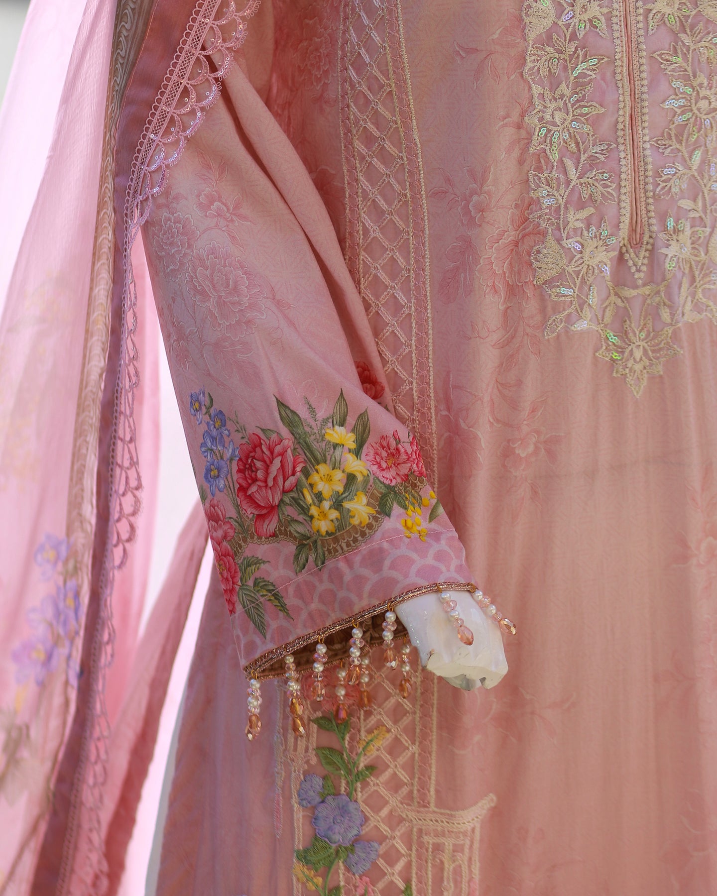 Embrace soft feminine elegance with this 3-piece Maria.B ensemble in a graceful tea pink tone. The lawn shirt features embroidered thread and sequins work, beautifully complemented with lace detailing and tassel accents, while the cutwork daman finished with tassel lace adds a refined designer touch—perfect for sophisticated daytime wear and festive gatherings.