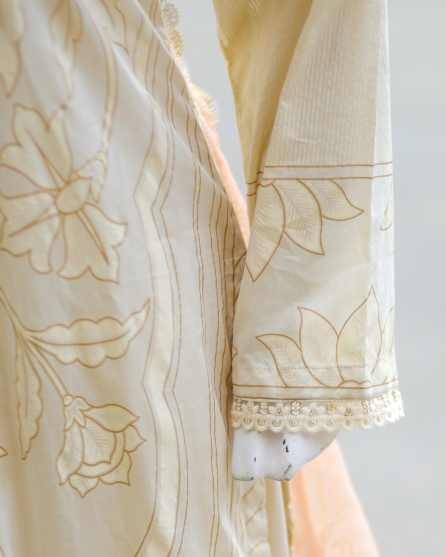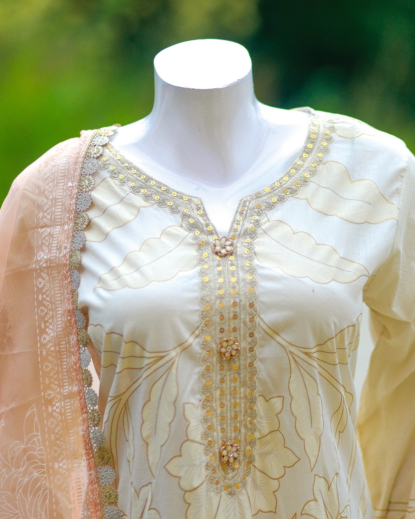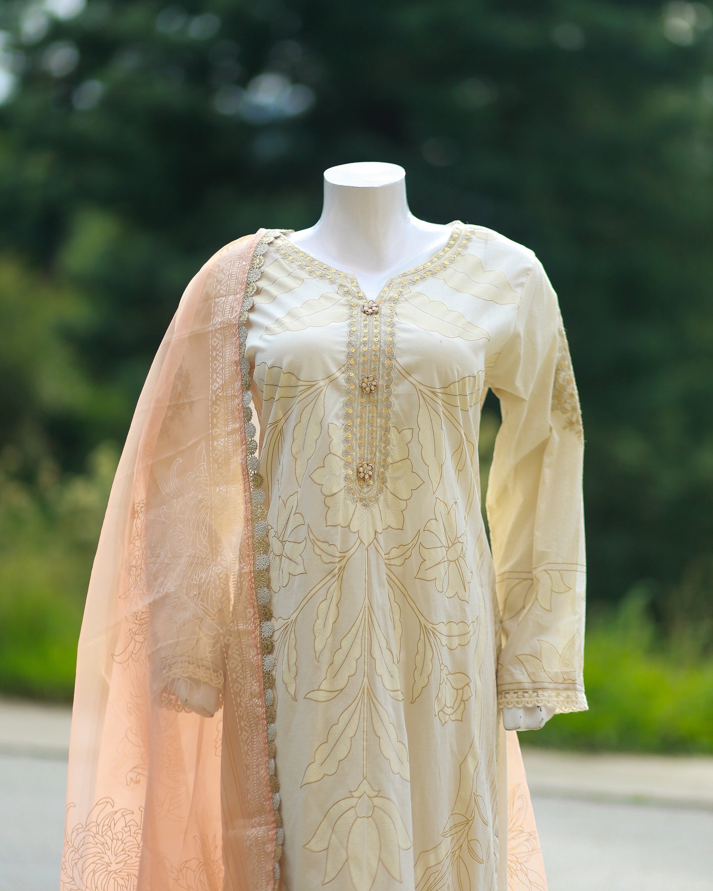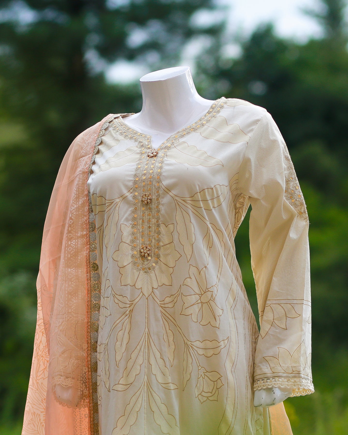 Step into effortless elegance with this 3-piece ivory and peach ensemble from Sana Safinaz. The printed lawn shirt is beautifully embroidered and adorned with buttons and lace, offering a refined and stylish look perfect for daytime or semi-formal occasions.
