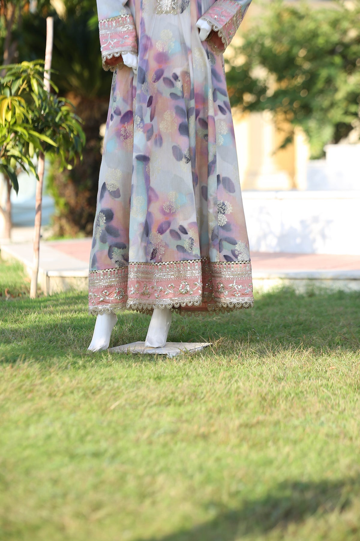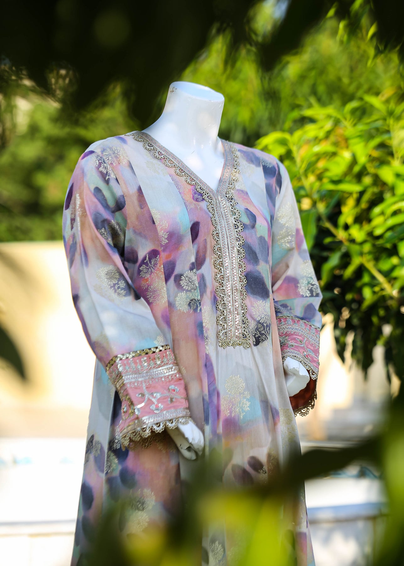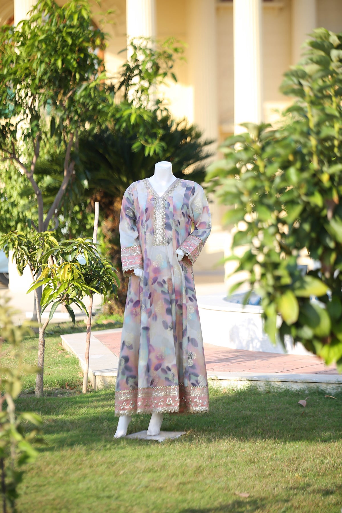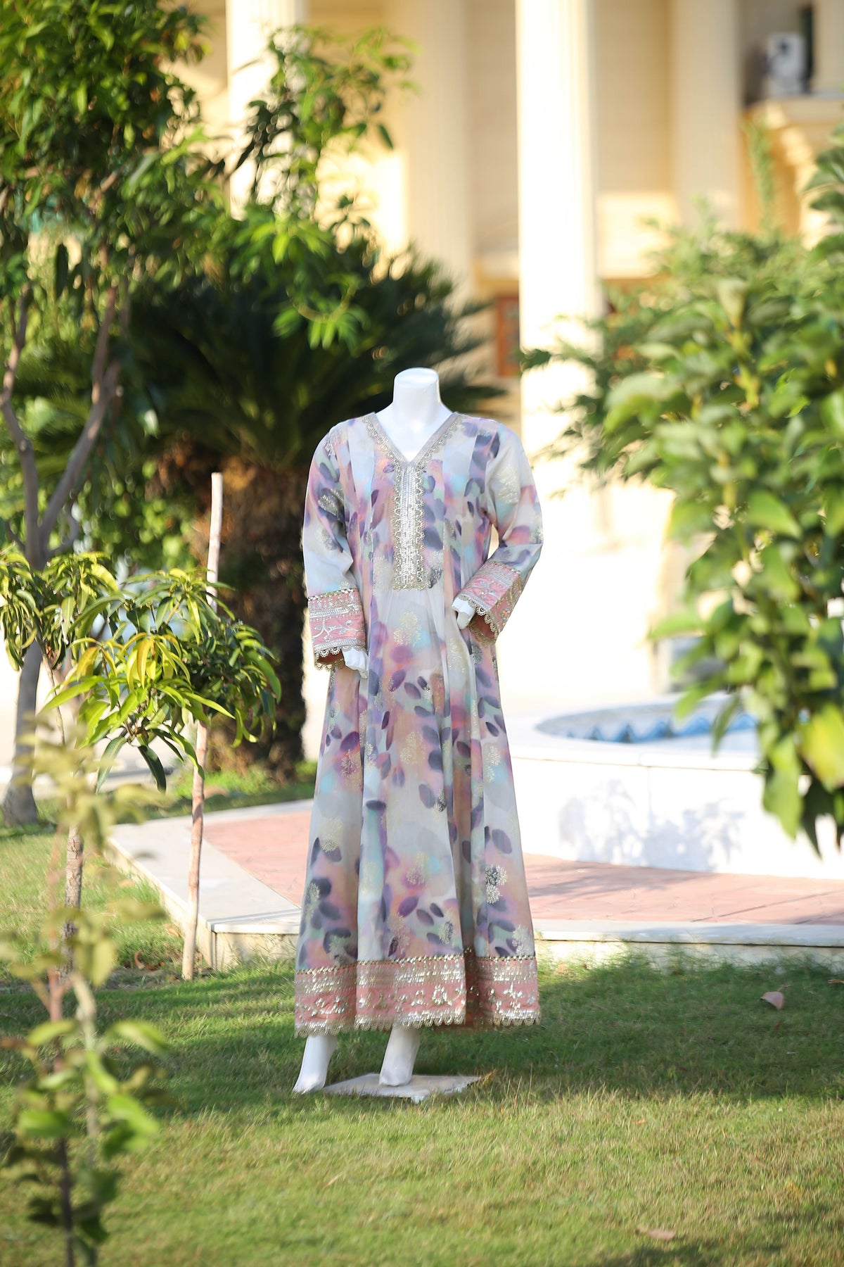Embrace timeless elegance with this 1-piece mauve/lavender/lilac maxi from Rawah, designed to make a chic and graceful statement. The silk jacquard shirt is adorned with intricate sequins and thread work, enhanced with a stylish lace for a sophisticated finish.