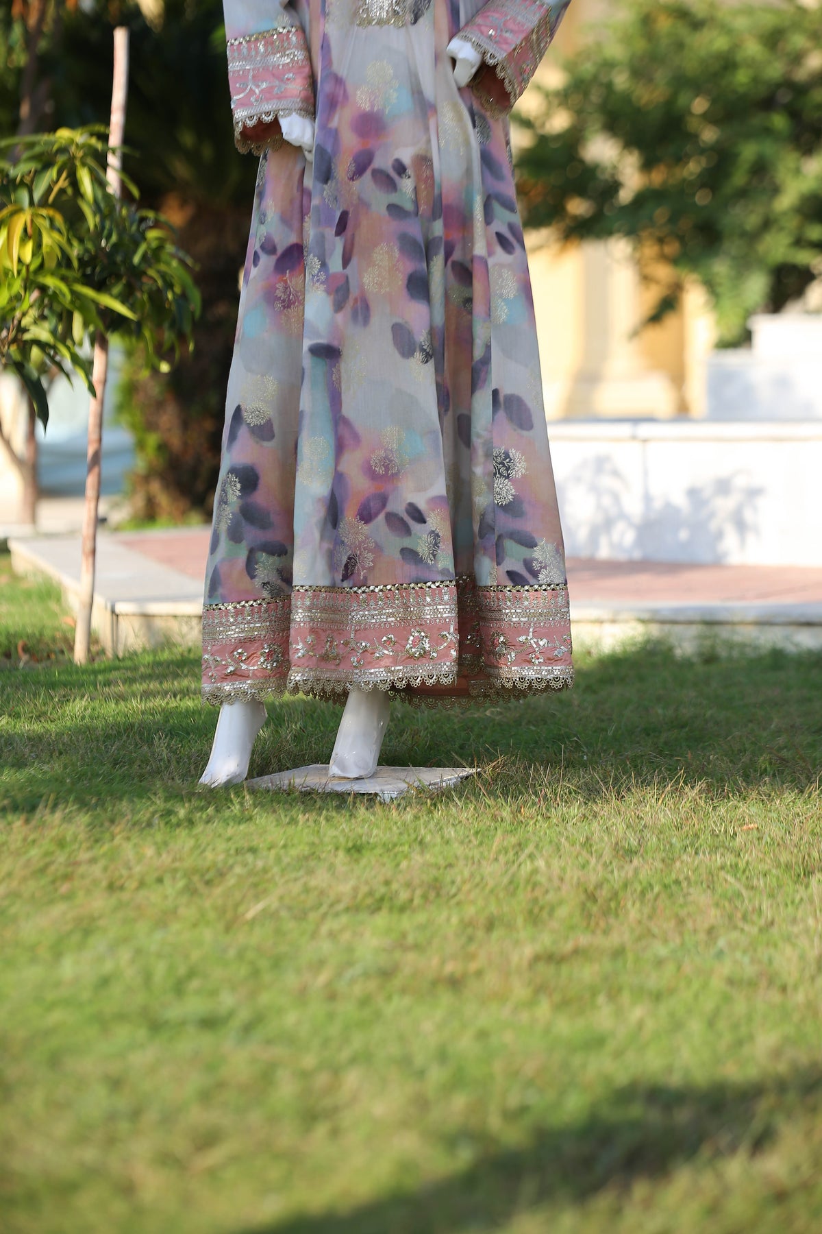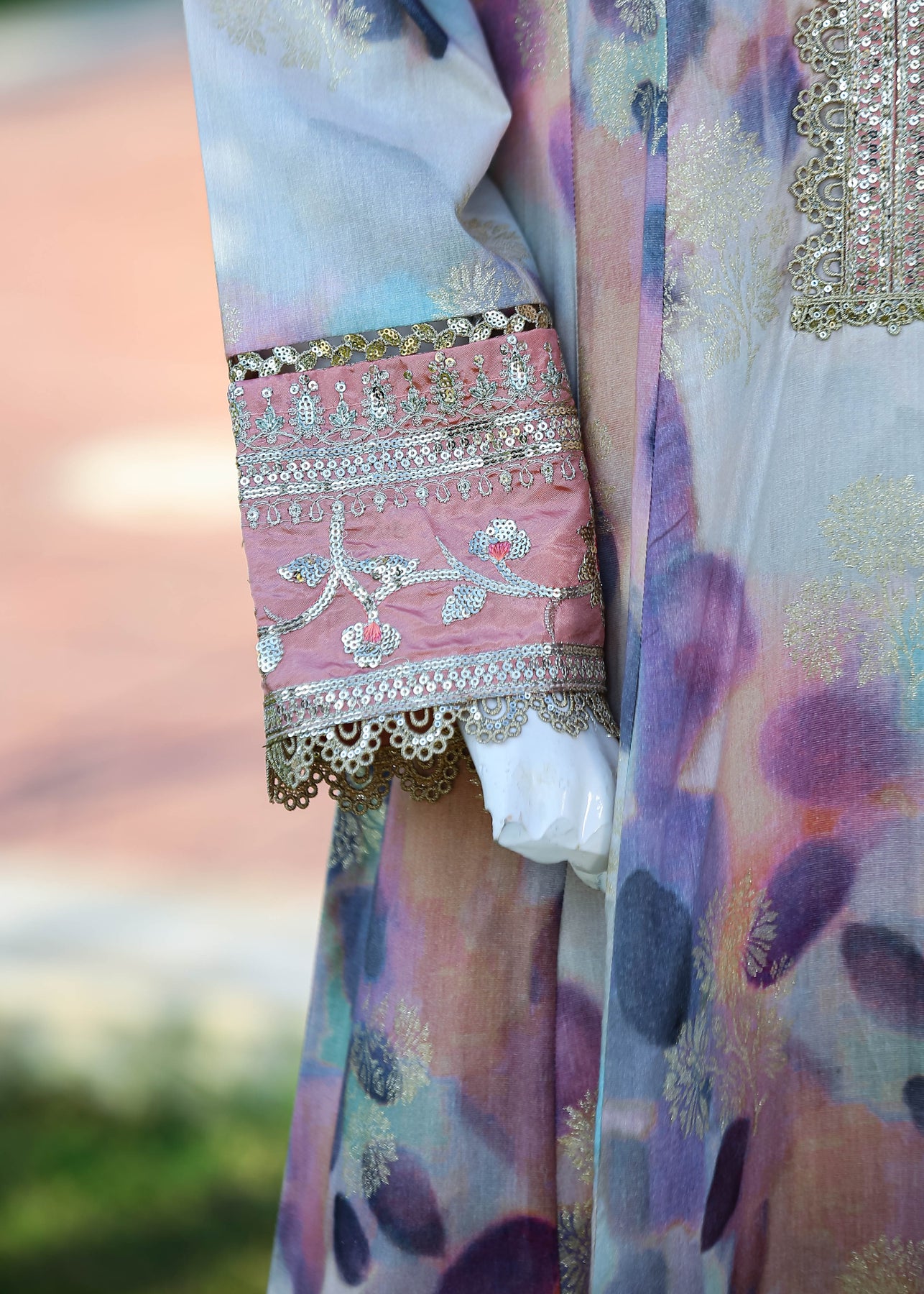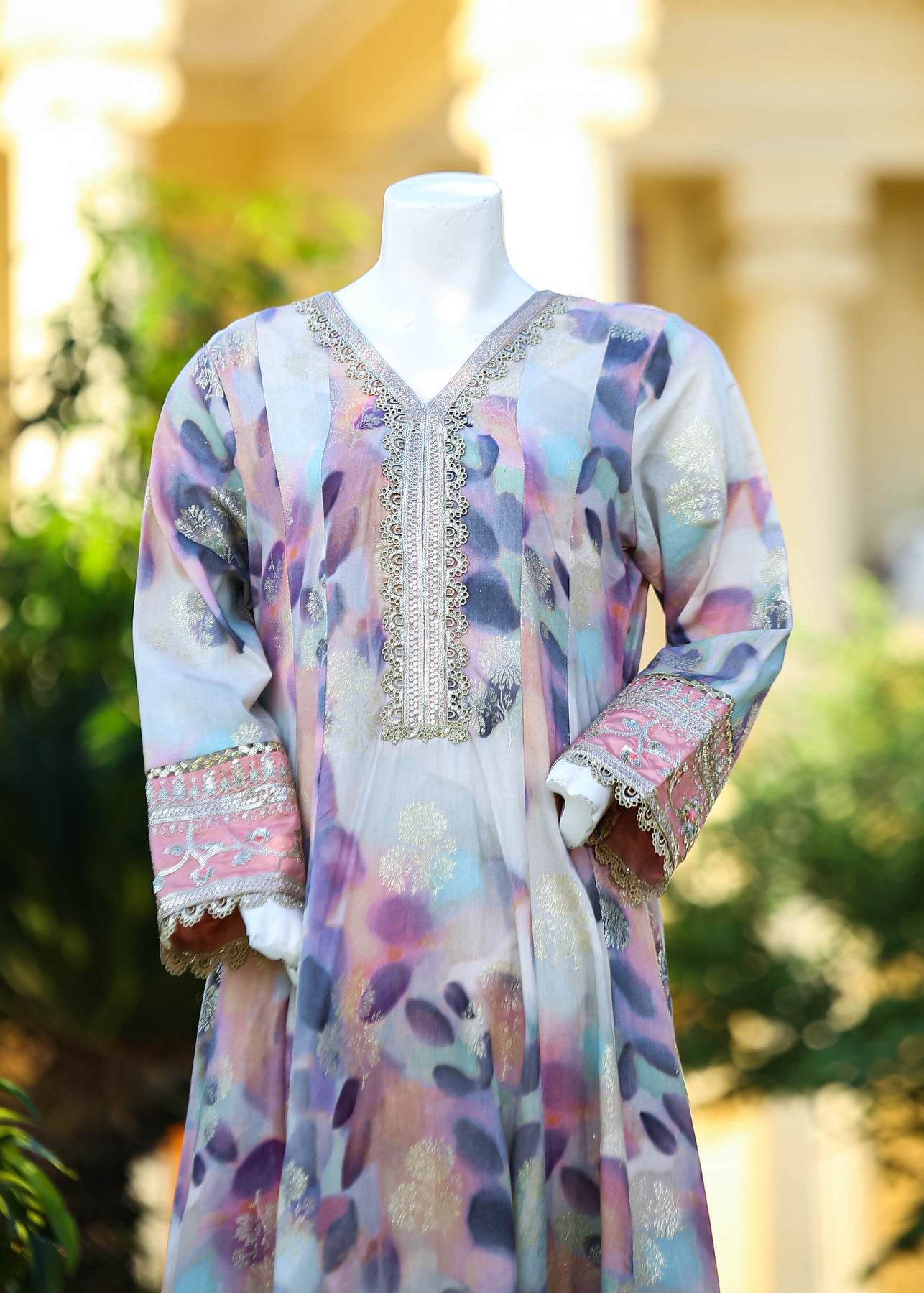 Embrace timeless elegance with this 1-piece mauve/lavender/lilac maxi from Rawah, designed to make a chic and graceful statement. The silk jacquard shirt is adorned with intricate sequins and thread work, enhanced with a stylish lace for a sophisticated finish.