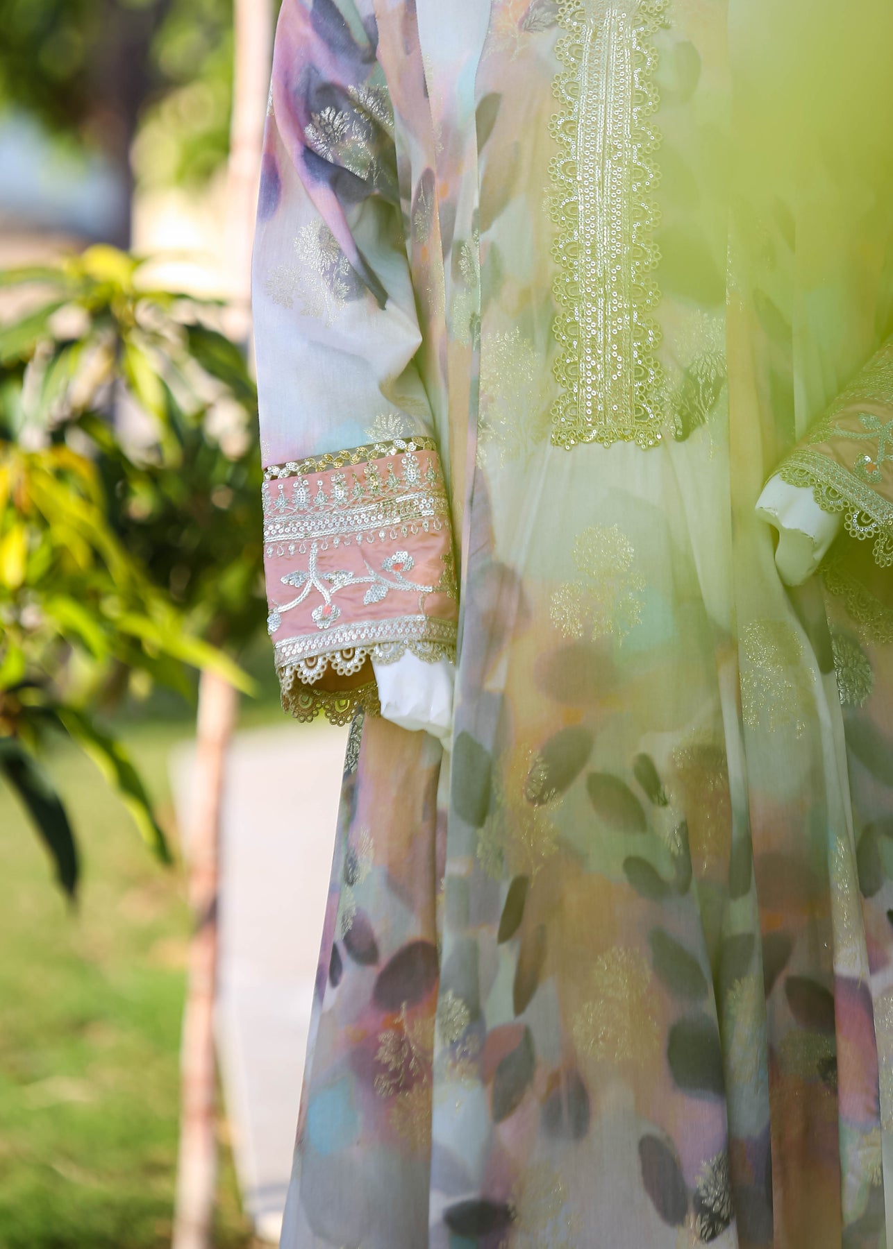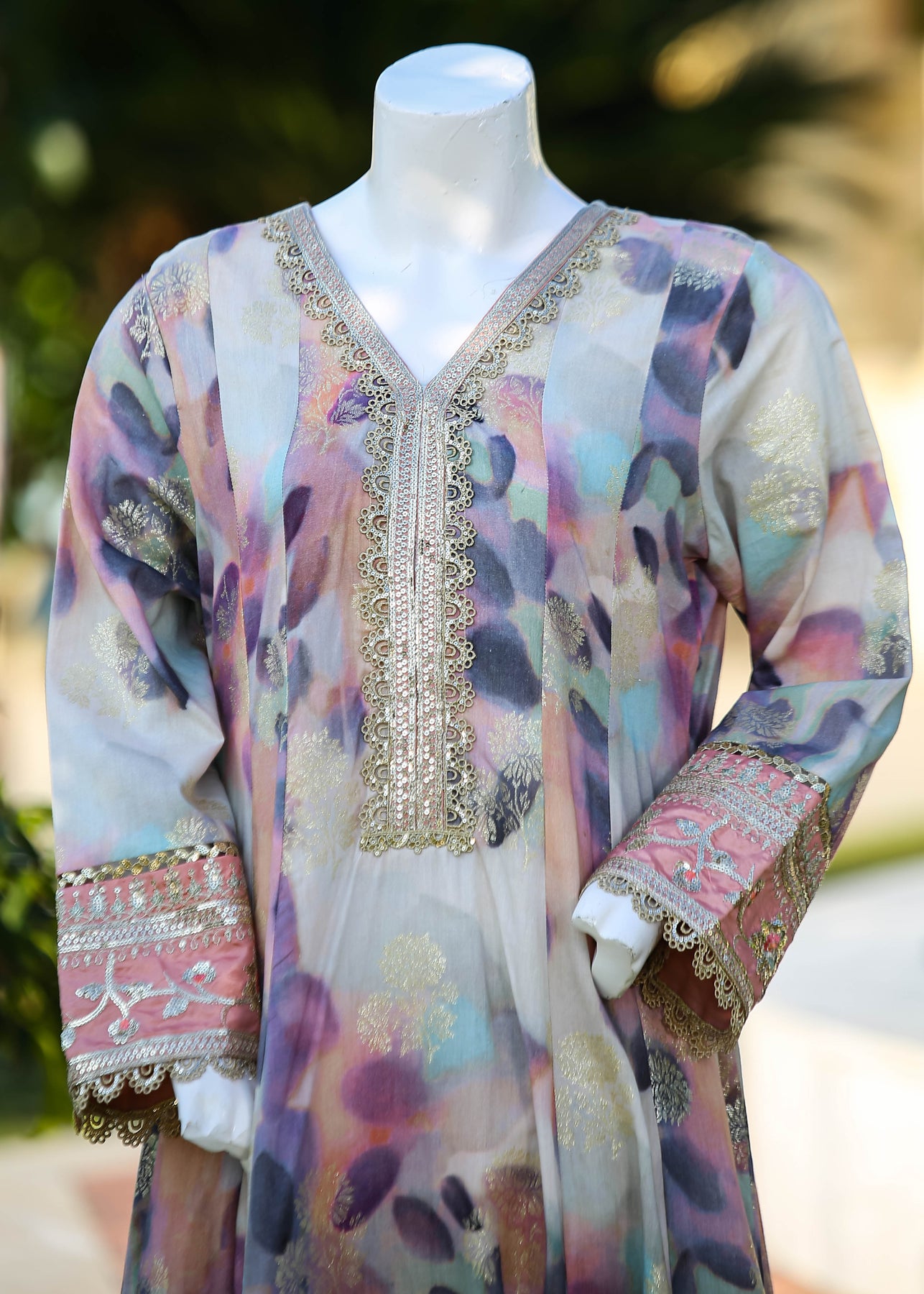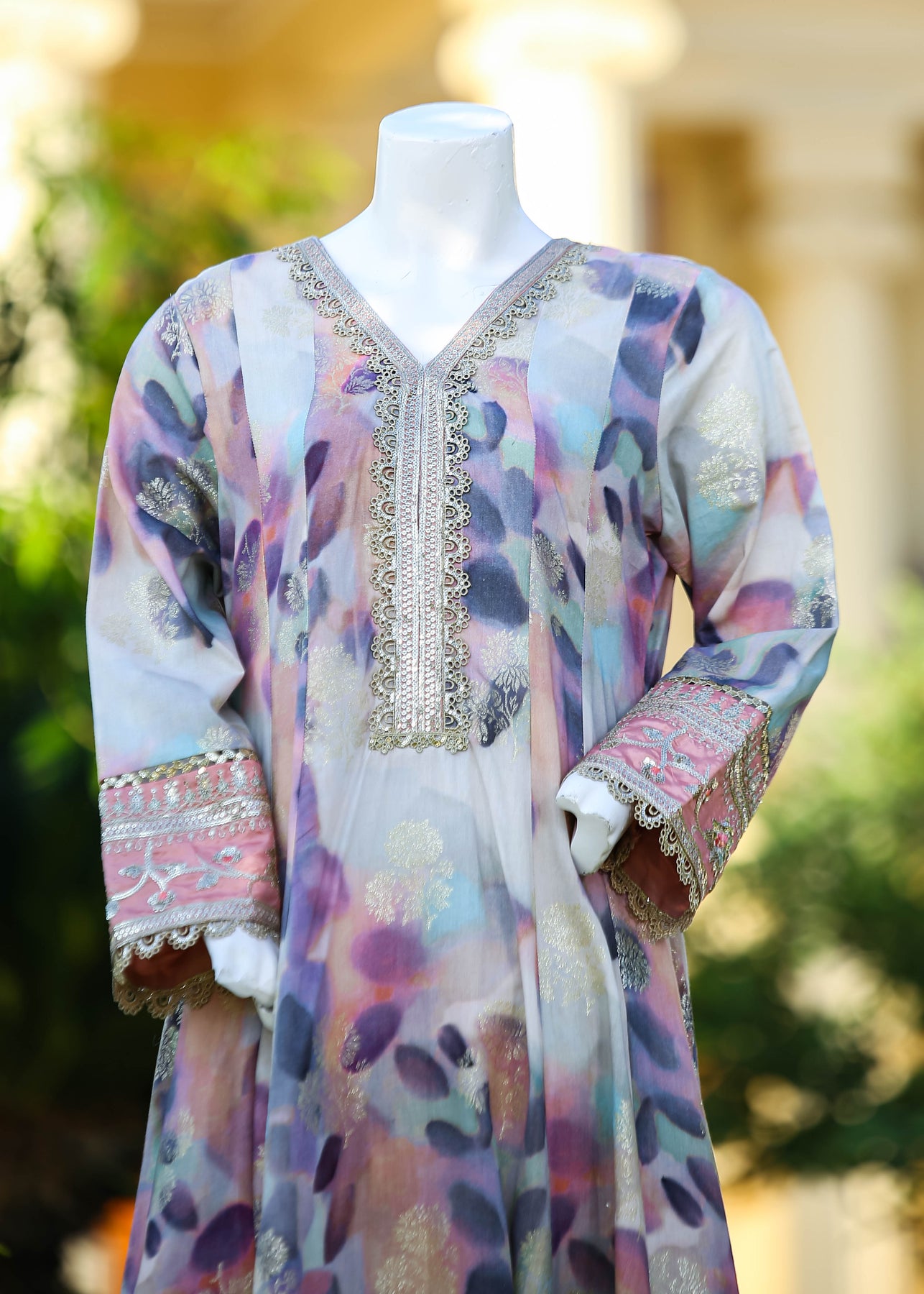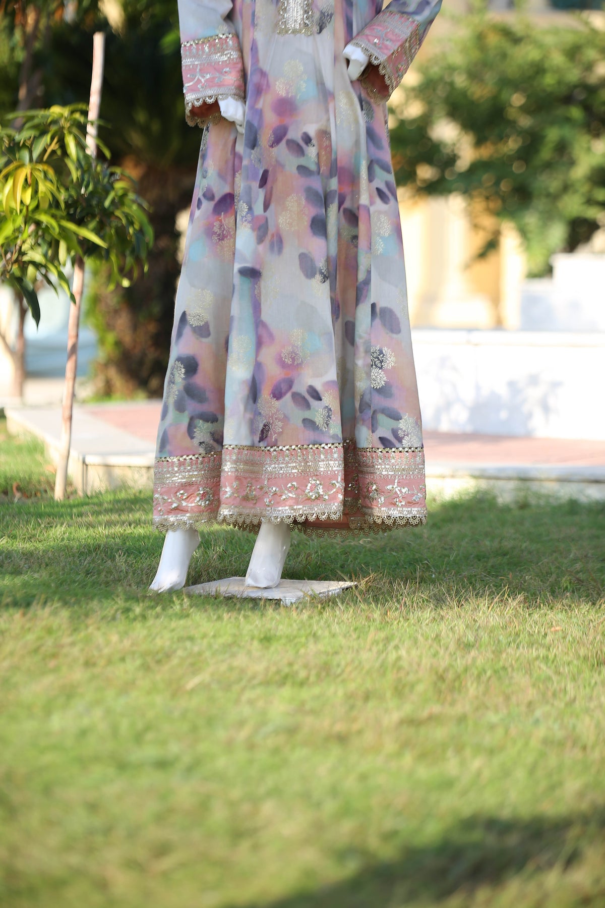 Embrace timeless elegance with this 1-piece mauve/lavender/lilac maxi from Rawah, designed to make a chic and graceful statement. The silk jacquard shirt is adorned with intricate sequins and thread work, enhanced with a stylish lace for a sophisticated finish.