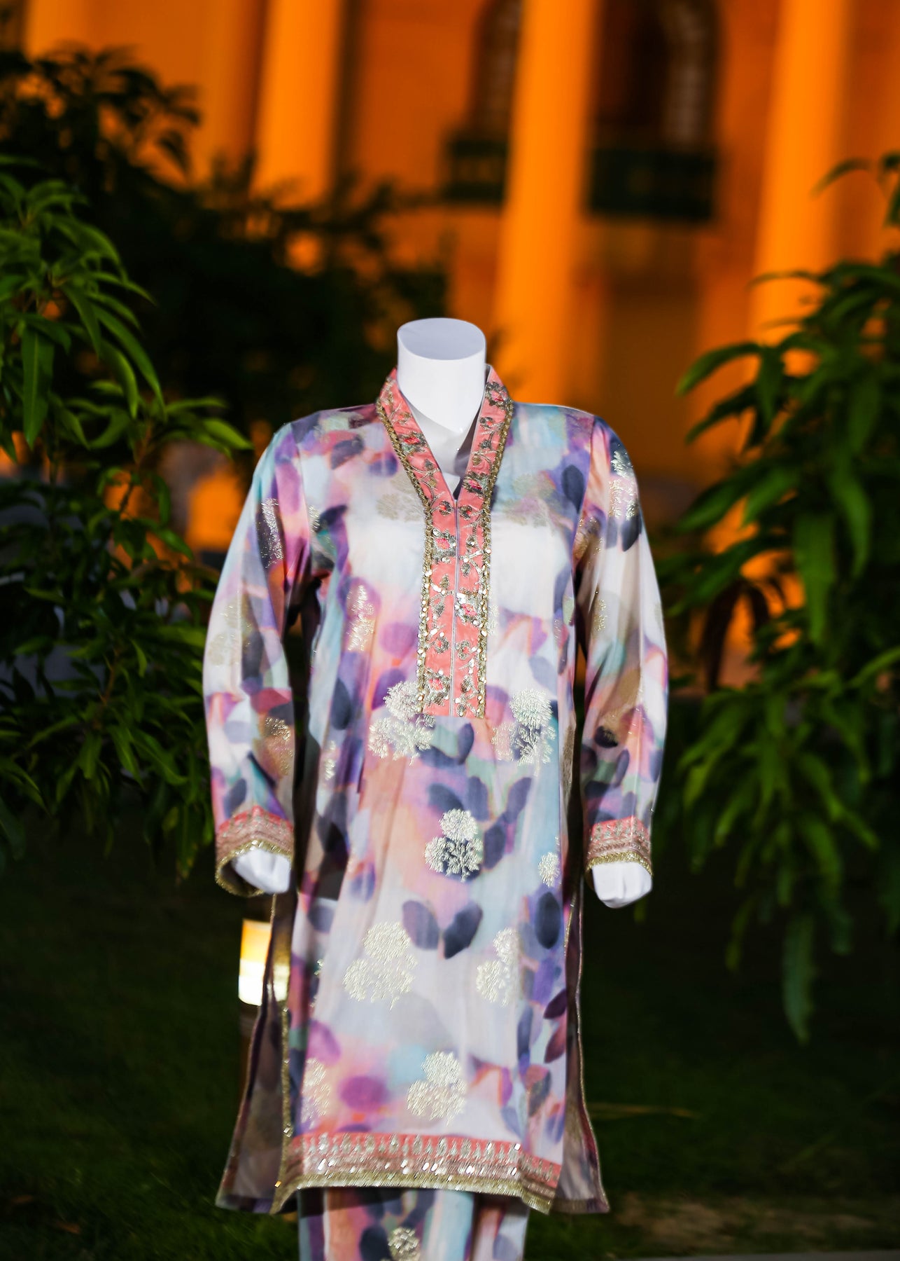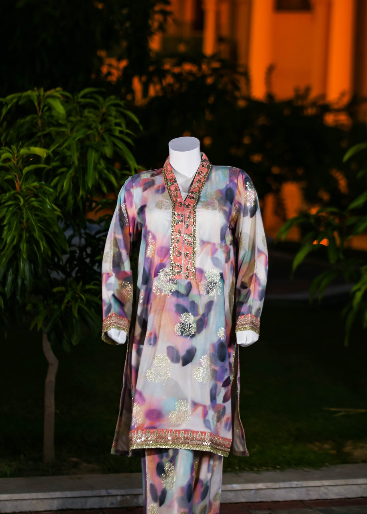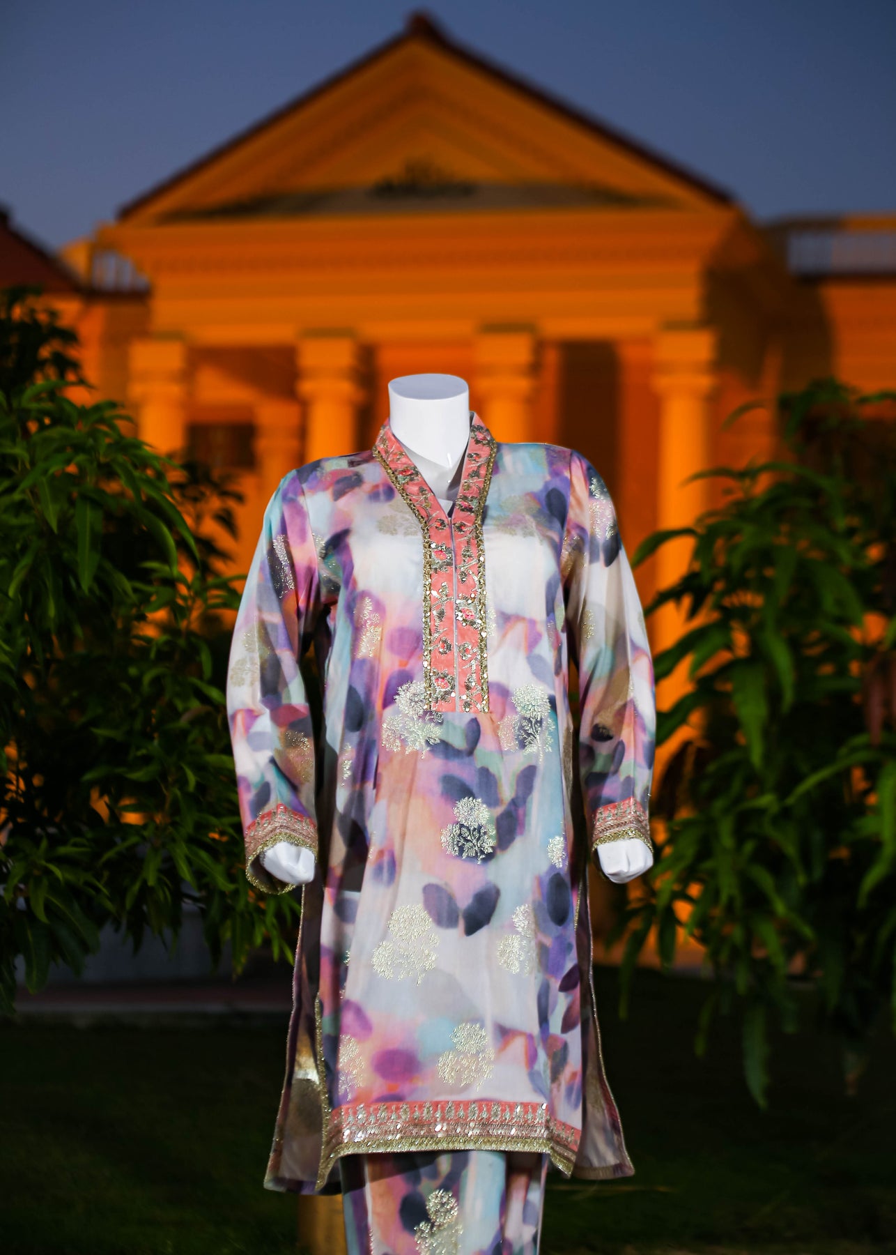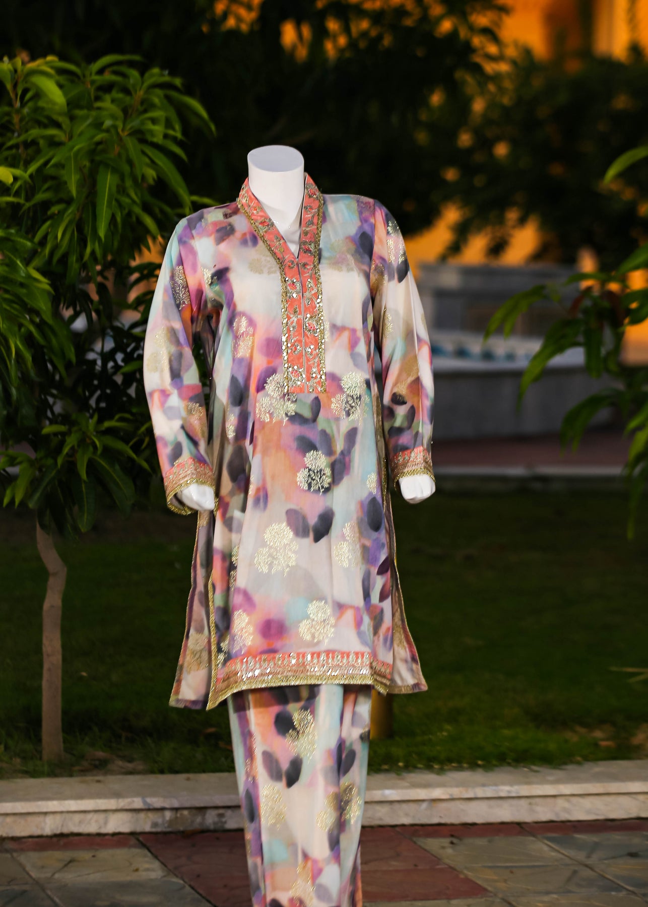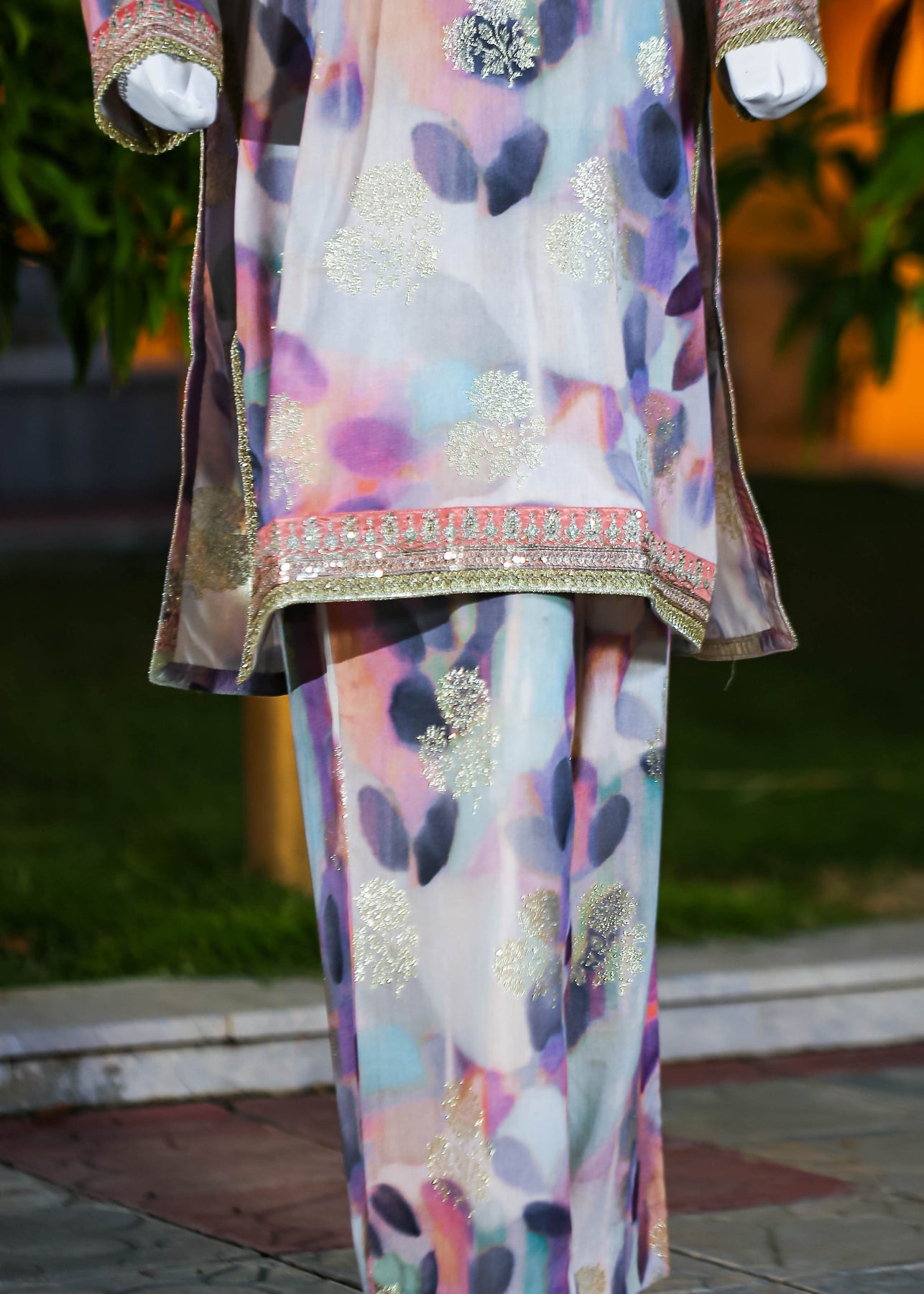 Paired with a jacquard silk trouser, this outfit perfectly balances ornate craftsmanship with sophisticated simplicity, making it ideal for formal occasions and special gatherings.