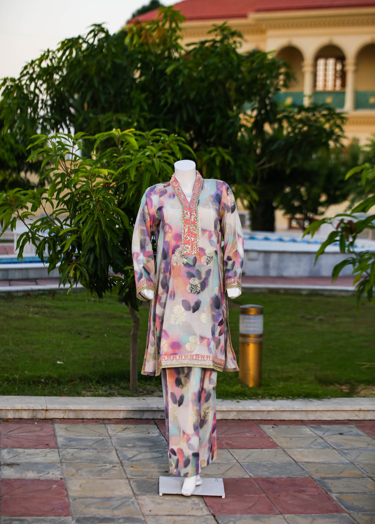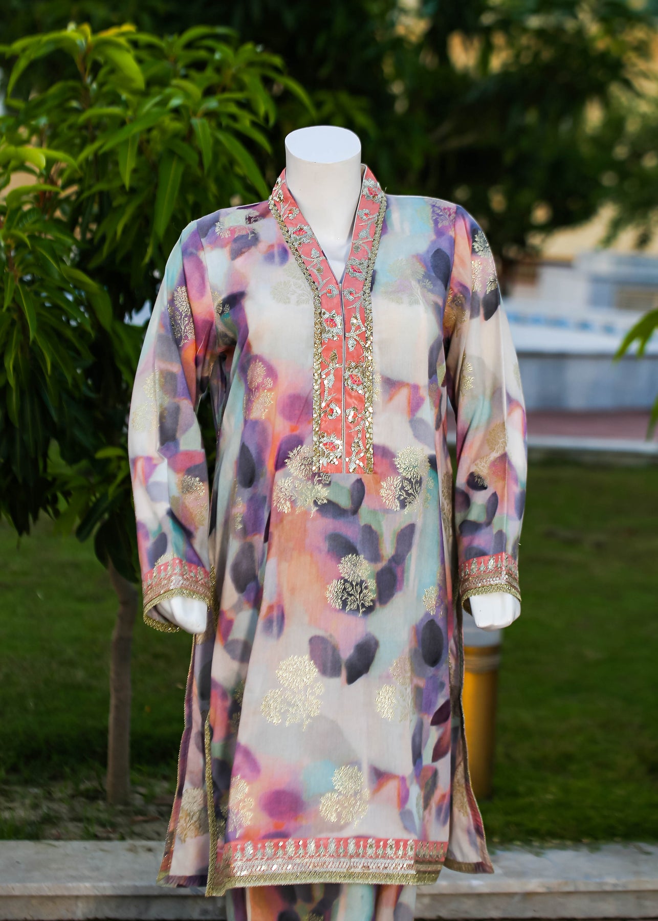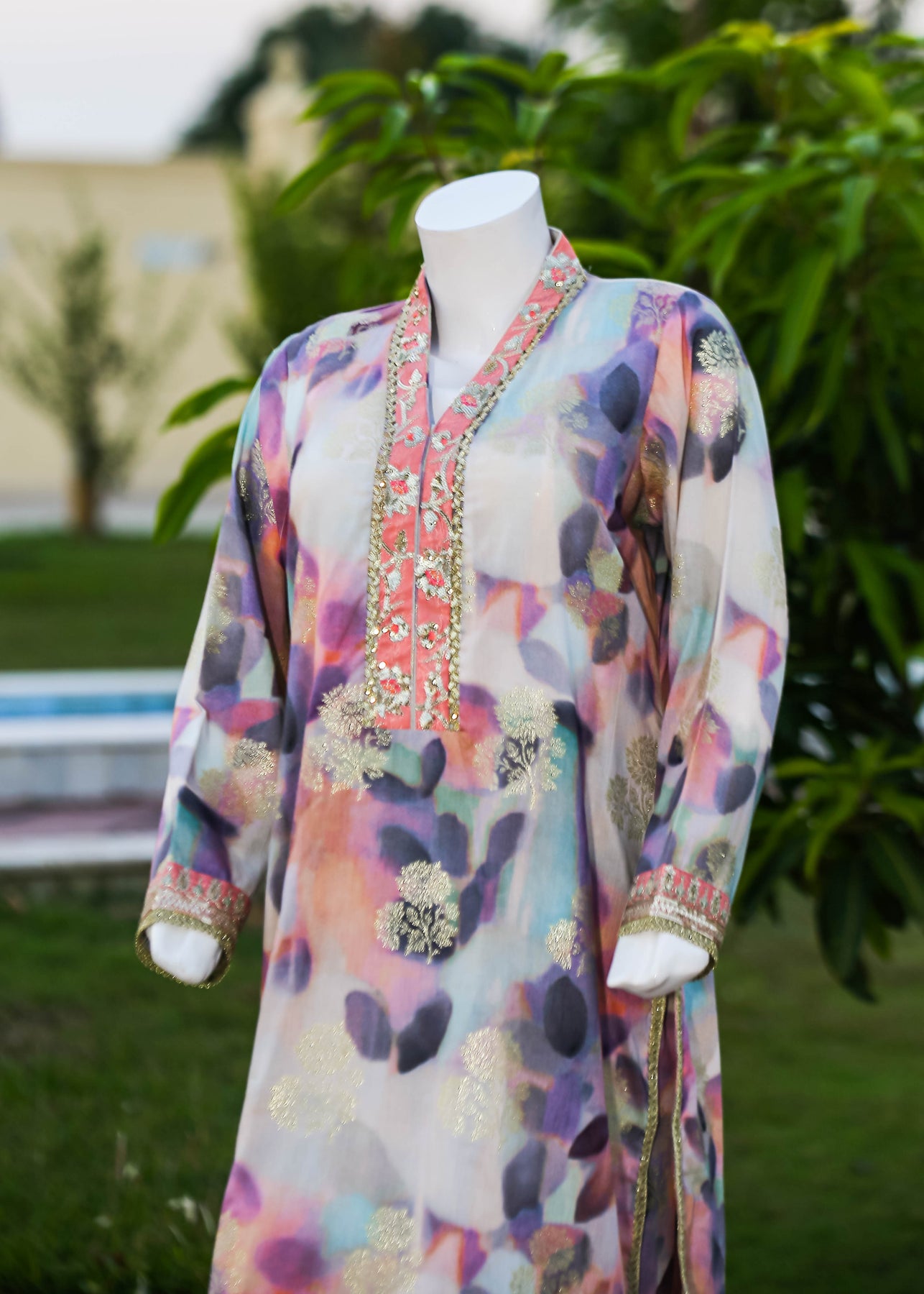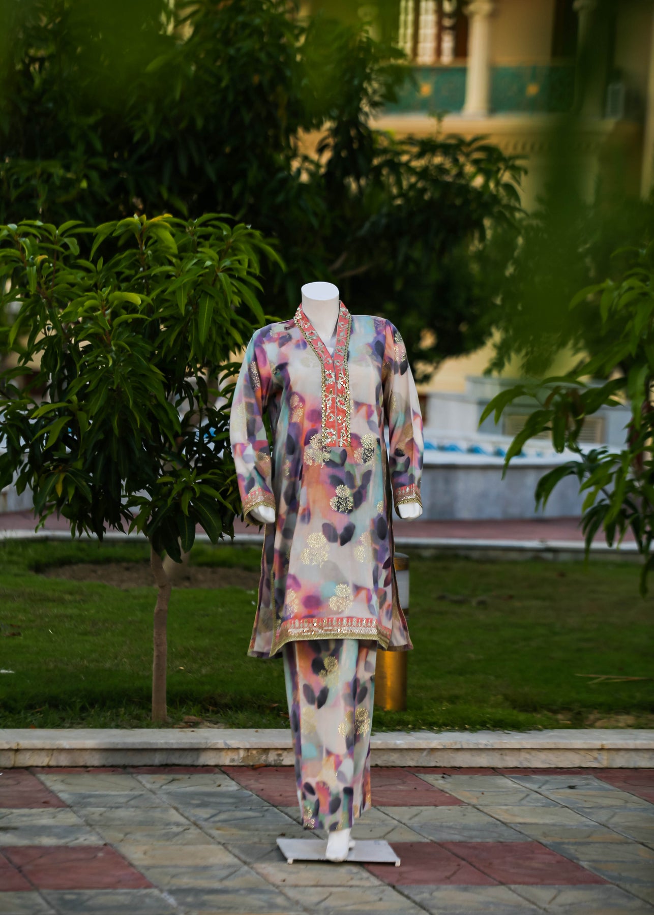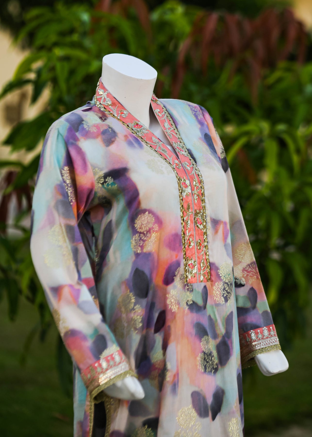 Paired with a jacquard silk trouser, this outfit perfectly balances ornate craftsmanship with sophisticated simplicity, making it ideal for formal occasions and special gatherings.