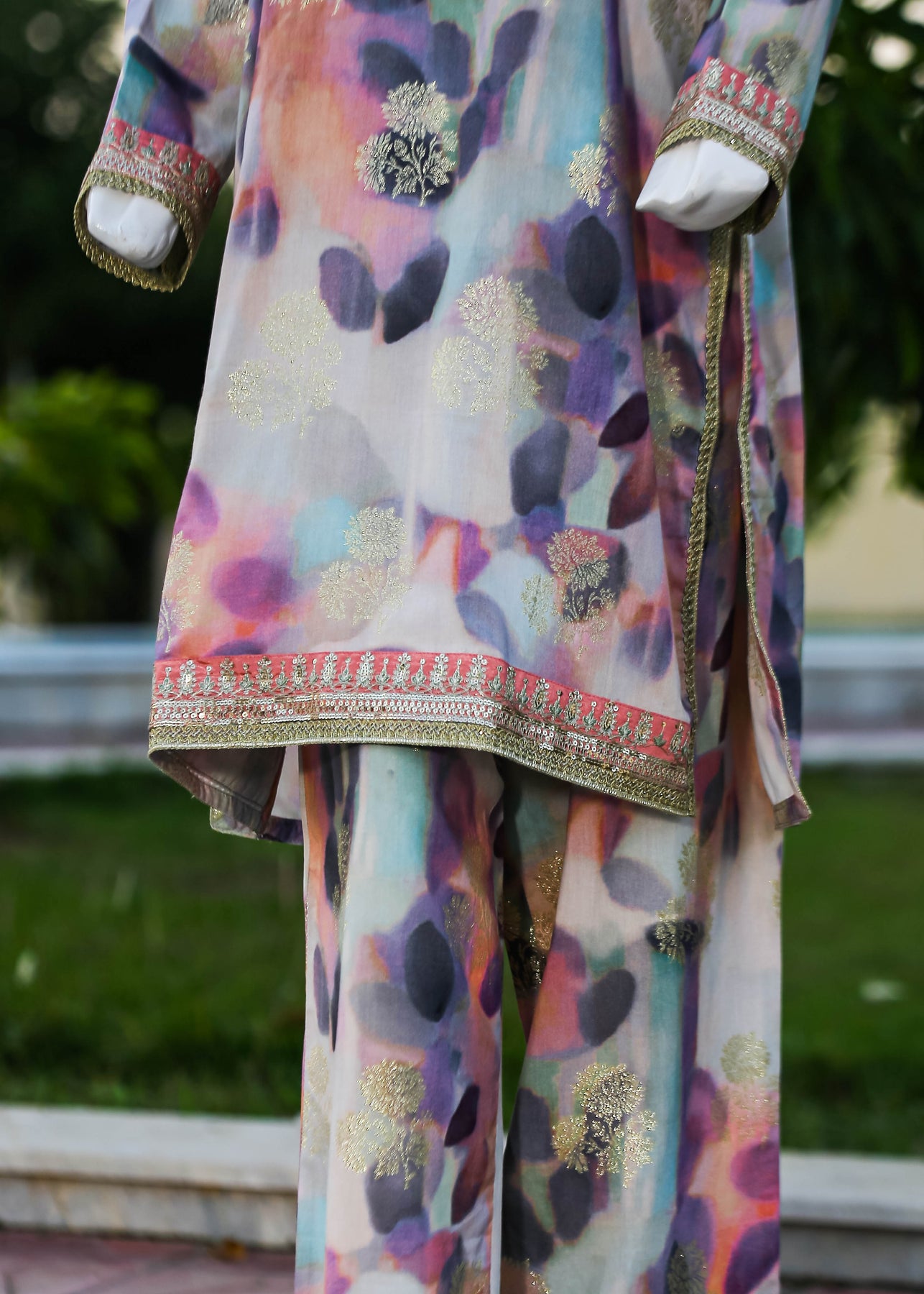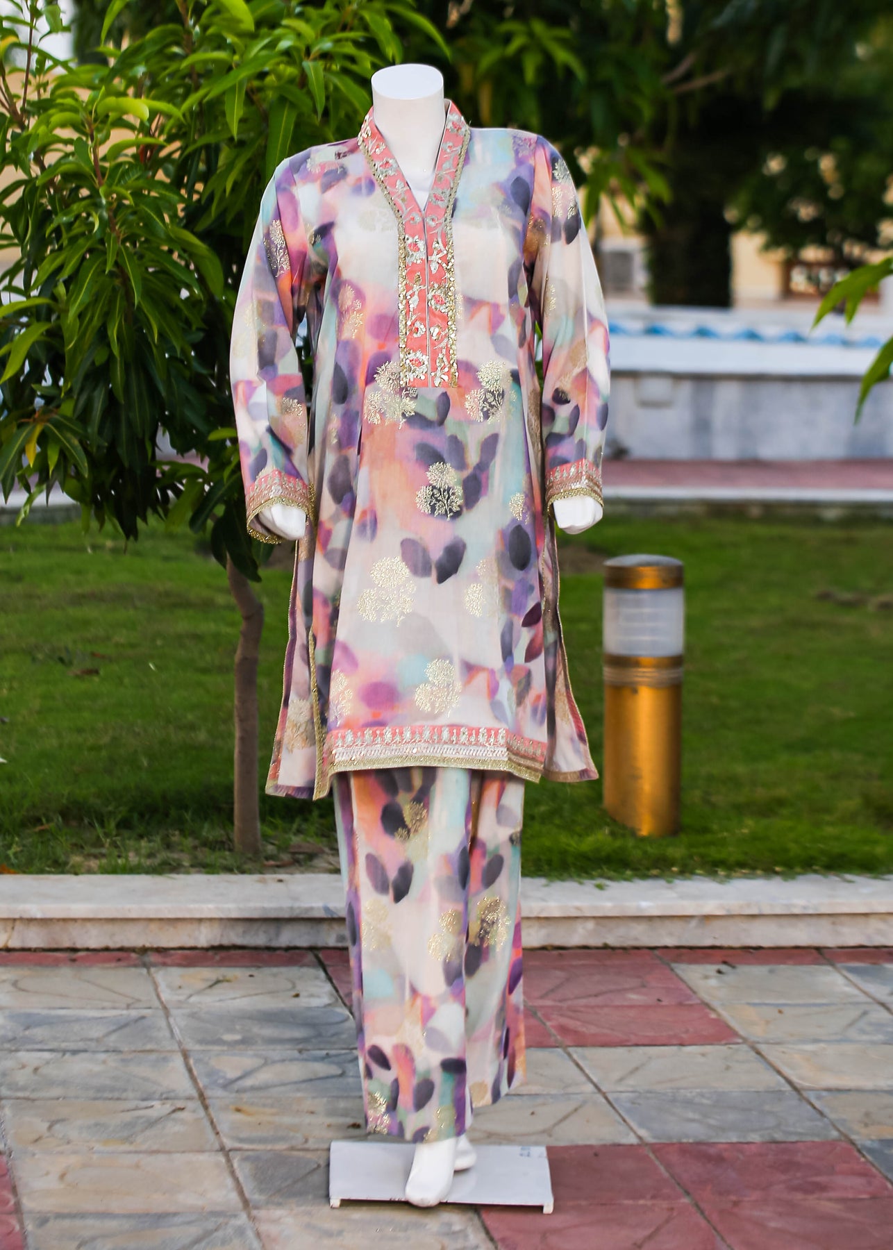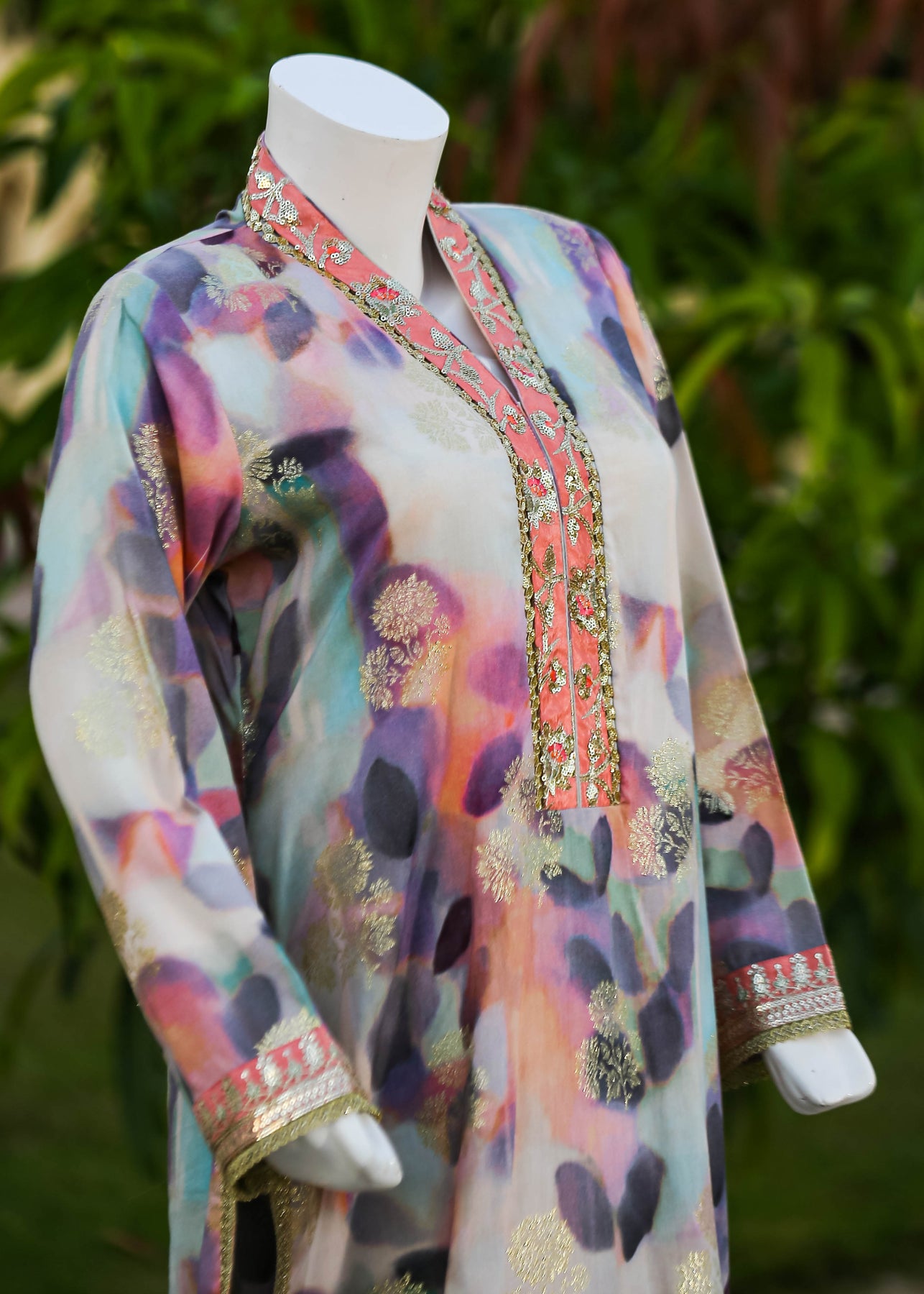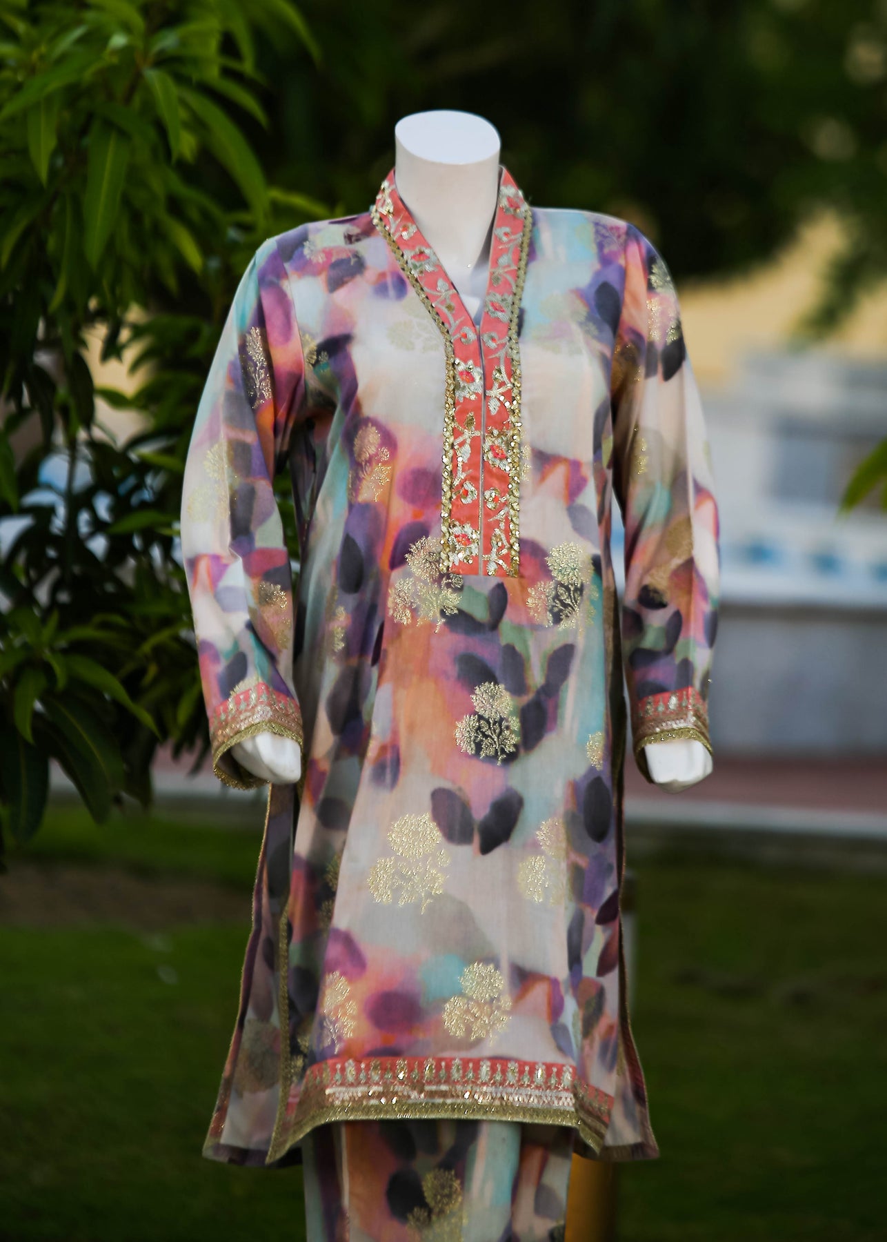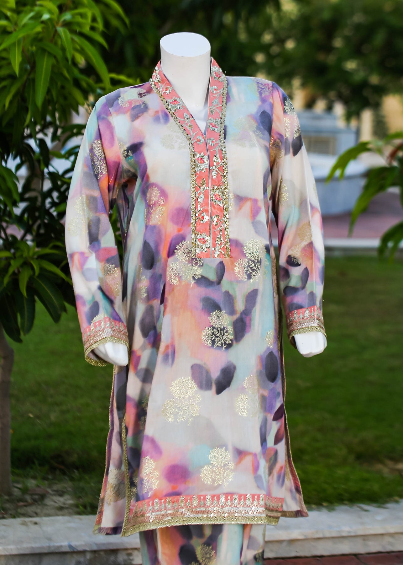 Paired with a jacquard silk trouser, this outfit perfectly balances ornate craftsmanship with sophisticated simplicity, making it ideal for formal occasions and special gatherings.