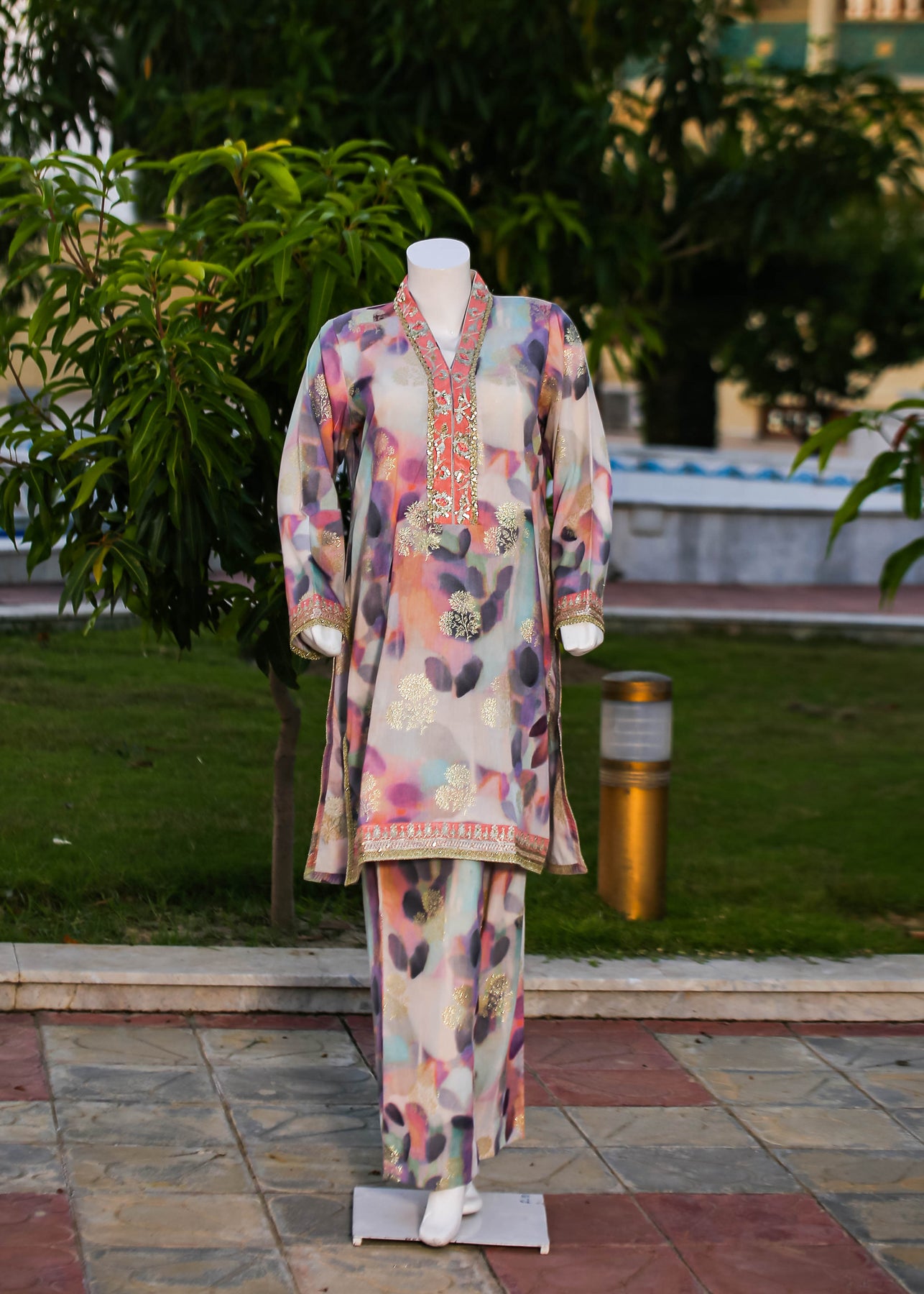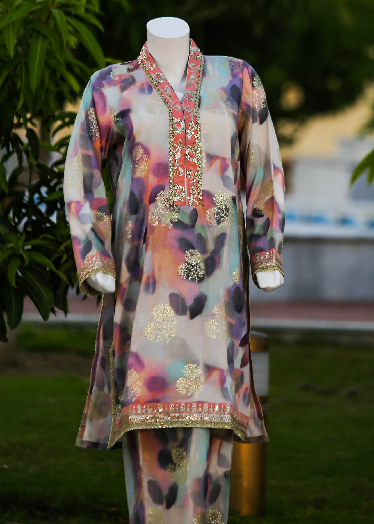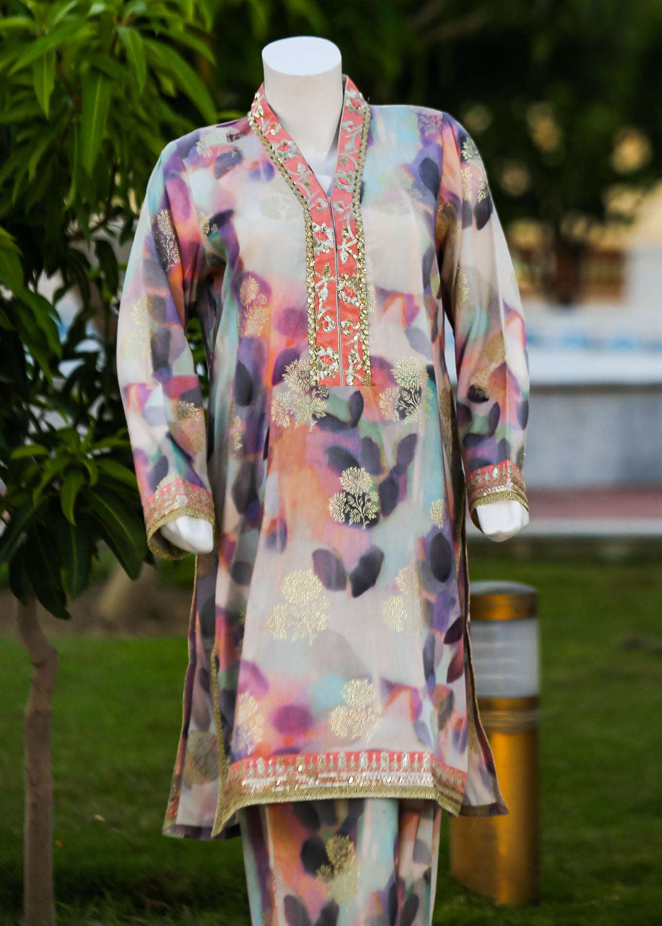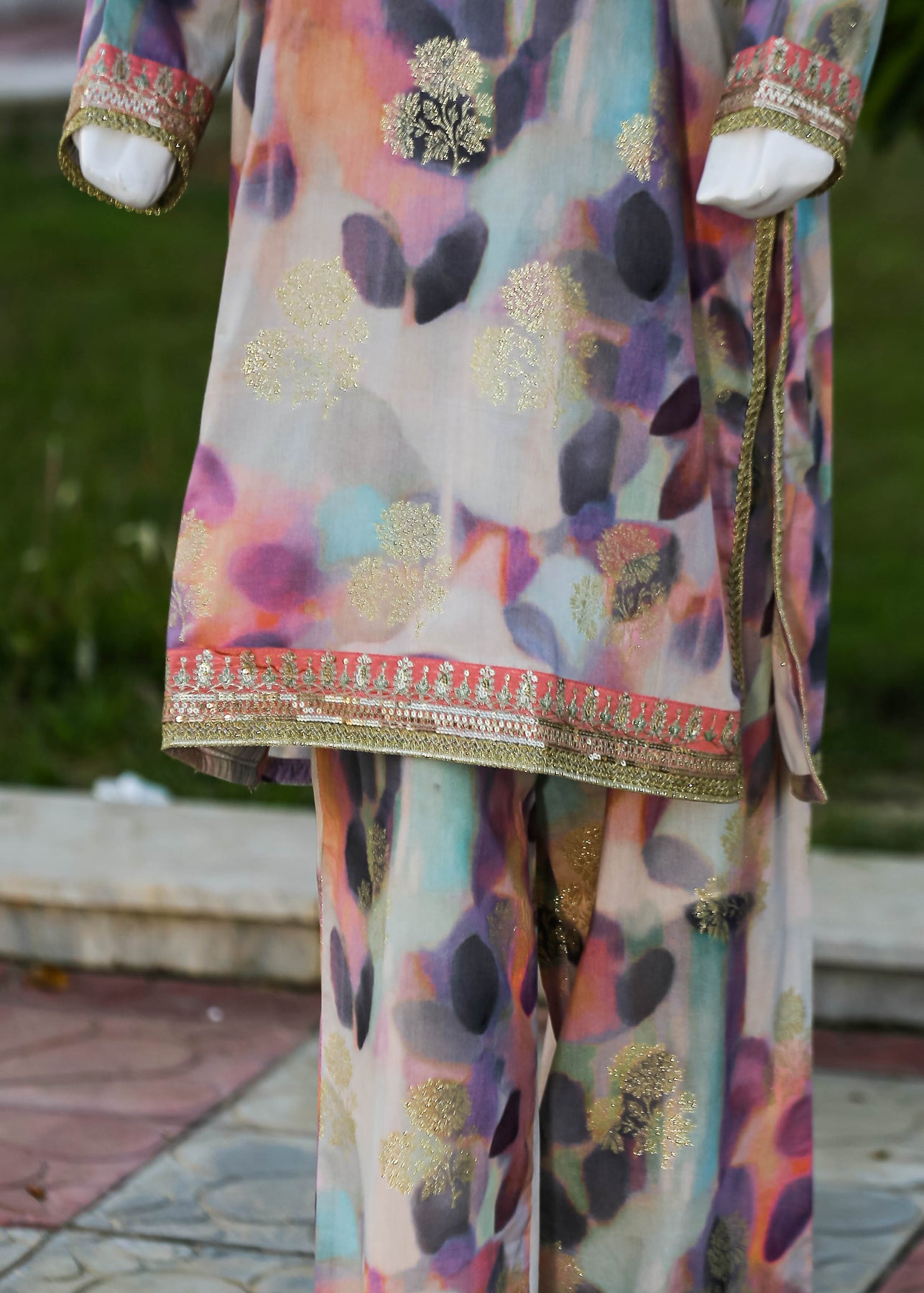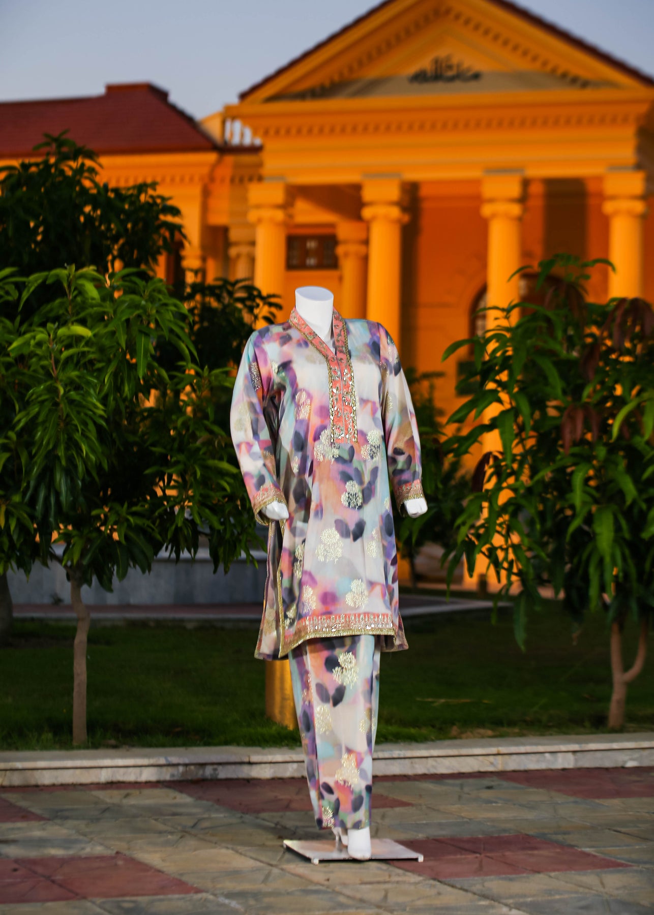 Paired with a jacquard silk trouser, this outfit perfectly balances ornate craftsmanship with sophisticated simplicity, making it ideal for formal occasions and special gatherings.