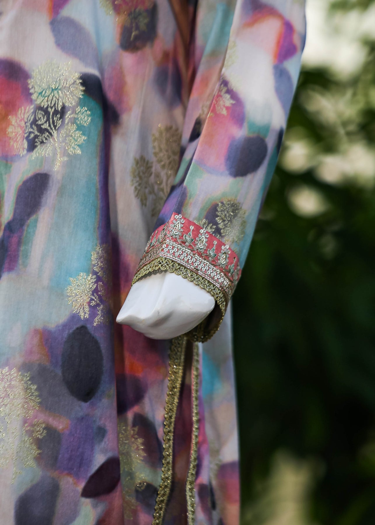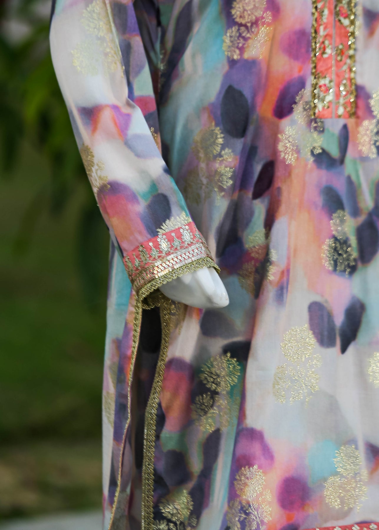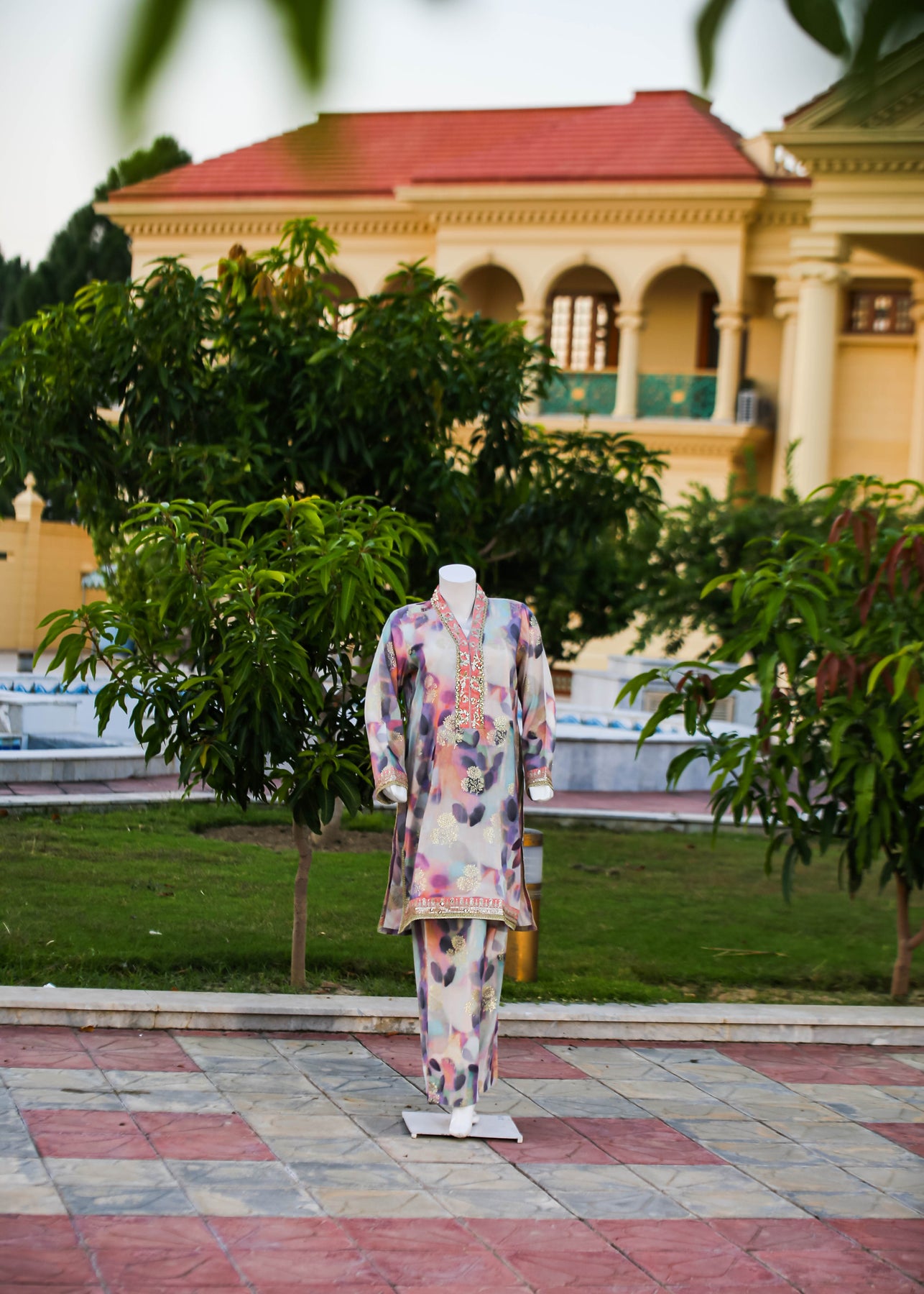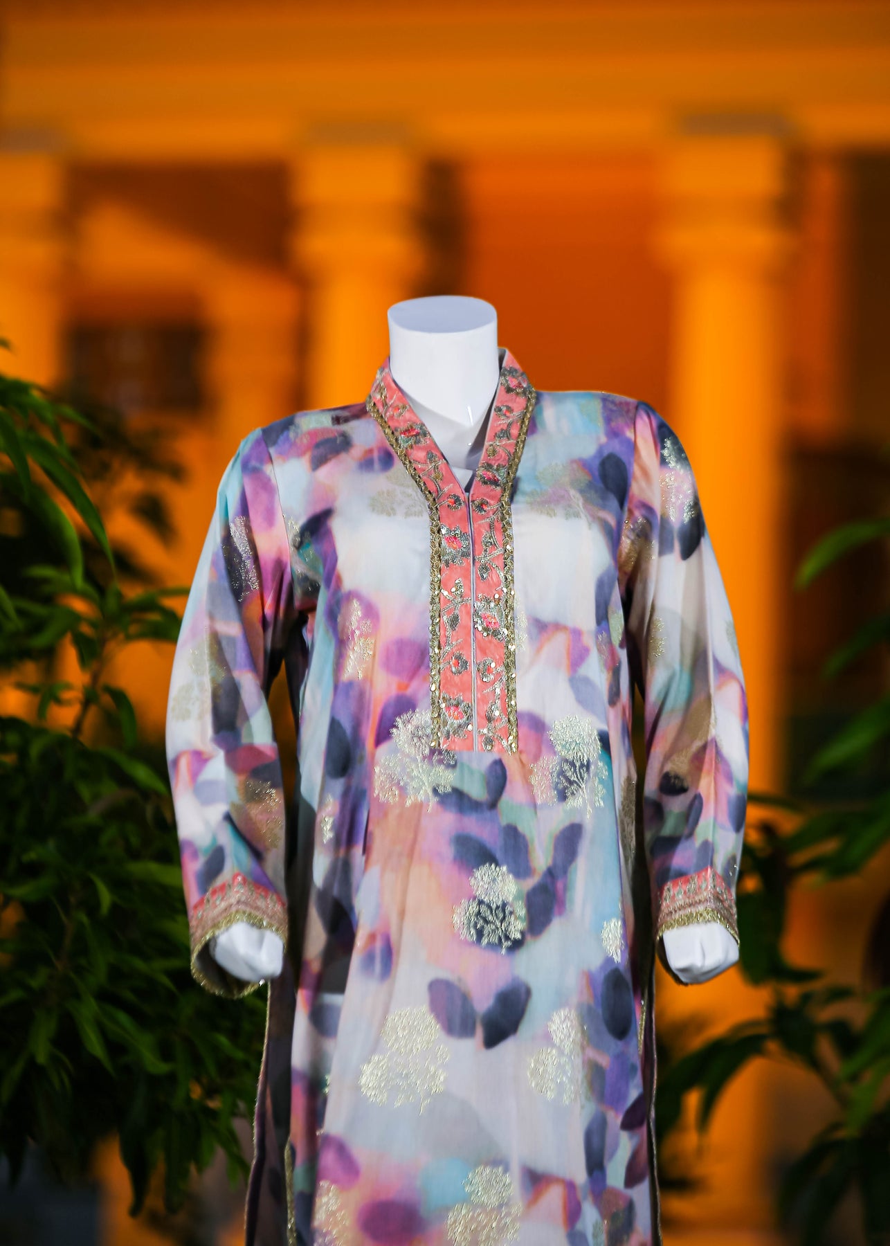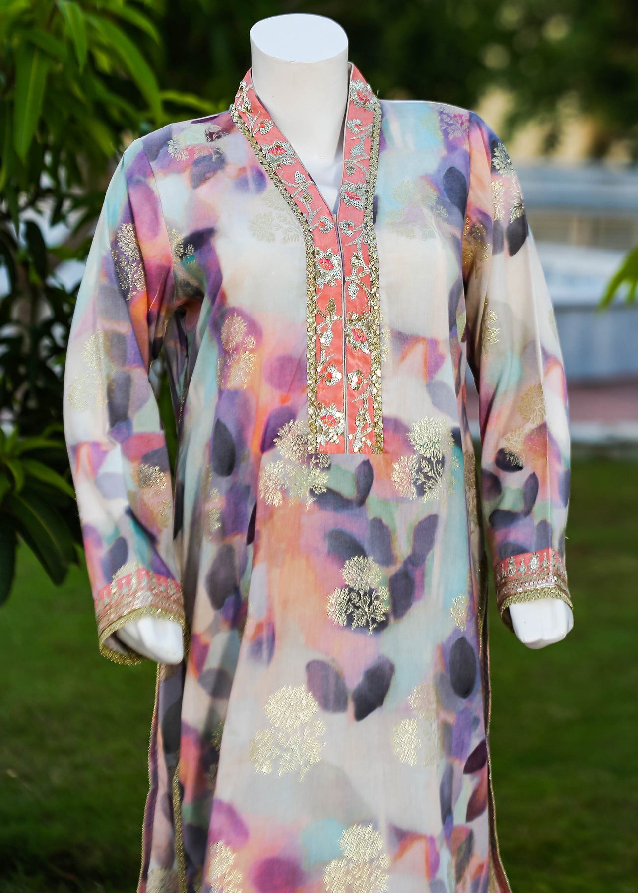Paired with a jacquard silk trouser, this outfit perfectly balances ornate craftsmanship with sophisticated simplicity, making it ideal for formal occasions and special gatherings.