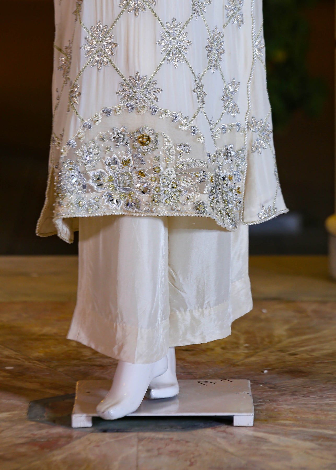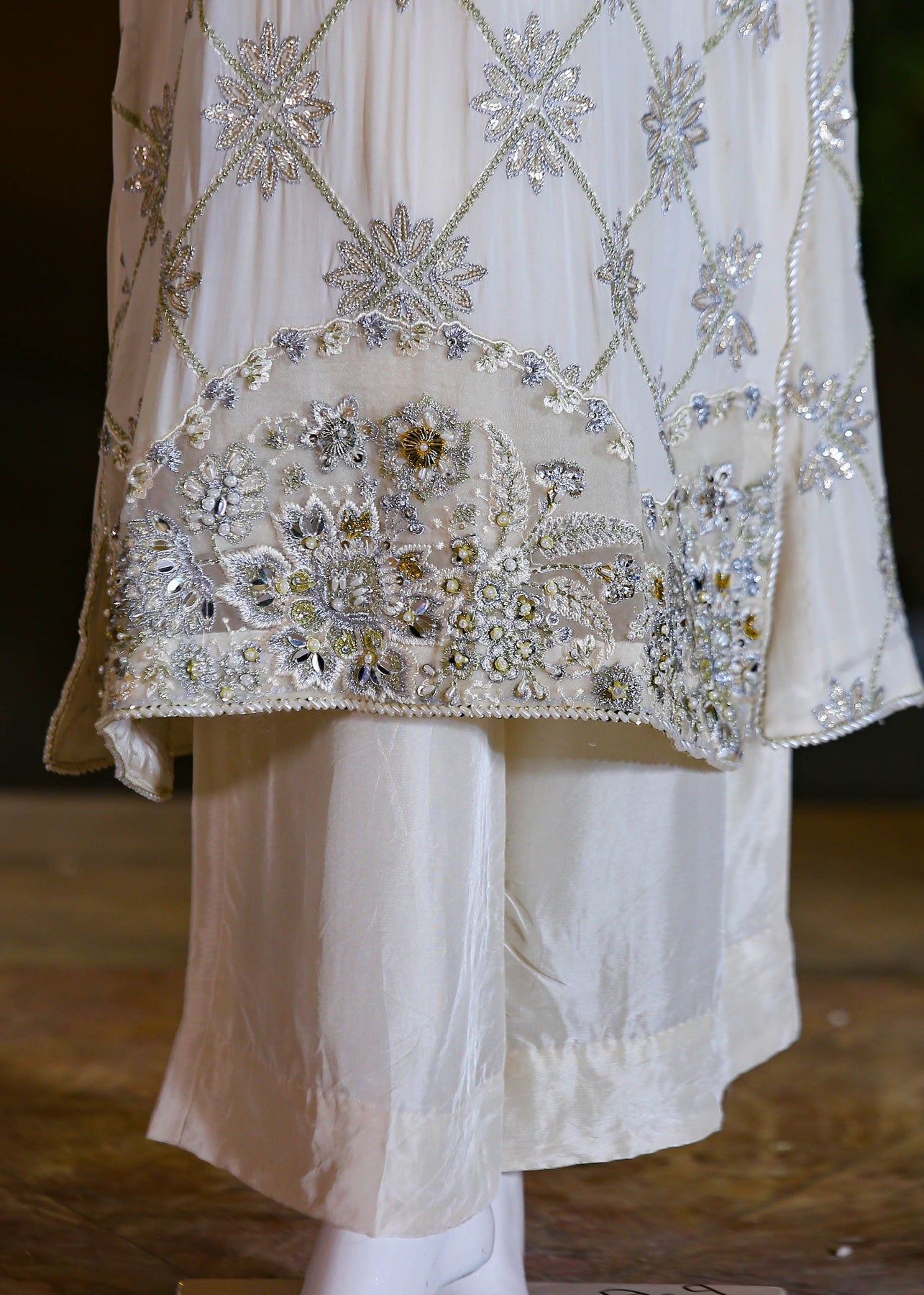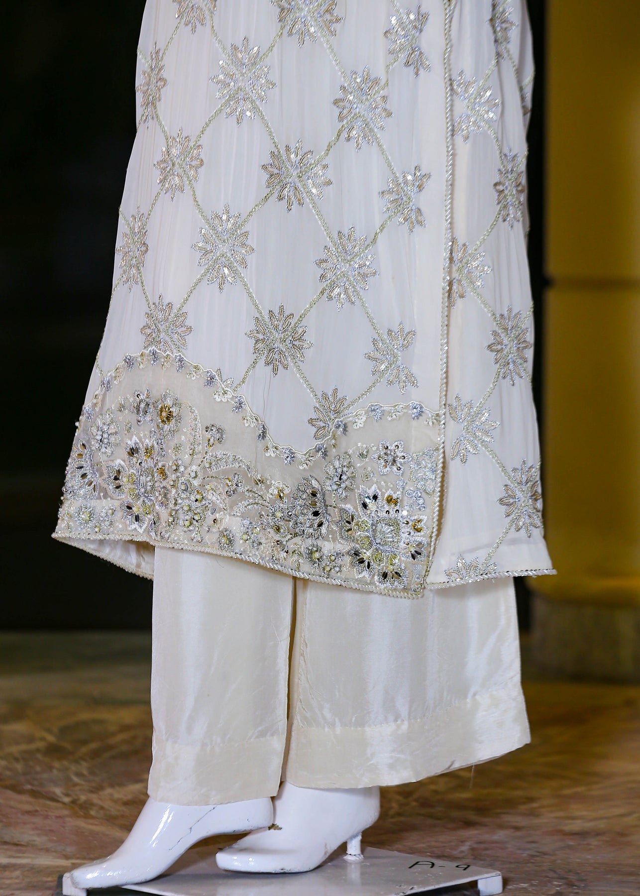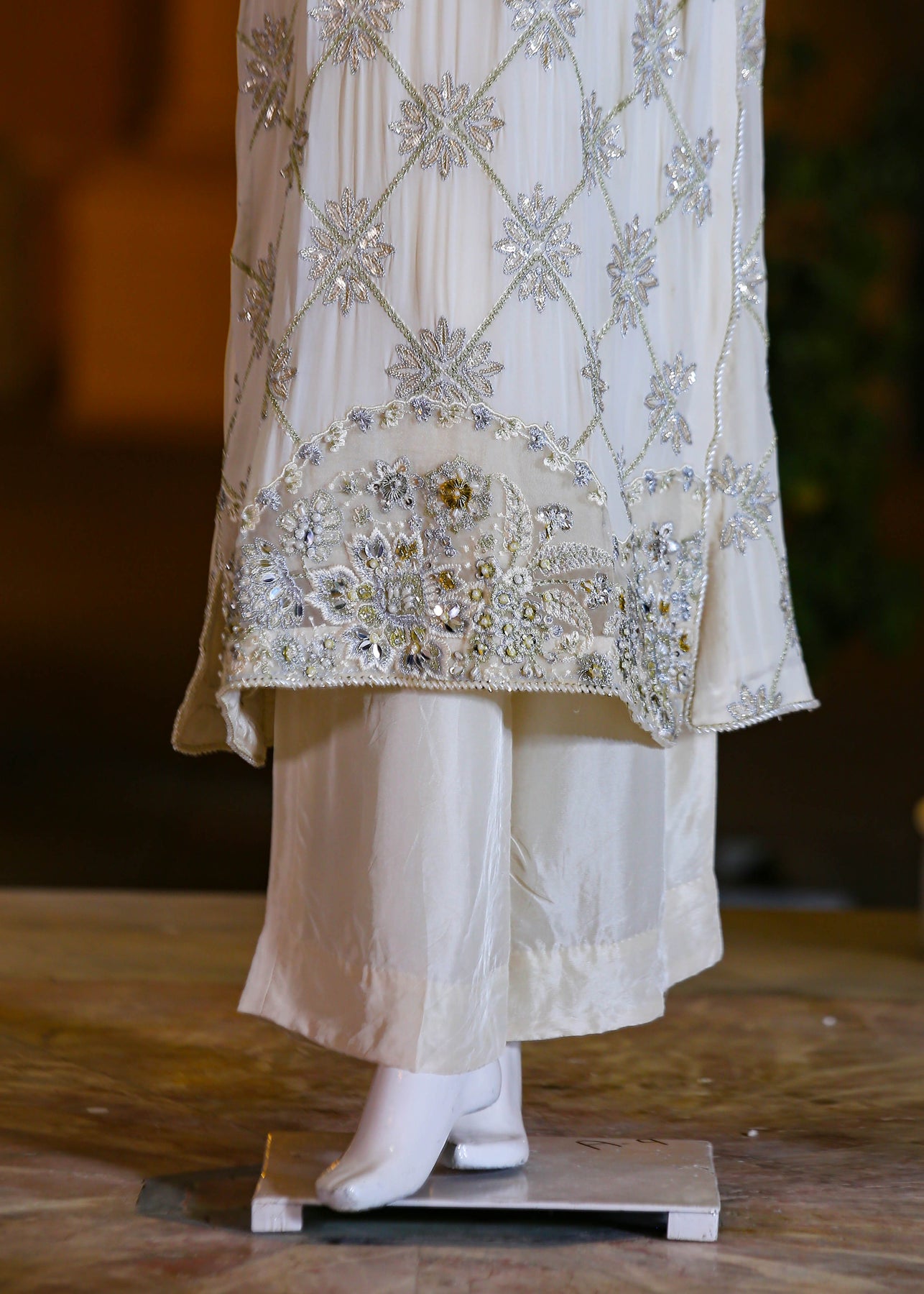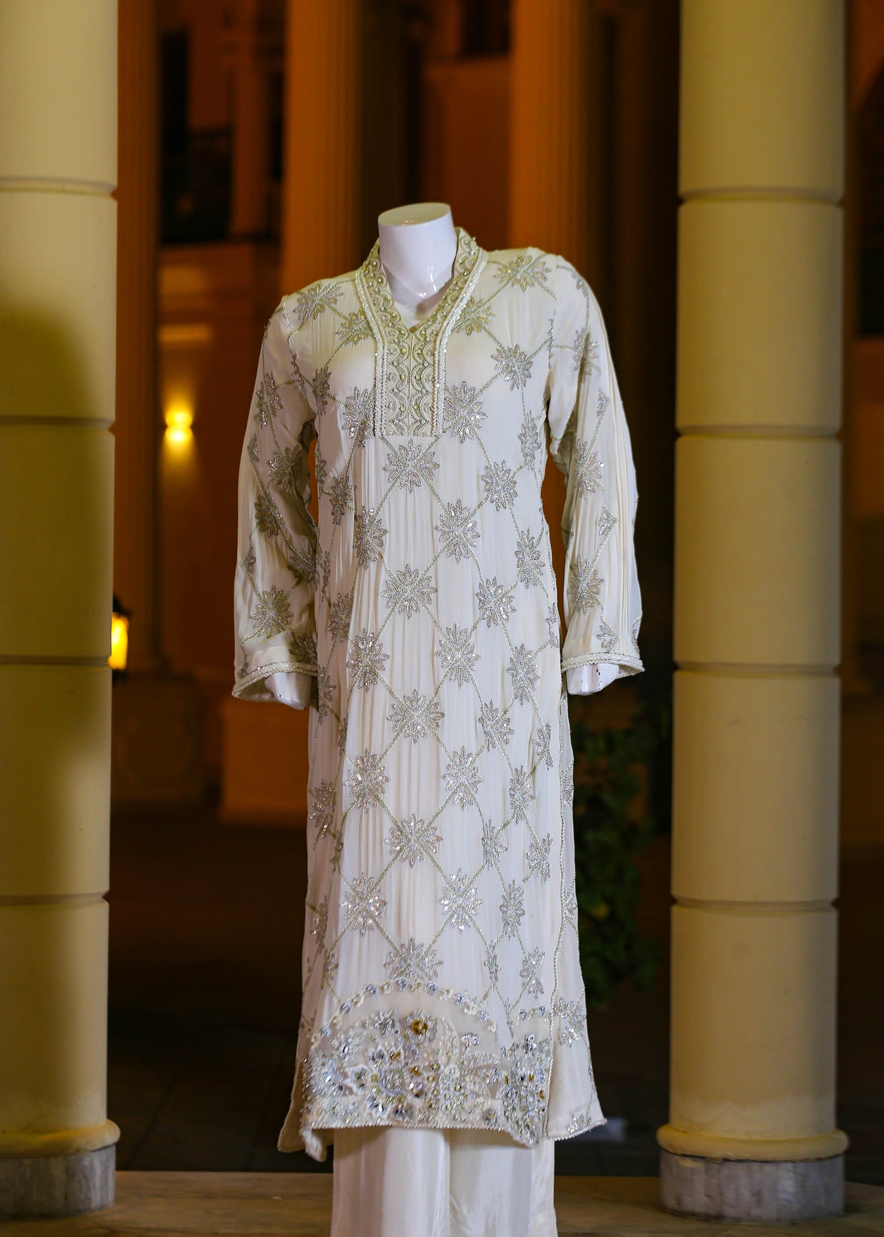 Step into timeless elegance with this 2-piece off-white ensemble from Rawah. The chiffon shirt is adorned with intricate thread, sitara, stone, and pearl embroidery, enhanced with delicate lace detailing, offering a luxurious and sophisticated look.