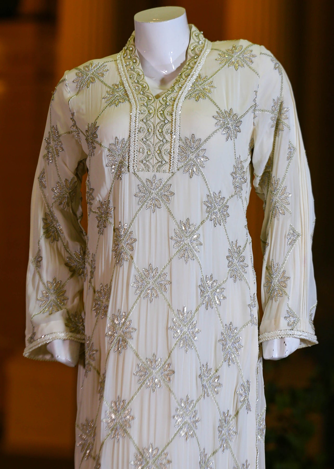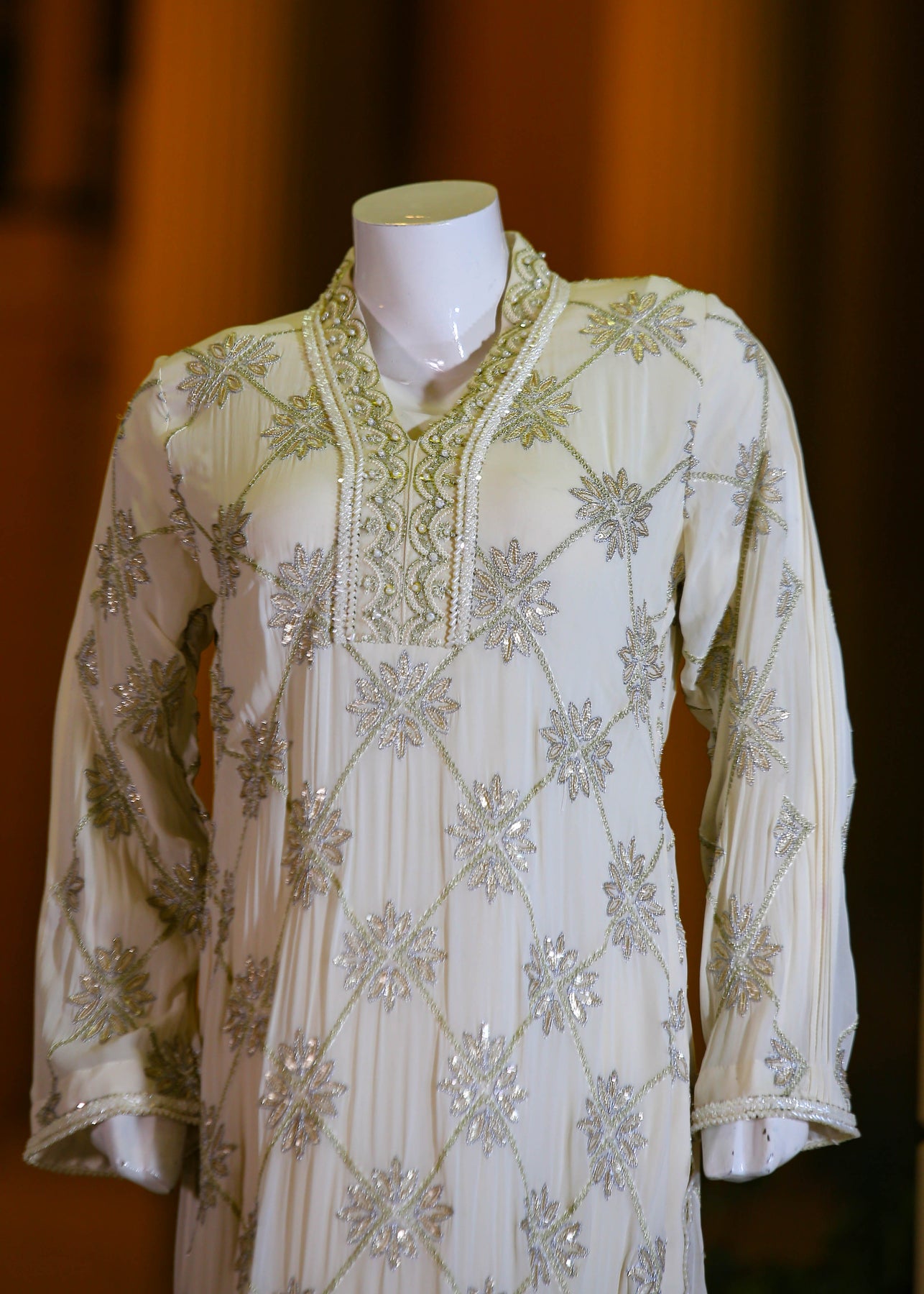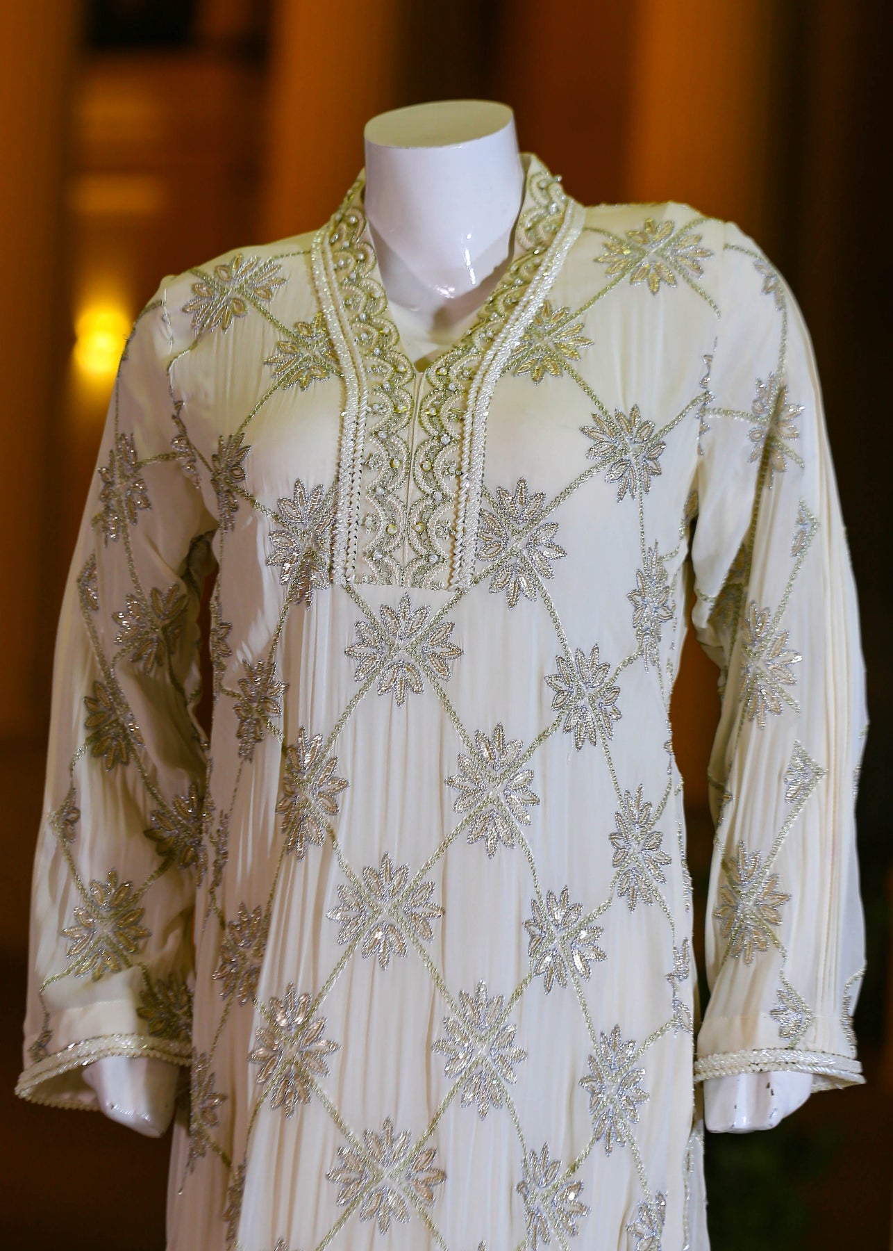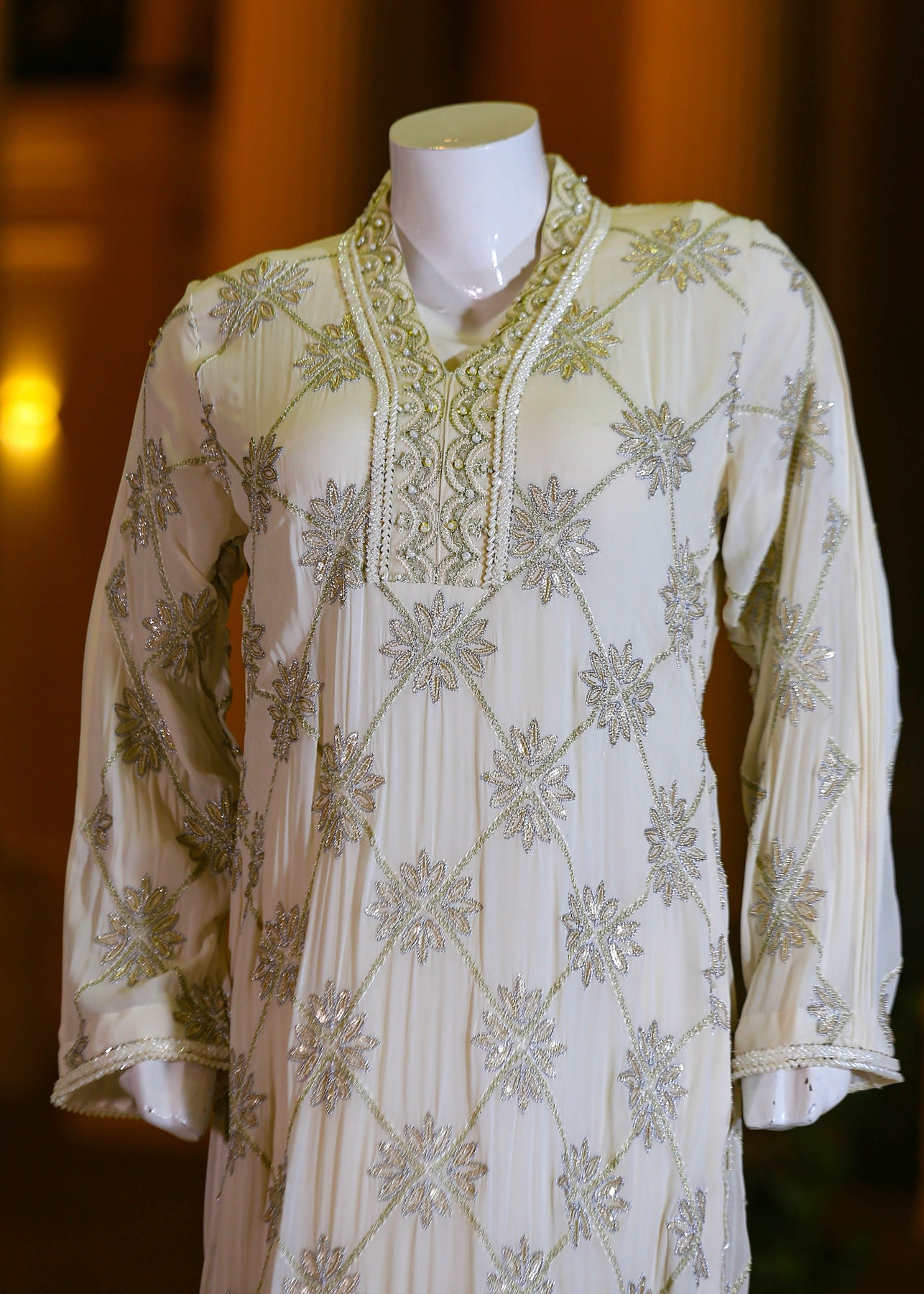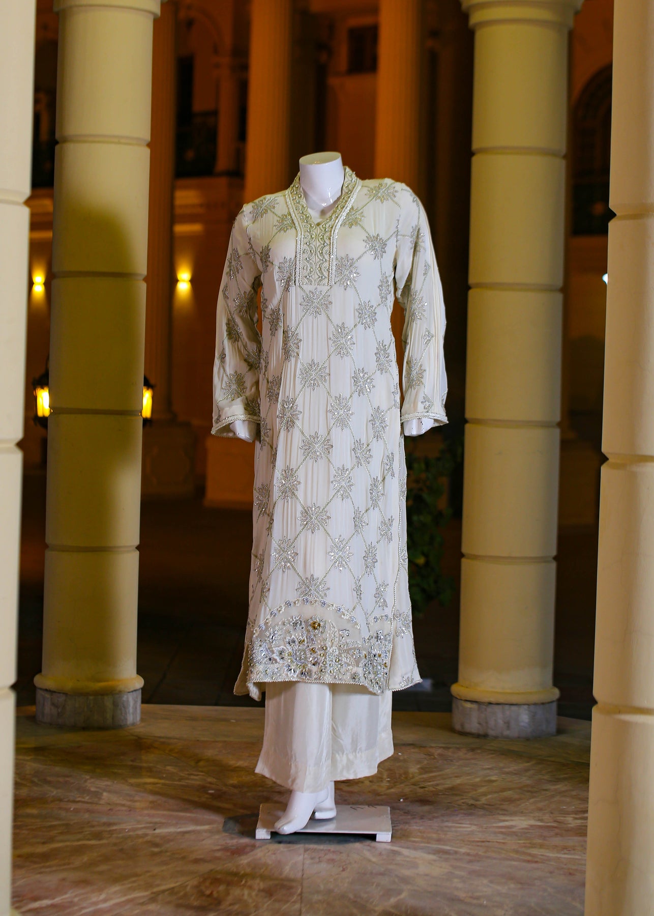 Step into timeless elegance with this 2-piece off-white ensemble from Rawah. The chiffon shirt is adorned with intricate thread, sitara, stone, and pearl embroidery, enhanced with delicate lace detailing, offering a luxurious and sophisticated look.