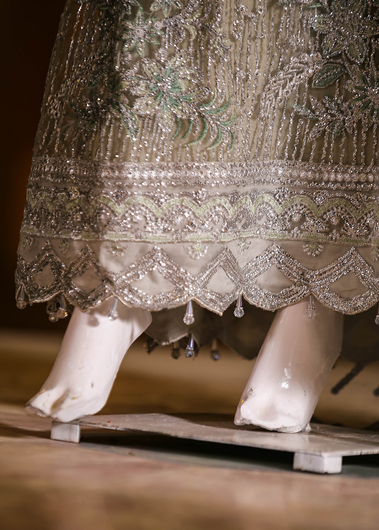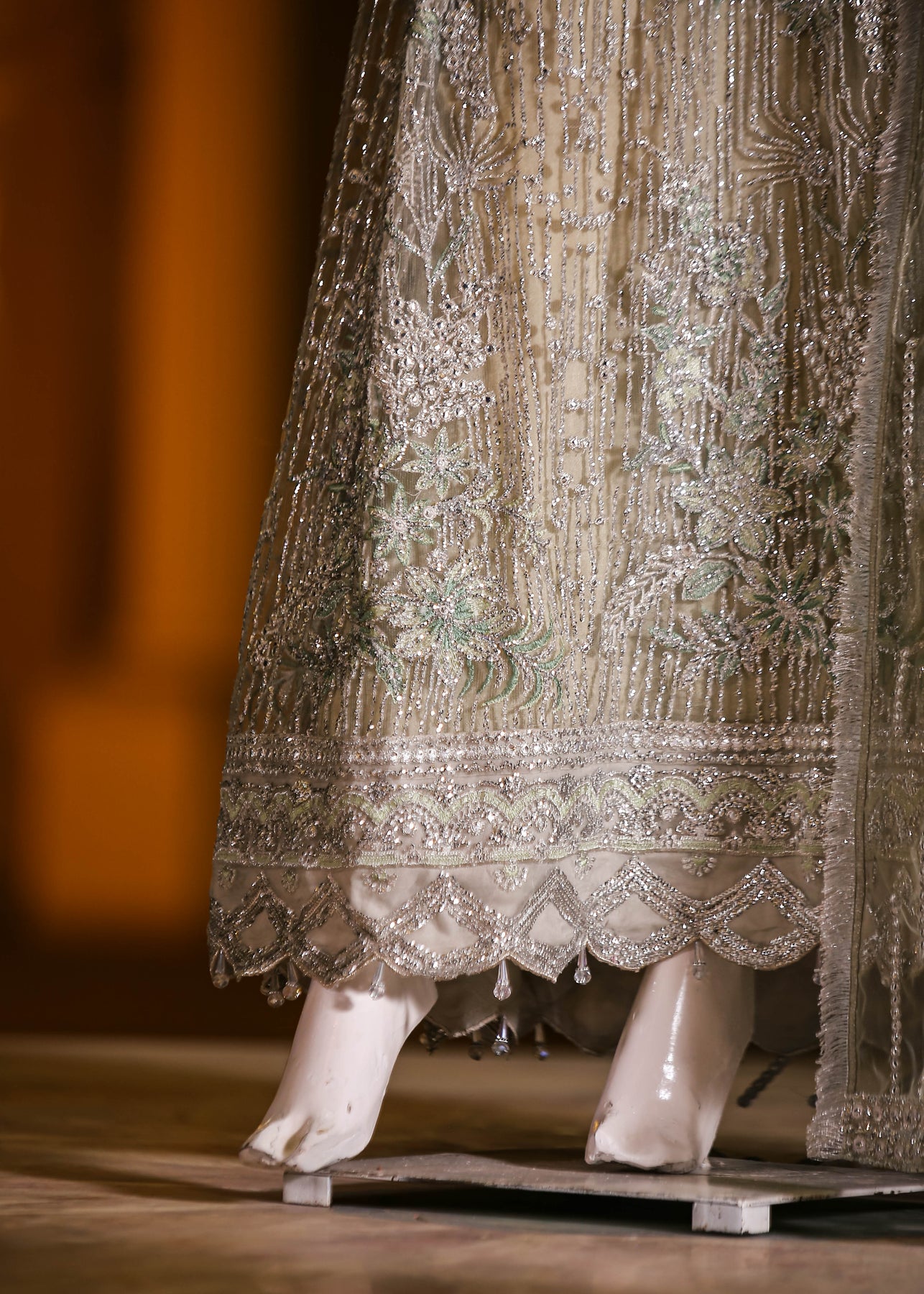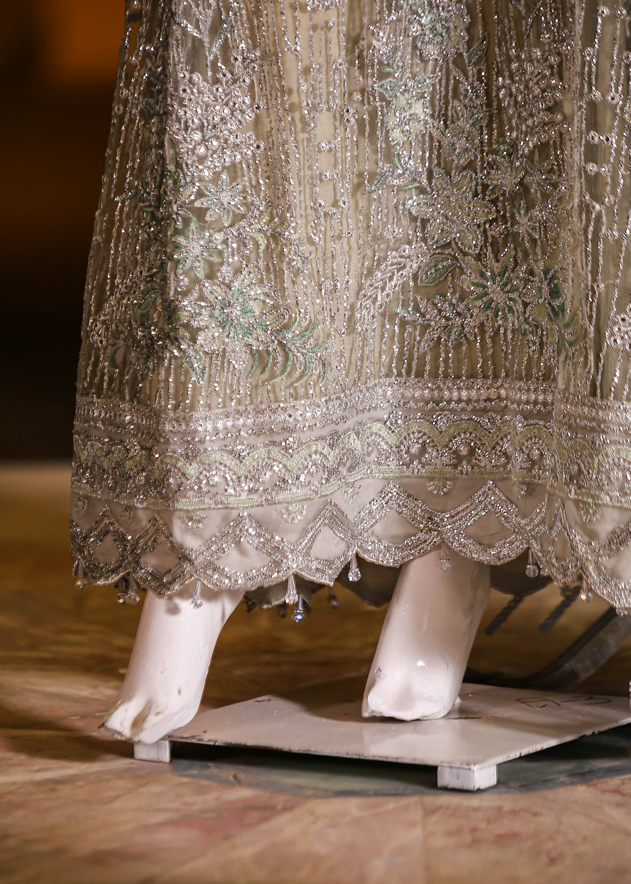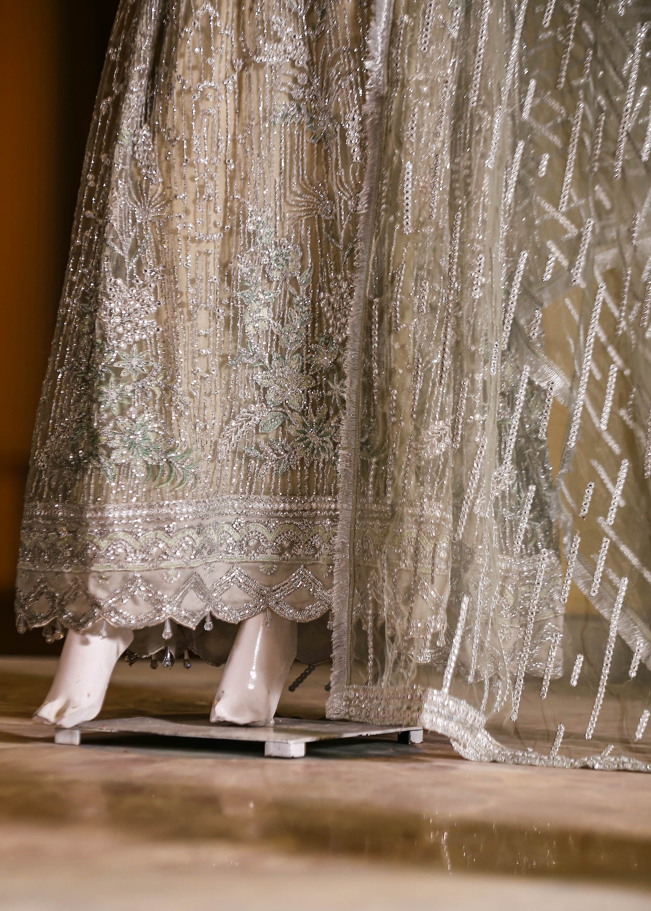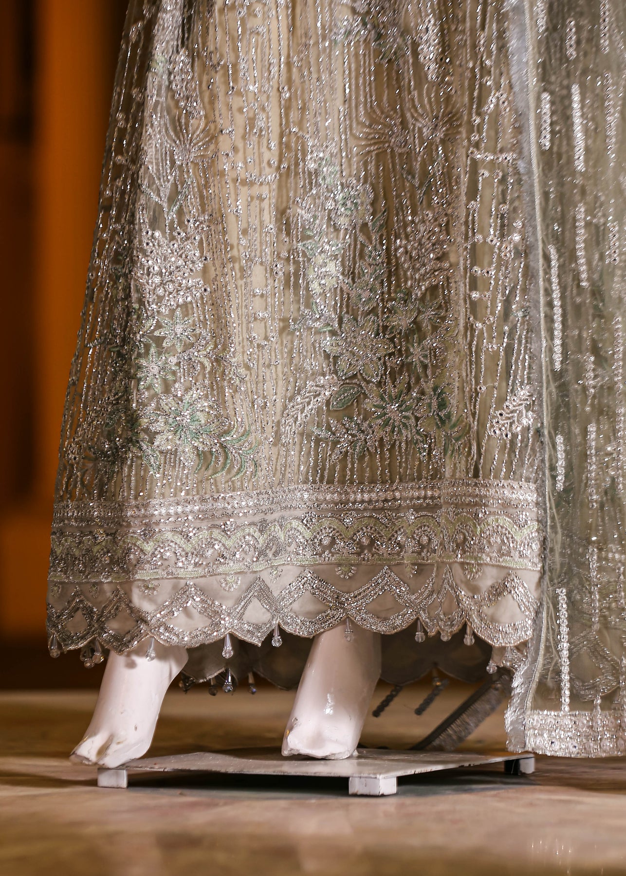 🧵 Shirt Fabric: Net (embroidered with thread, sequins, stones, 3D flowers, embossed panni & cutwork + latkans)