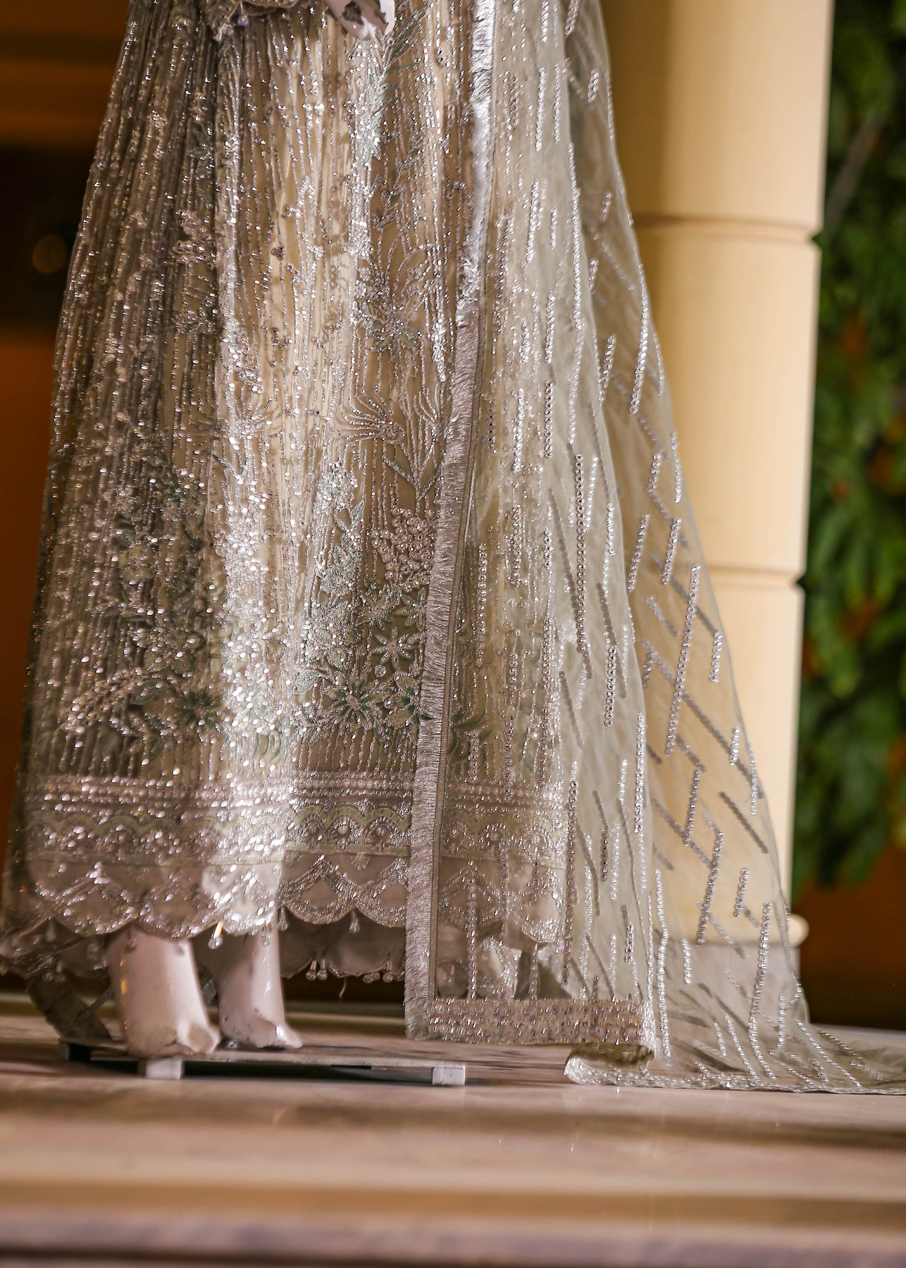 The net dupatta complements the outfit with embroidered thread, sequins, and panni work, adding a delicate and graceful flow to the ensemble.