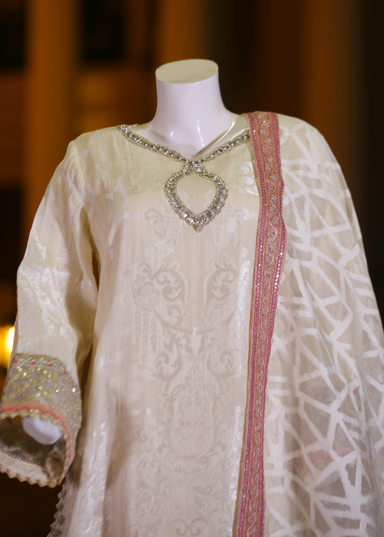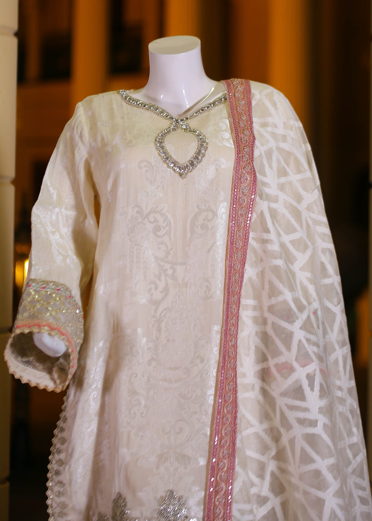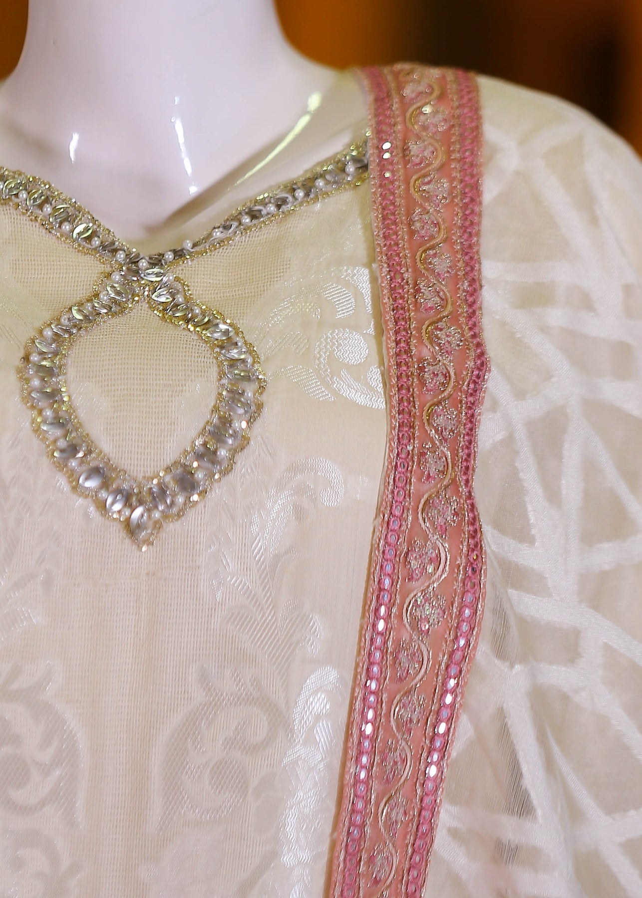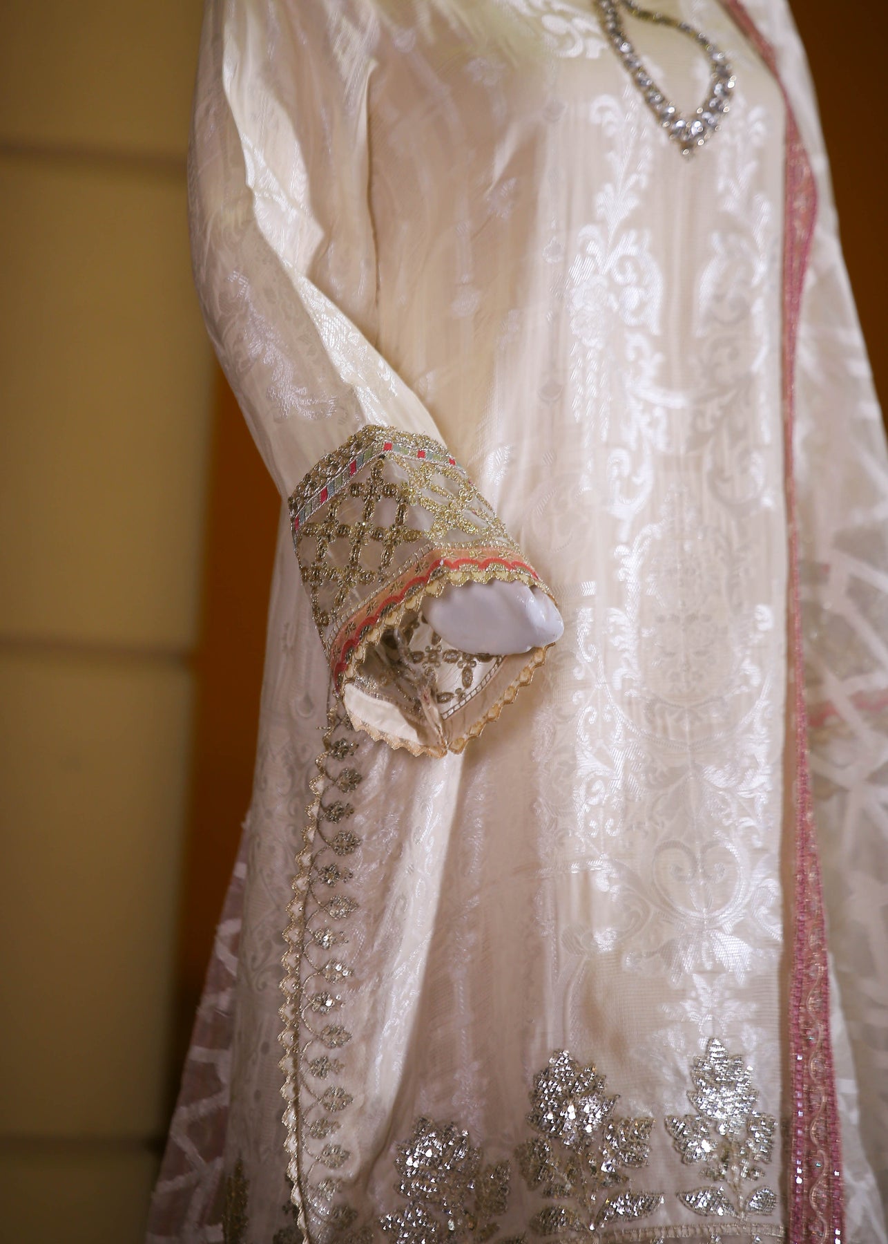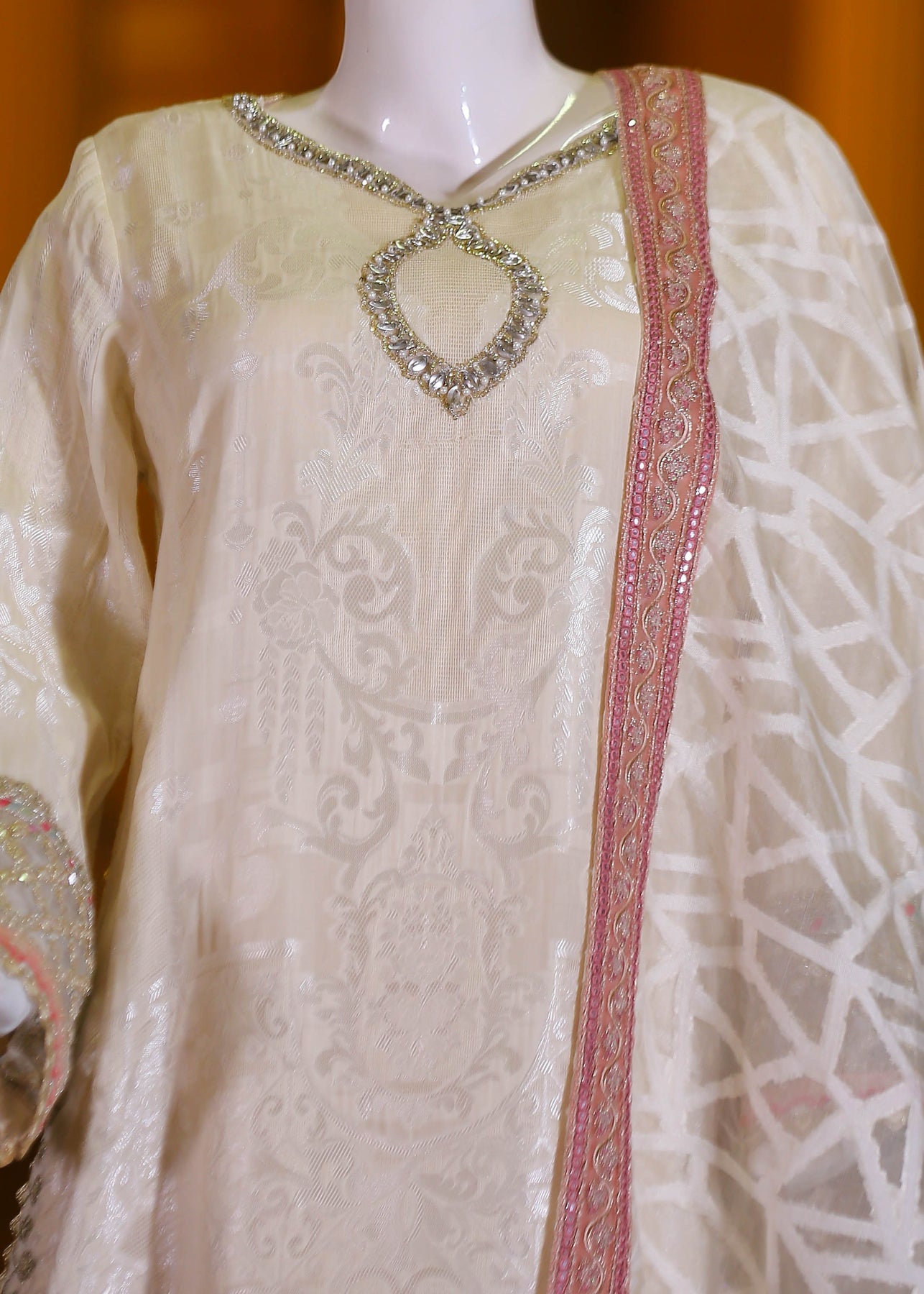 🧵 Shirt Fabric: Silk Jacquard (embroidered with thread, sequence, pearl & stone hand embellishment)