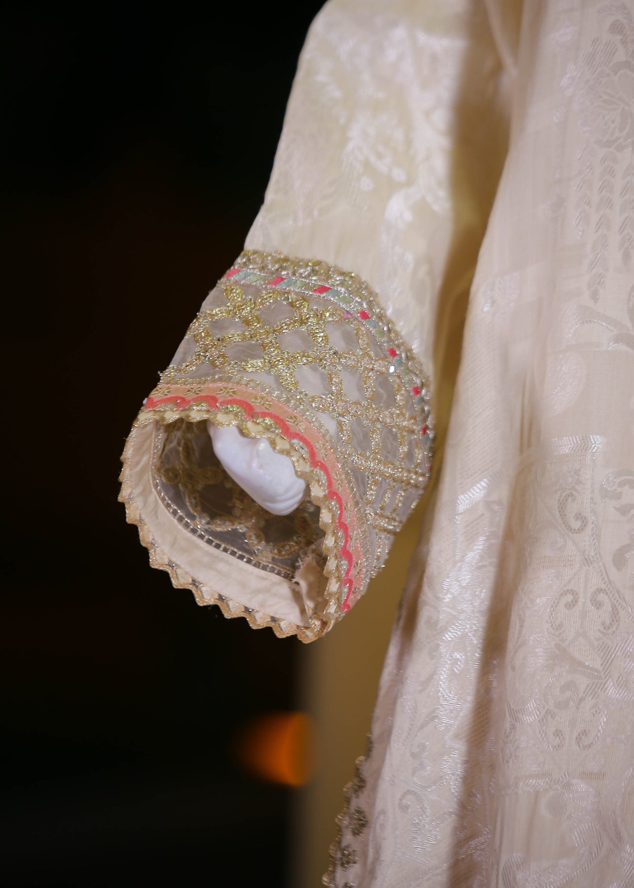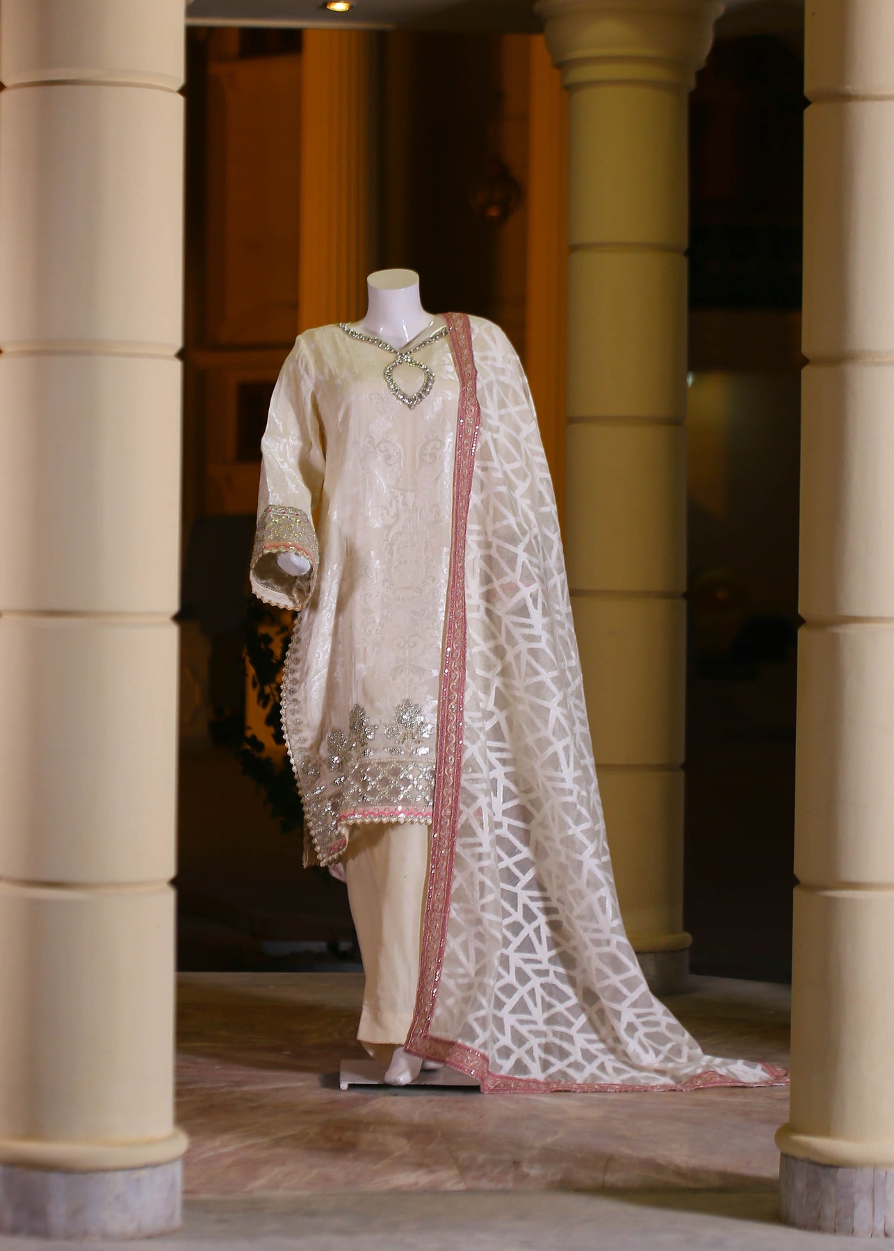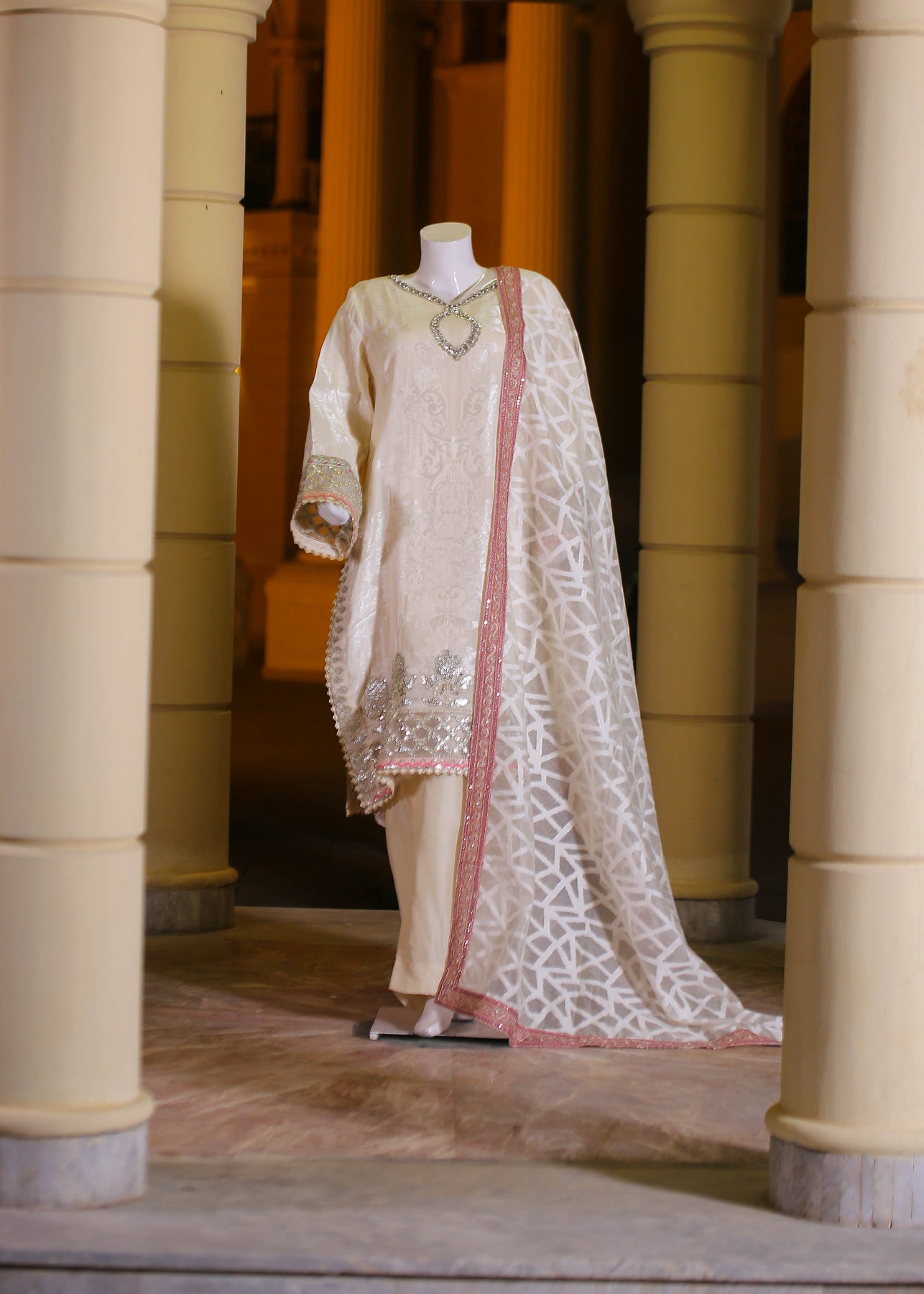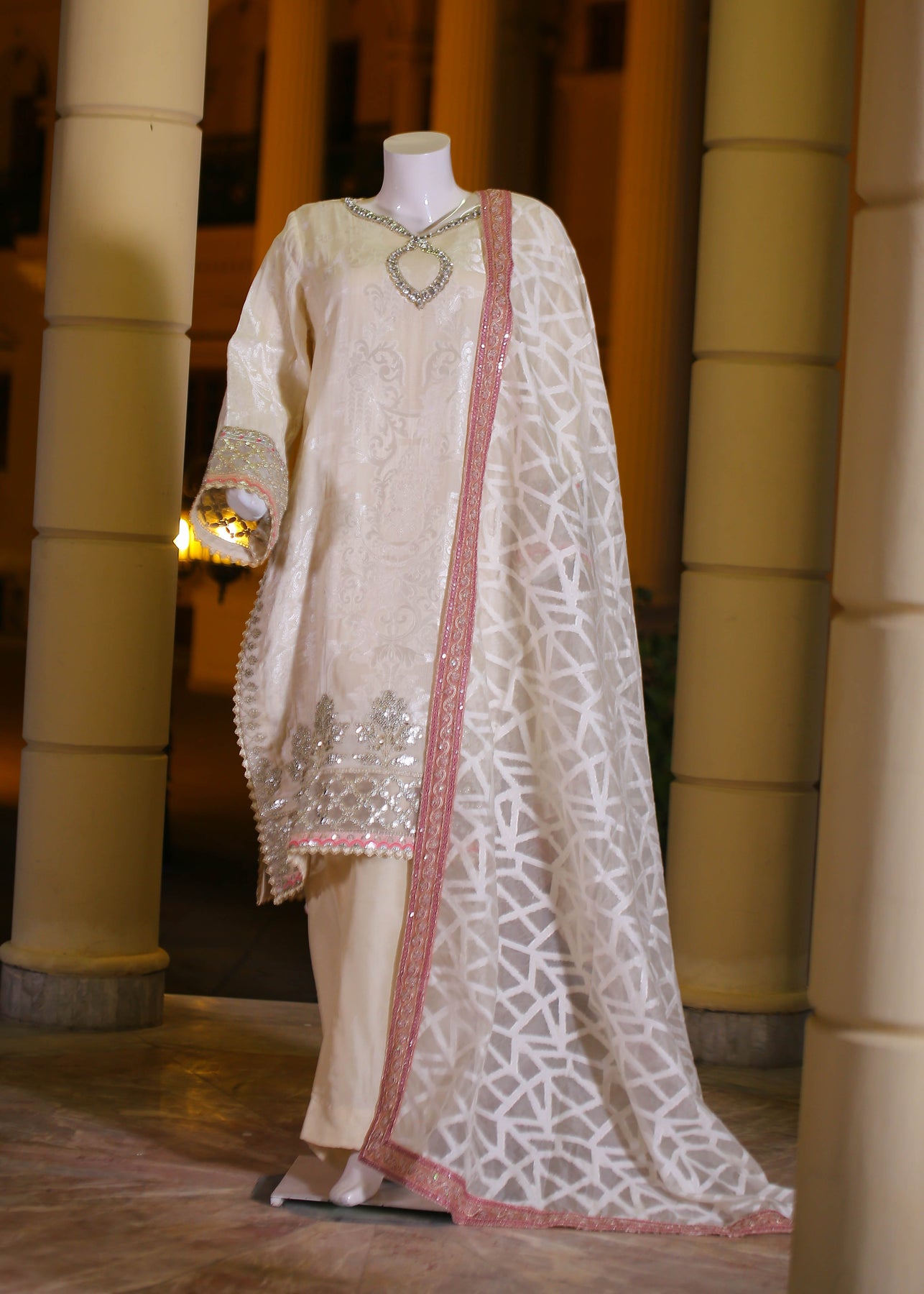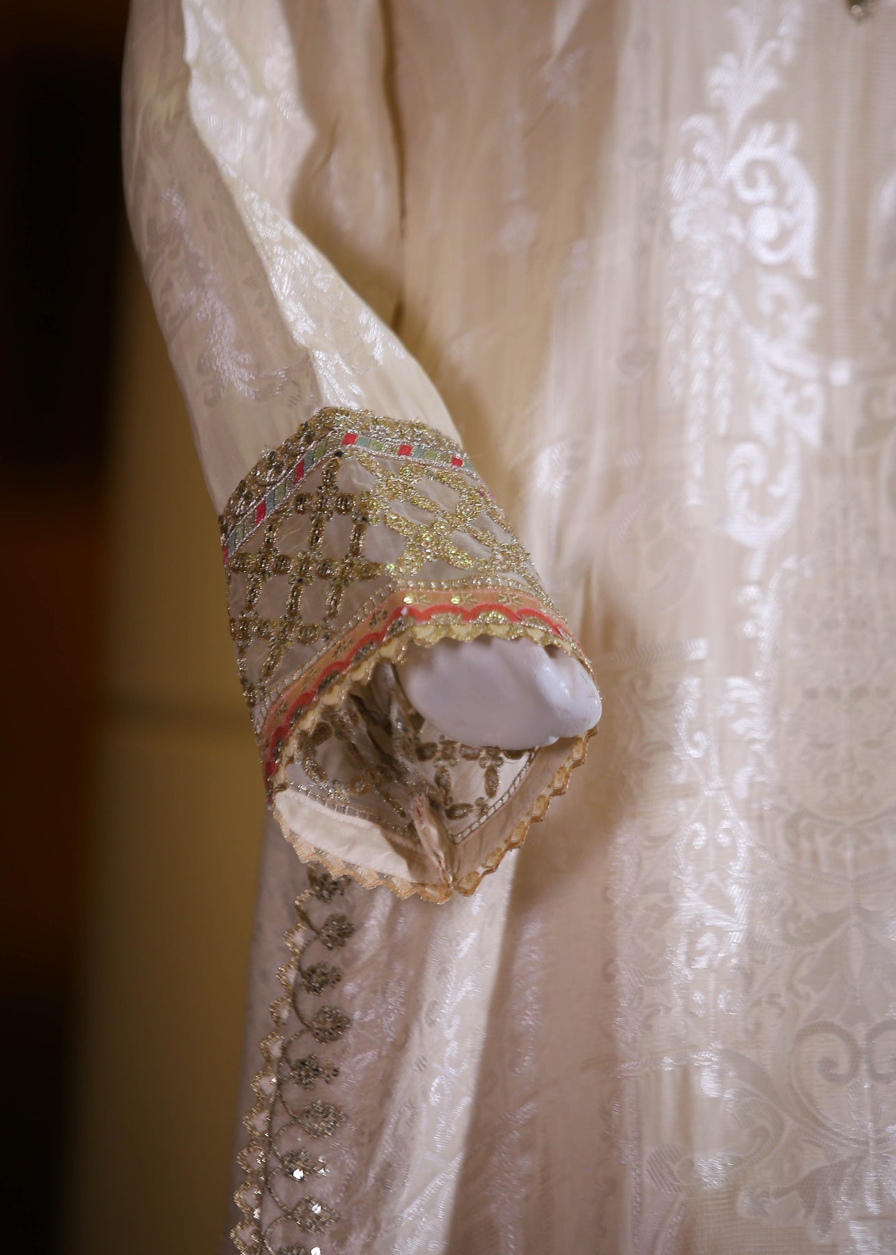 🧵 Shirt Fabric: Silk Jacquard (embroidered with thread, sequence, pearl & stone hand embellishment)