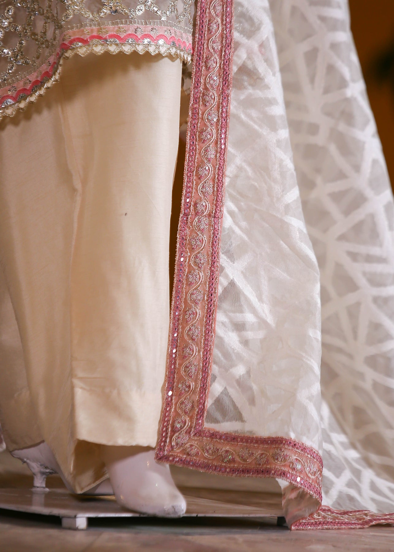 Paired with plain silk trousers for a sleek silhouette, the outfit is completed with a self-pattern silk jacquard dupatta featuring thread and sequence embroidery, adding a graceful and refined touch.