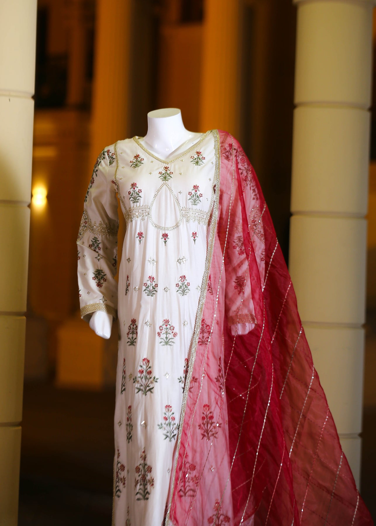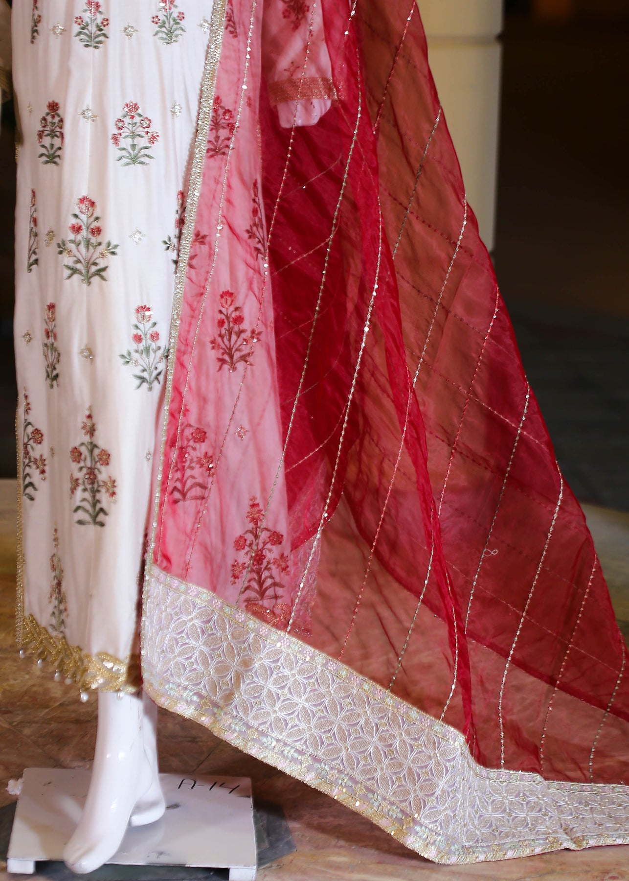 Paired with a plain sateen trouser in plazo style, the outfit maintains a sleek and polished silhouette, while the embroidered organza dupatta adds a soft, flowing touch to complete the look.