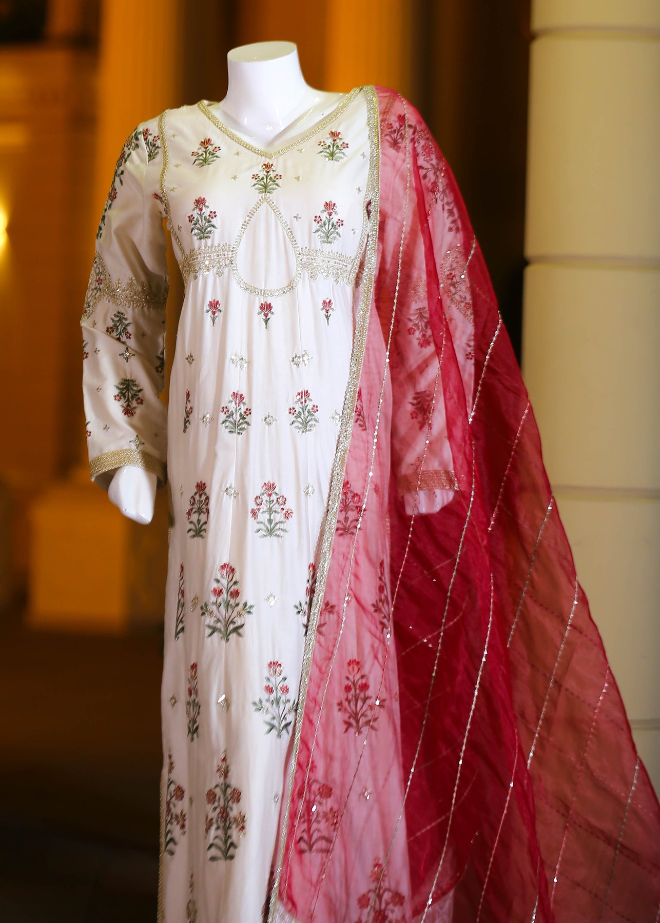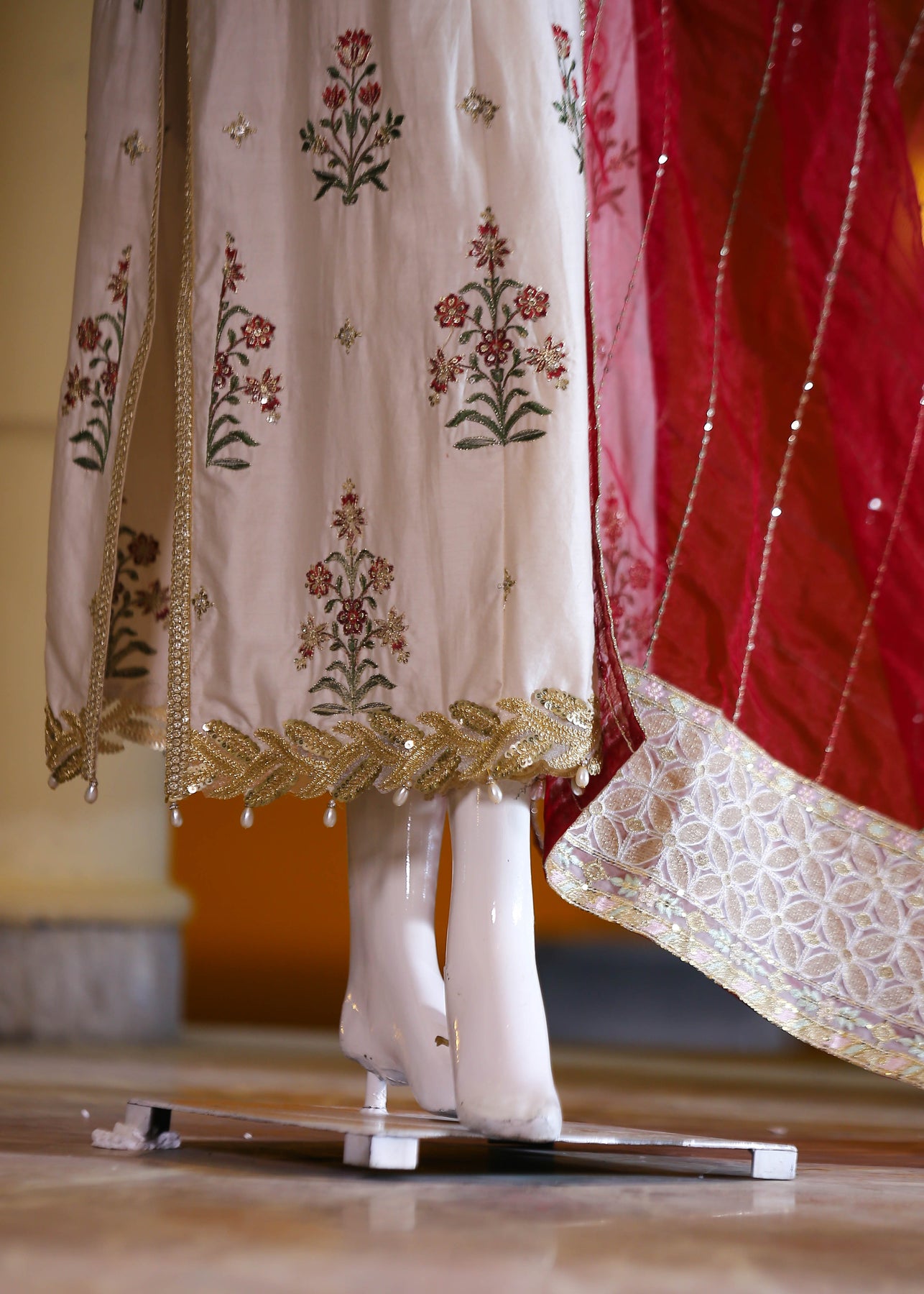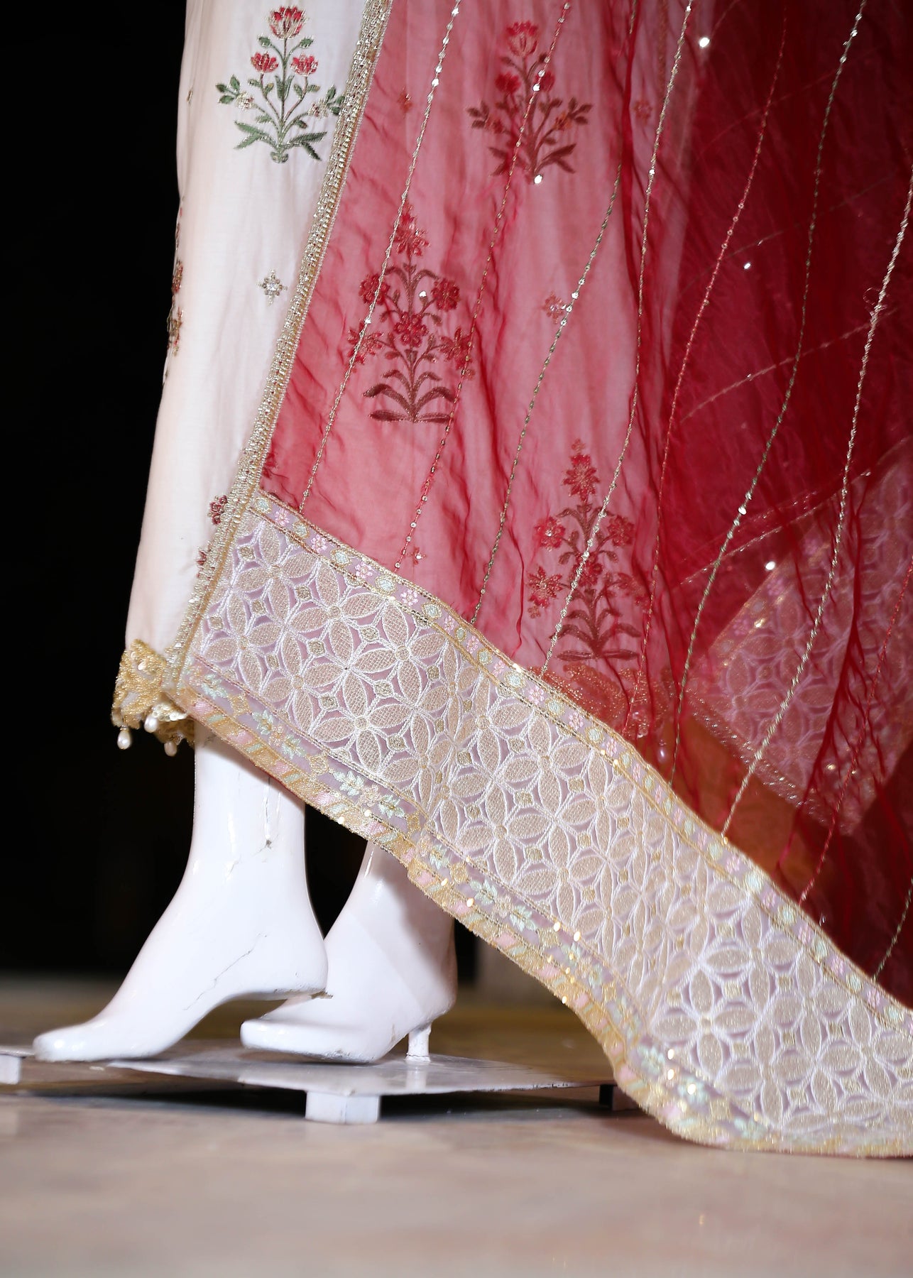 Step into timeless elegance with this 3-piece light beige and maroon ensemble from Rawah. The long A-line sateen shirt is exquisitely adorned with thread and sequence embroidery, lace, and pearl latkens, creating a luxurious and festive appeal.