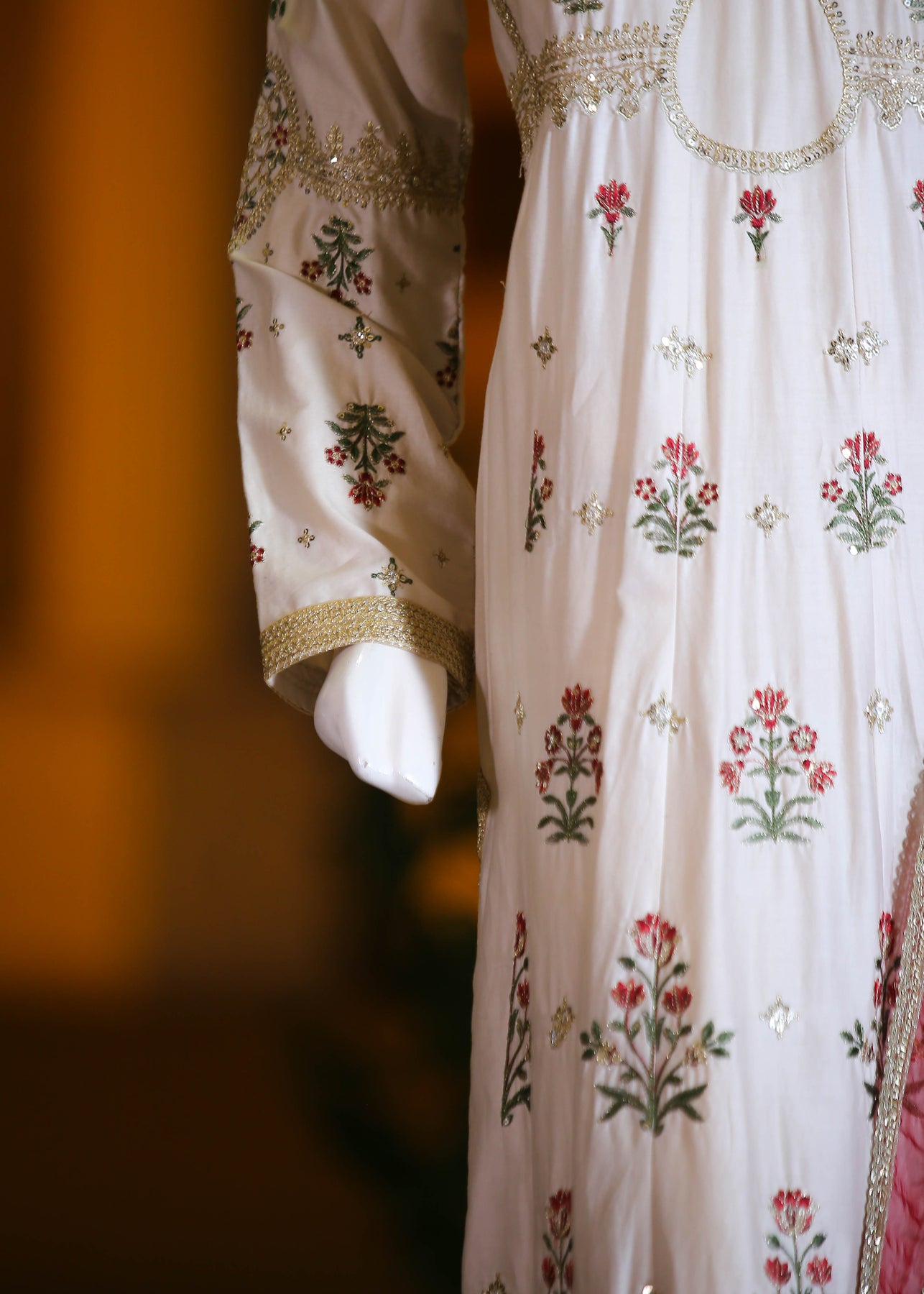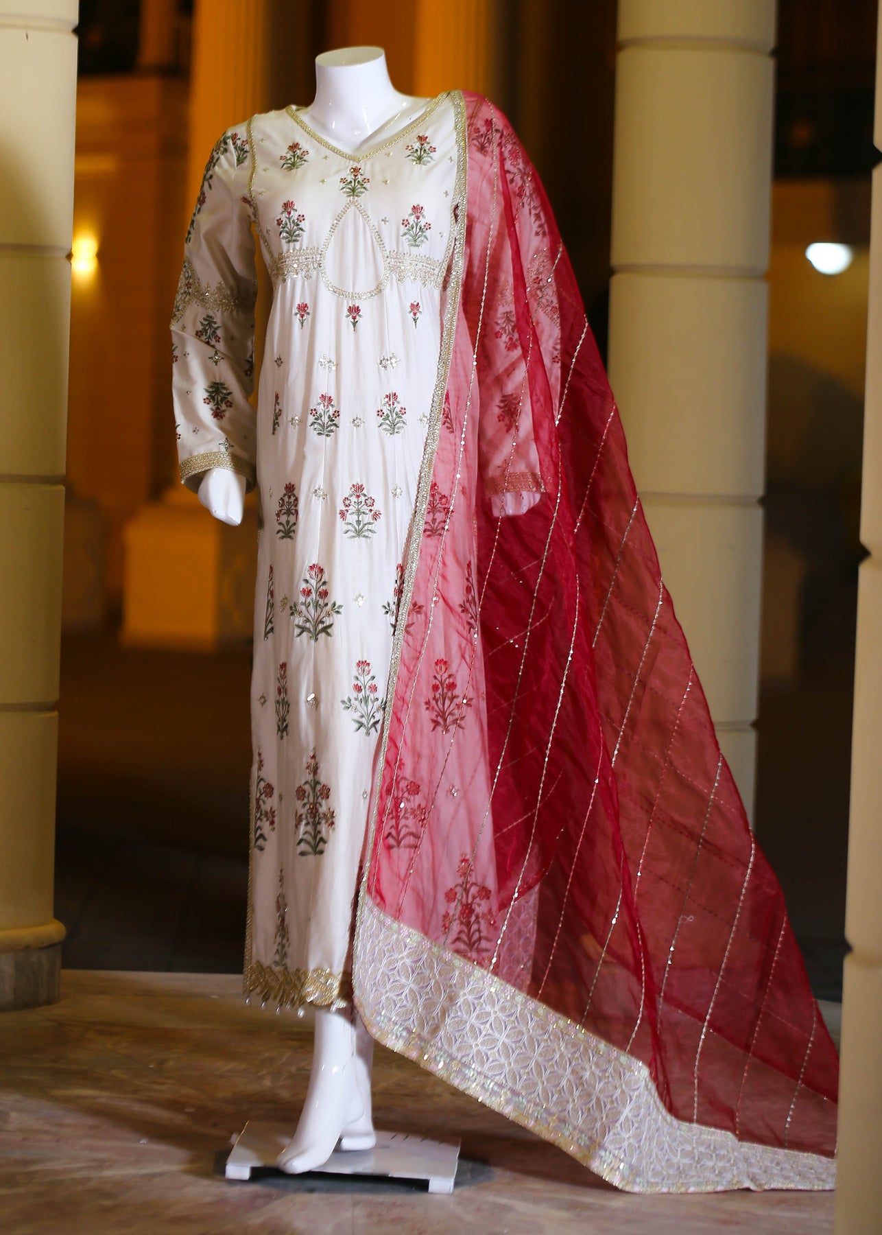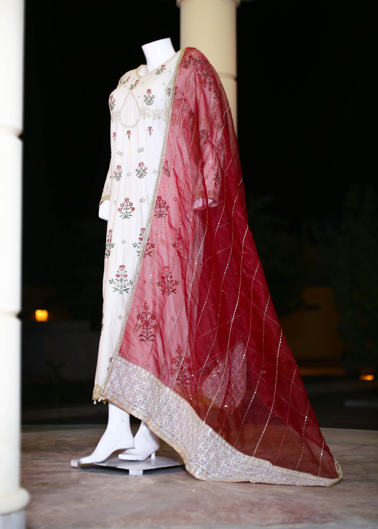 Step into timeless elegance with this 3-piece light beige and maroon ensemble from Rawah. The long A-line sateen shirt is exquisitely adorned with thread and sequence embroidery, lace, and pearl latkens, creating a luxurious and festive appeal.